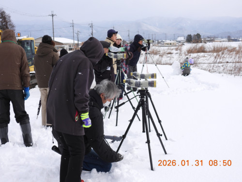 開会時には2羽のコハクチョウが飛び立ち最後になる。開会のあいさつも吹雪の中で、双眼鏡をうけとり「双眼鏡は覗けば見えるのではなく、