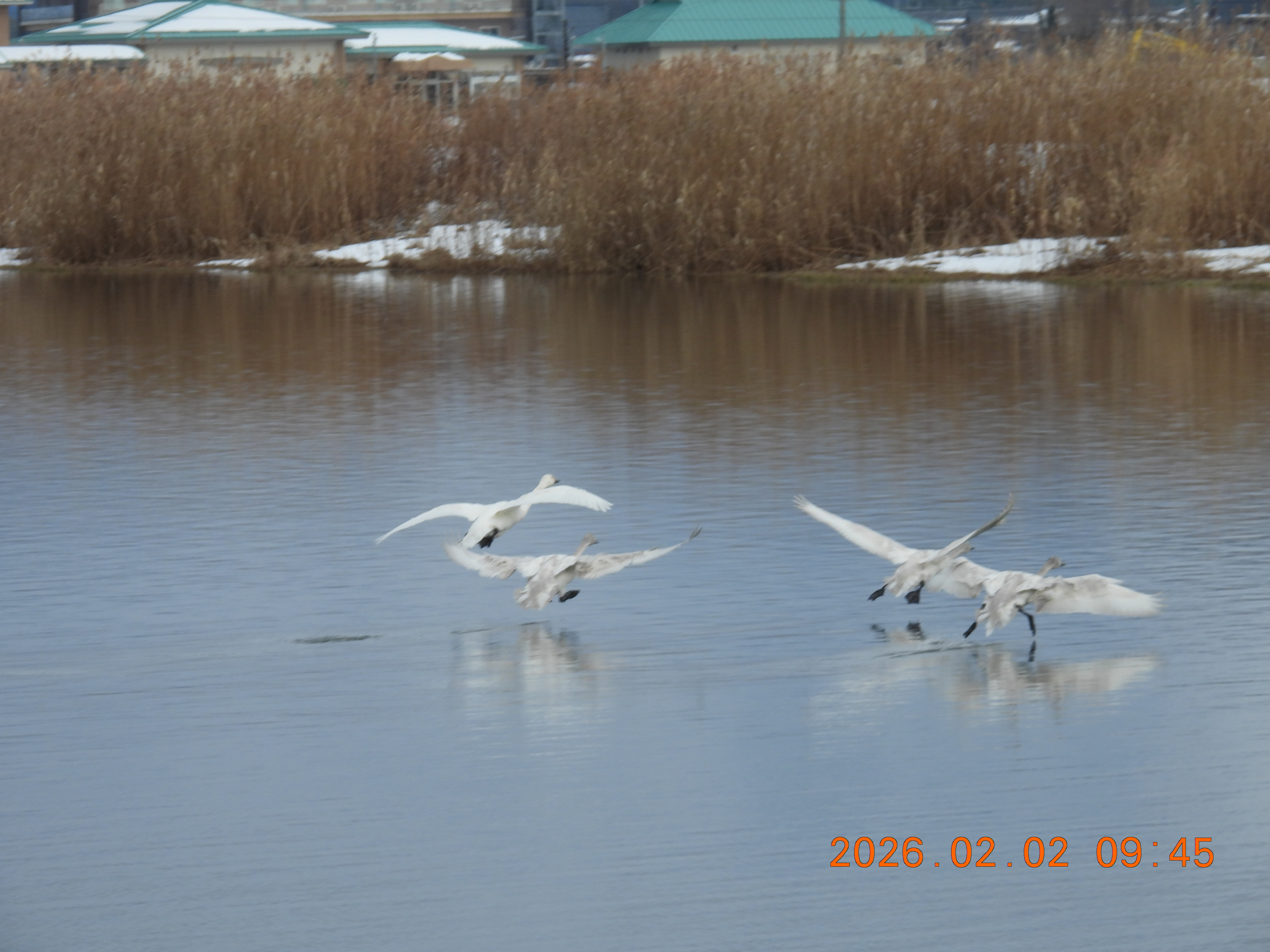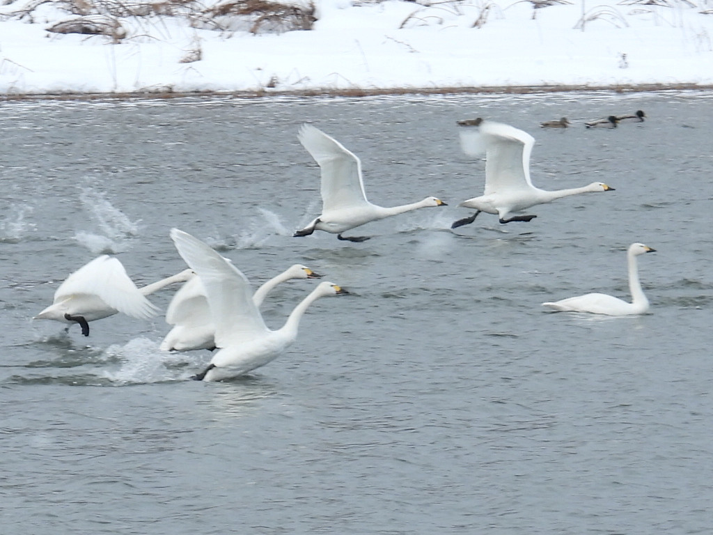 水面を走りながら飛び立っていくコハクチョウも見られました。