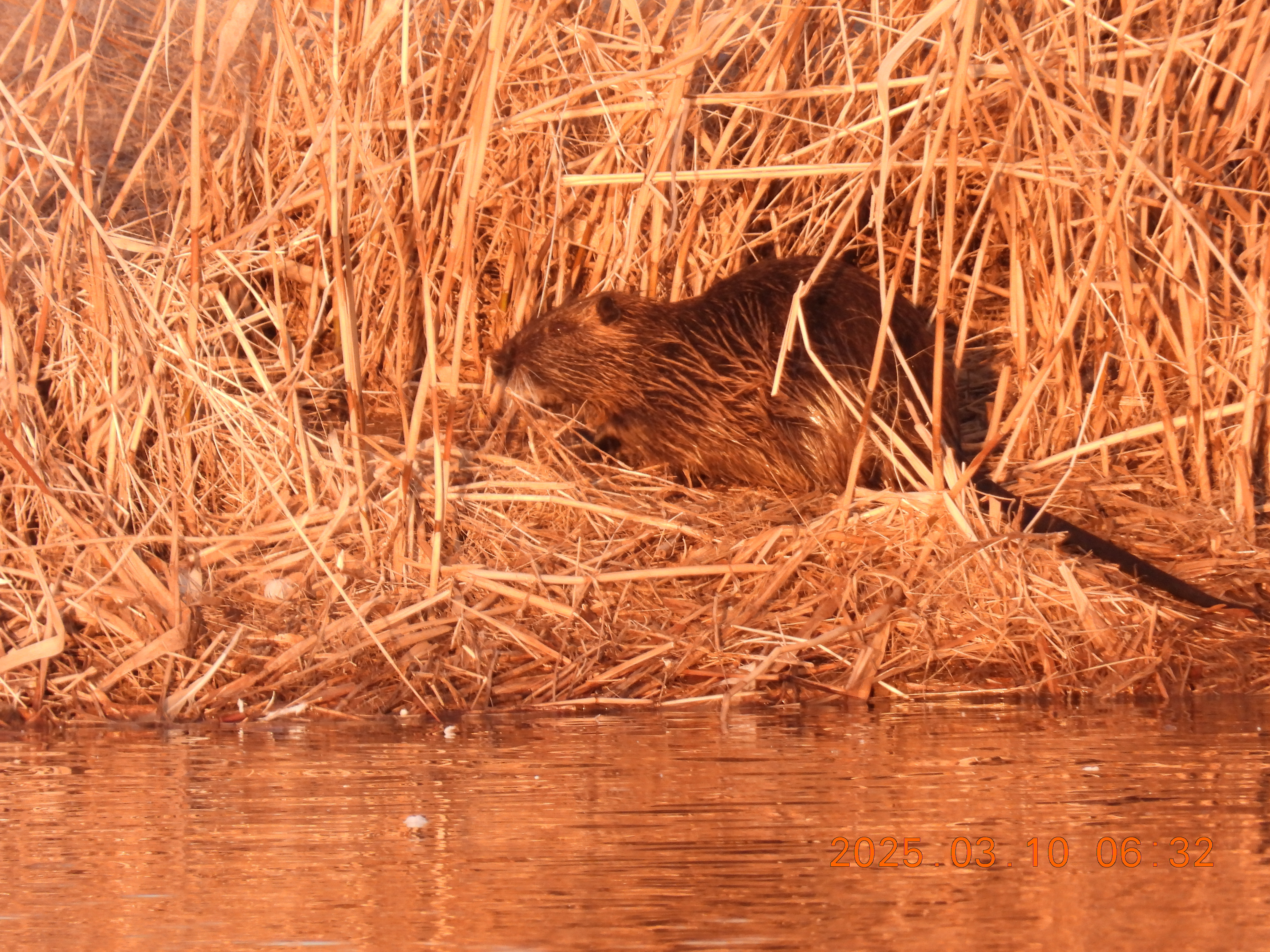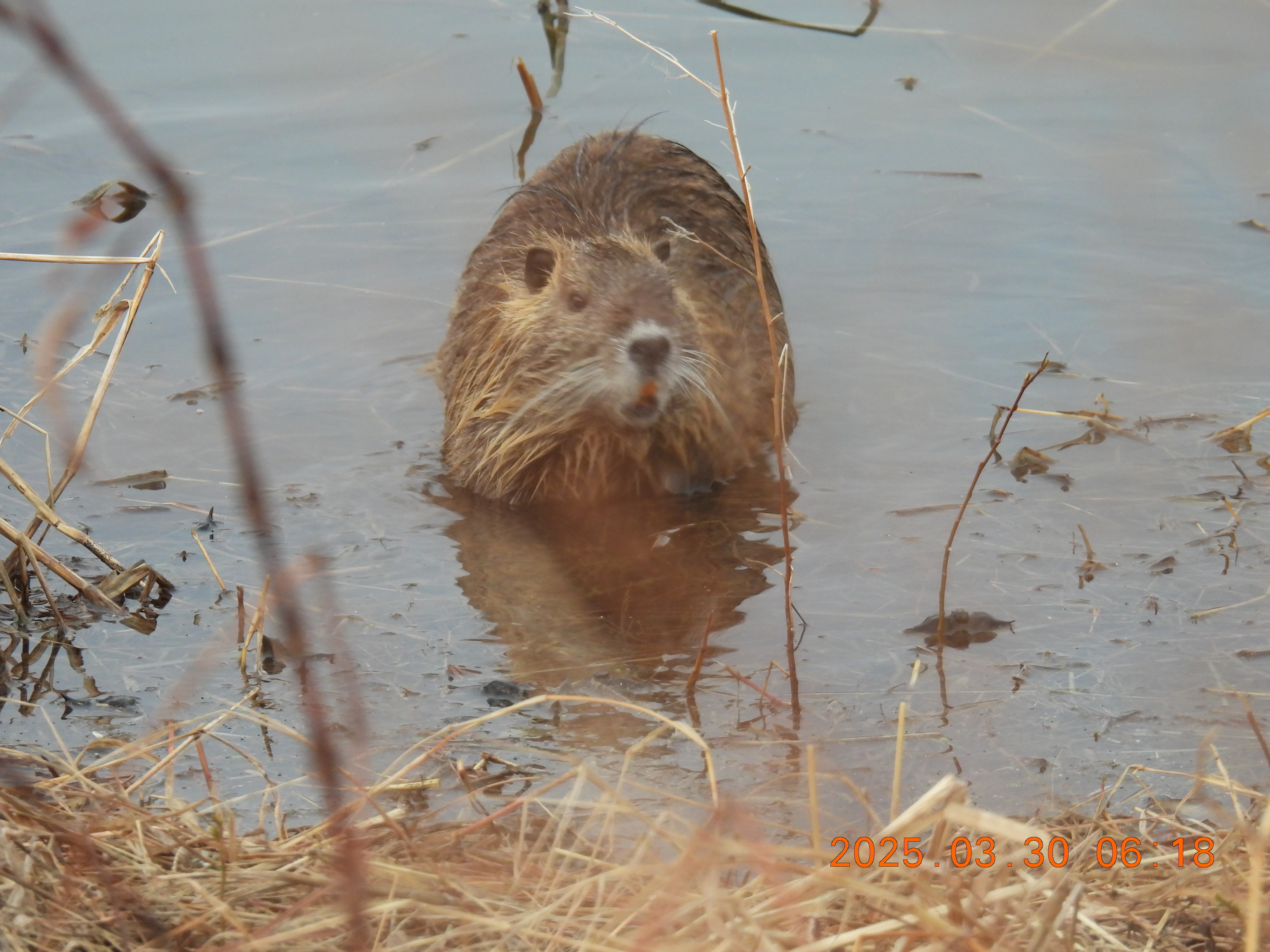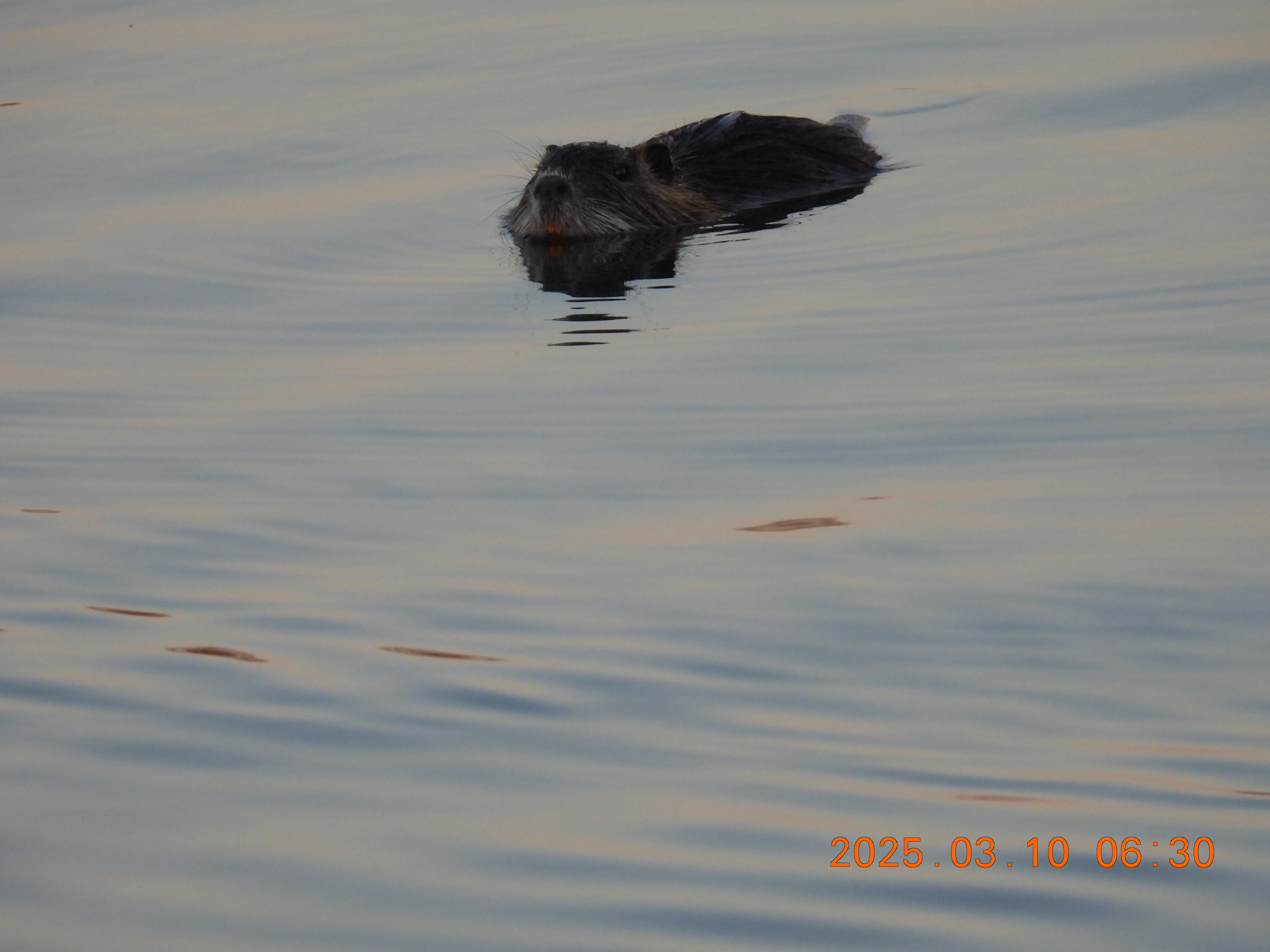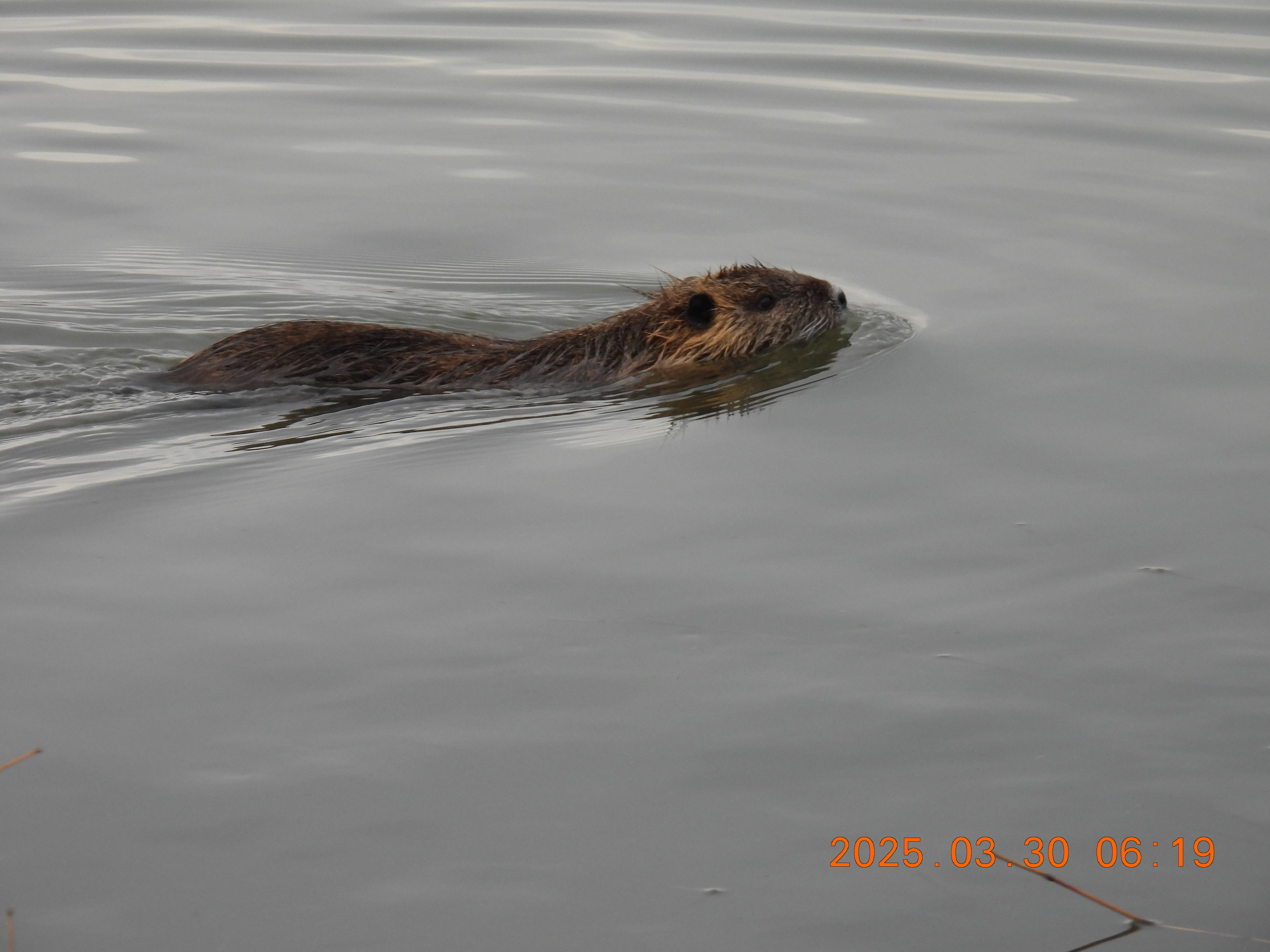 今朝も、ヌートリア泳いで岸に来ました。
