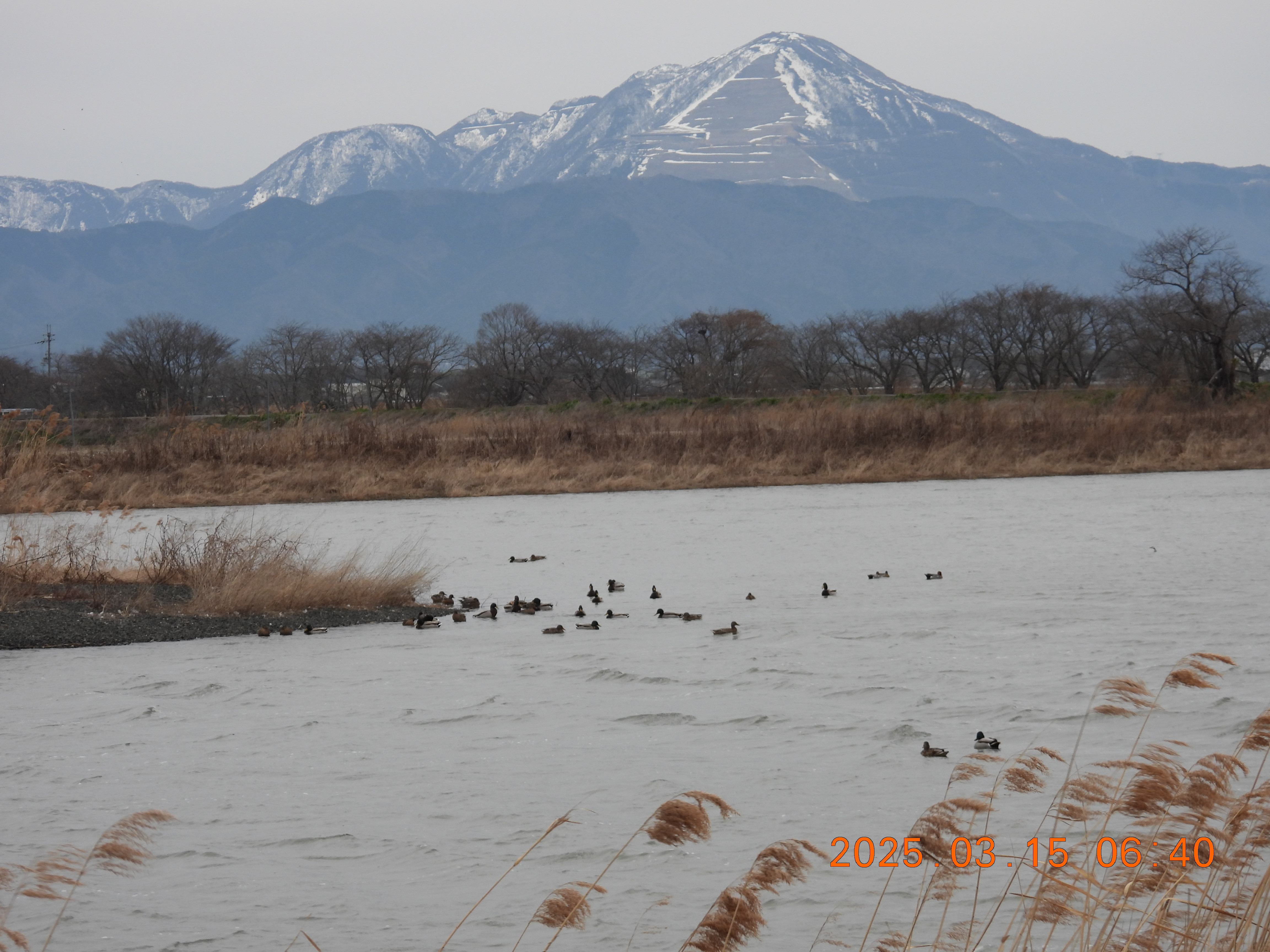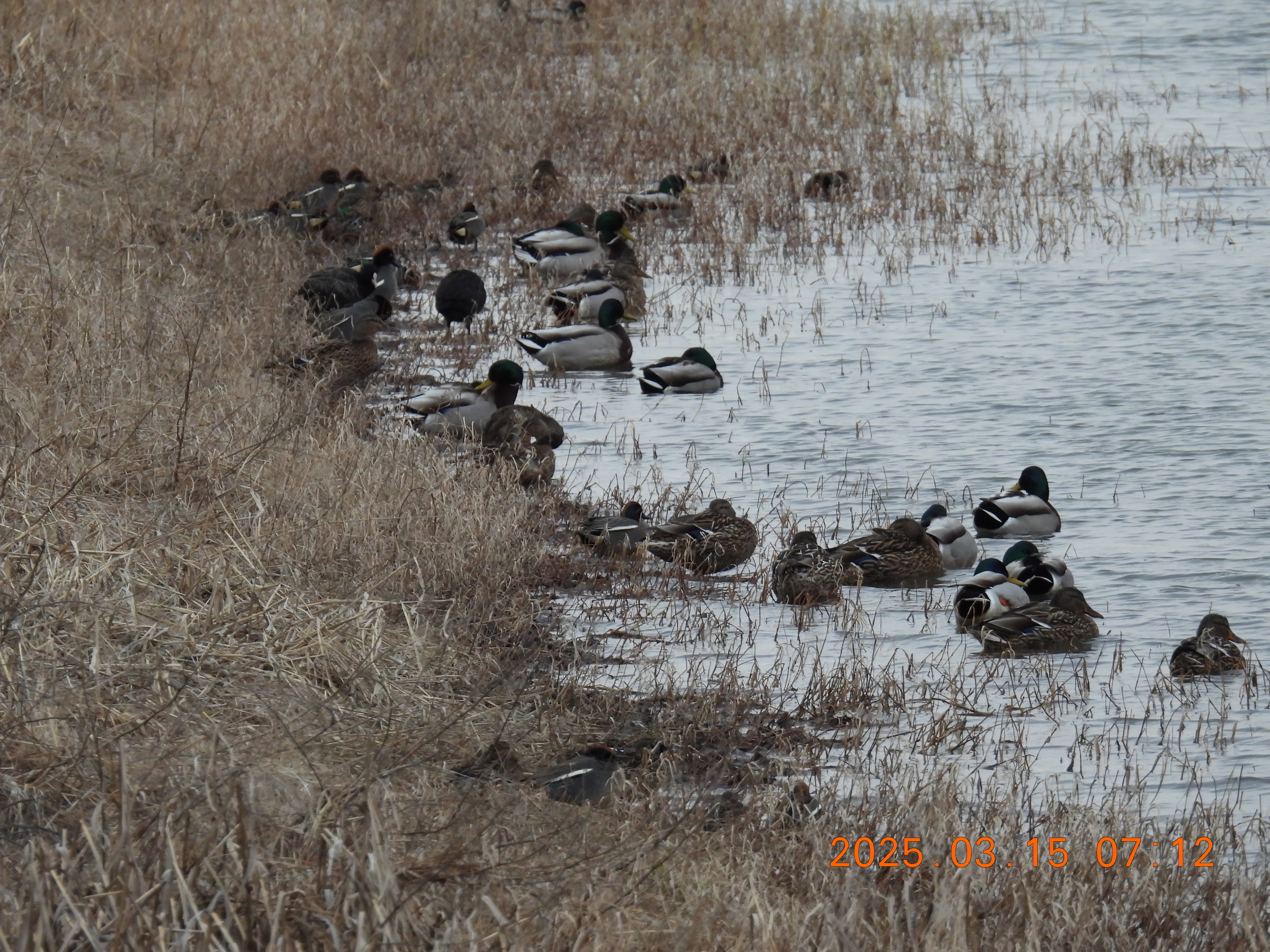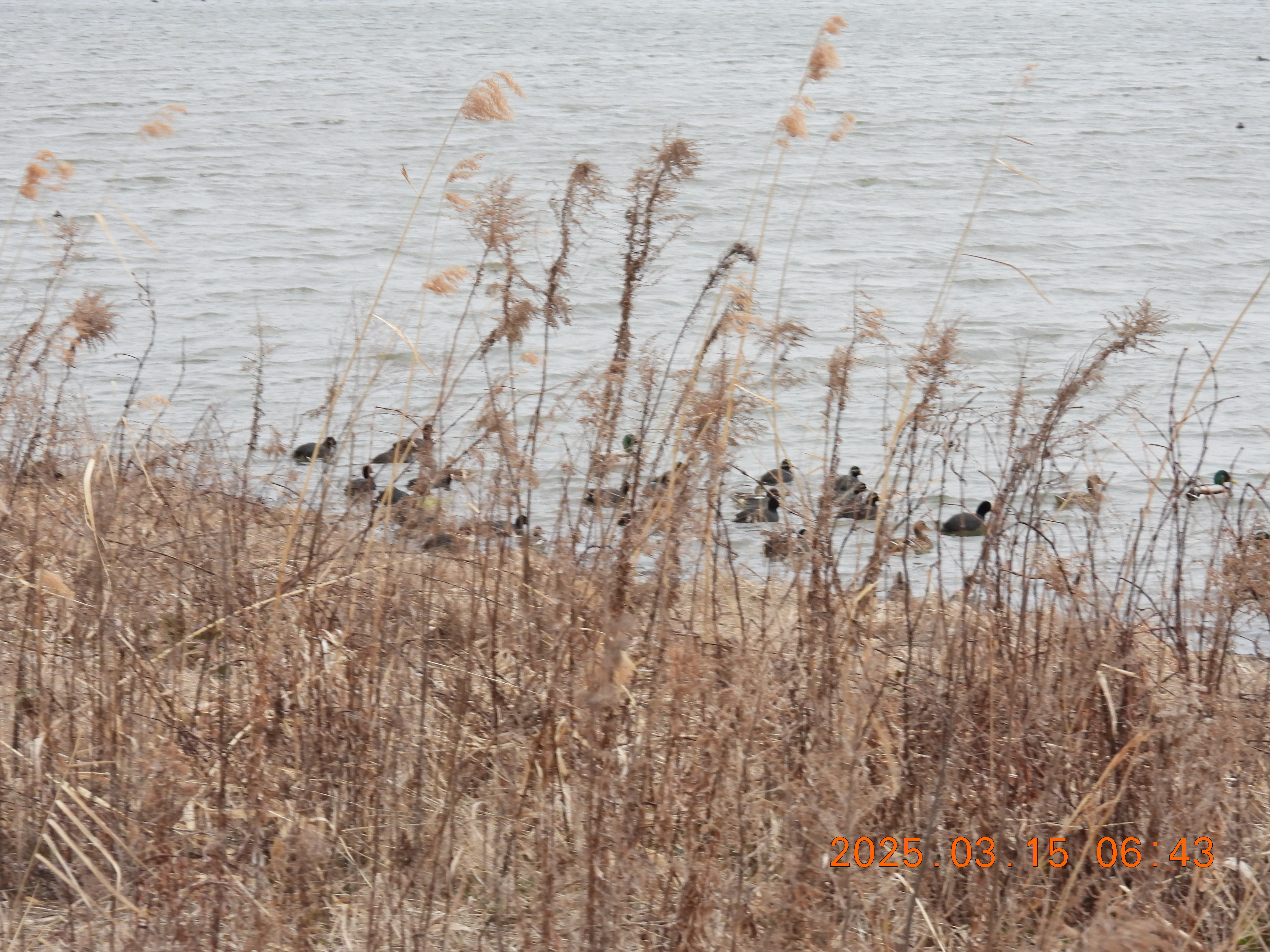対岸の岸辺にはカモたち。