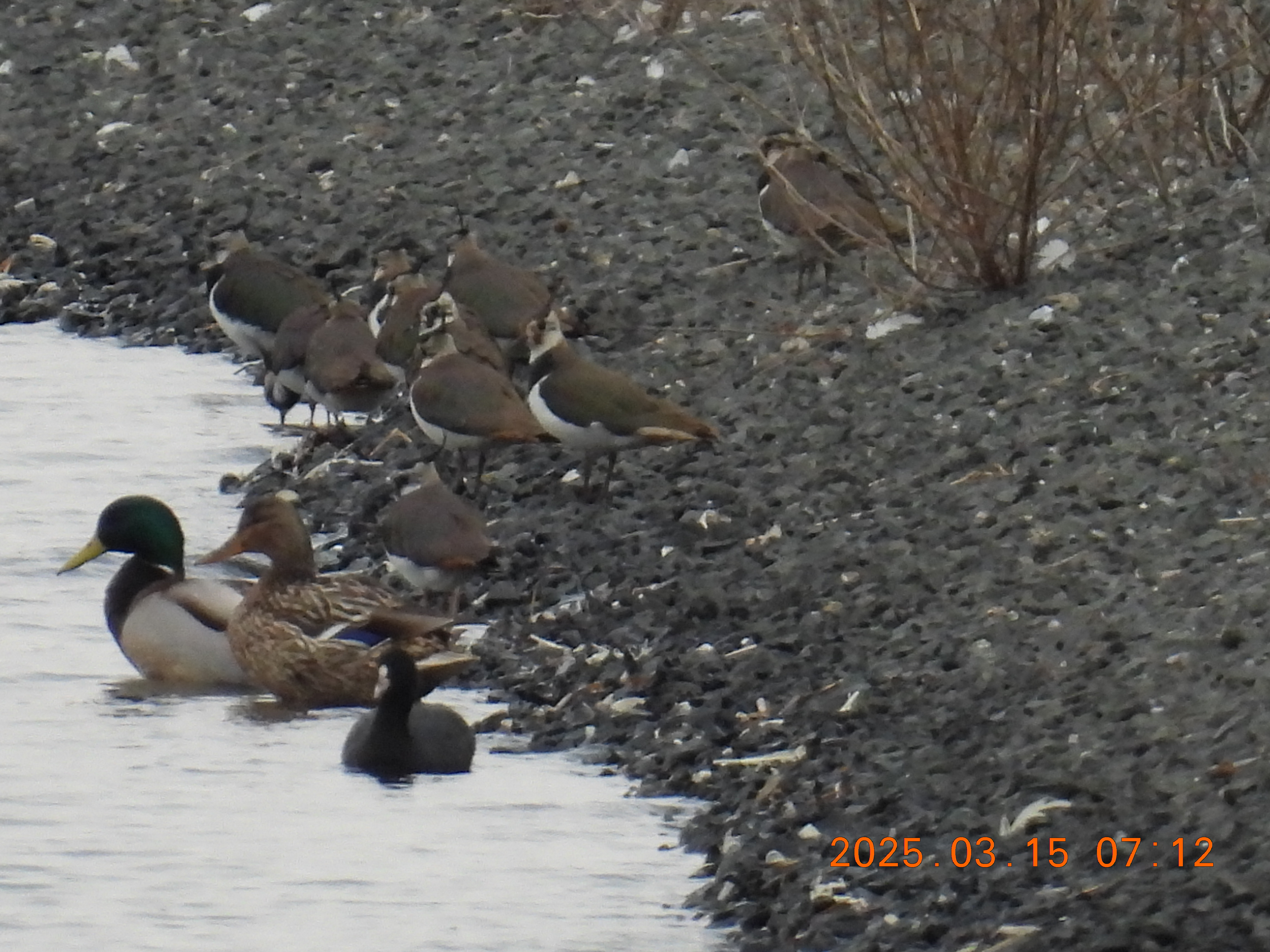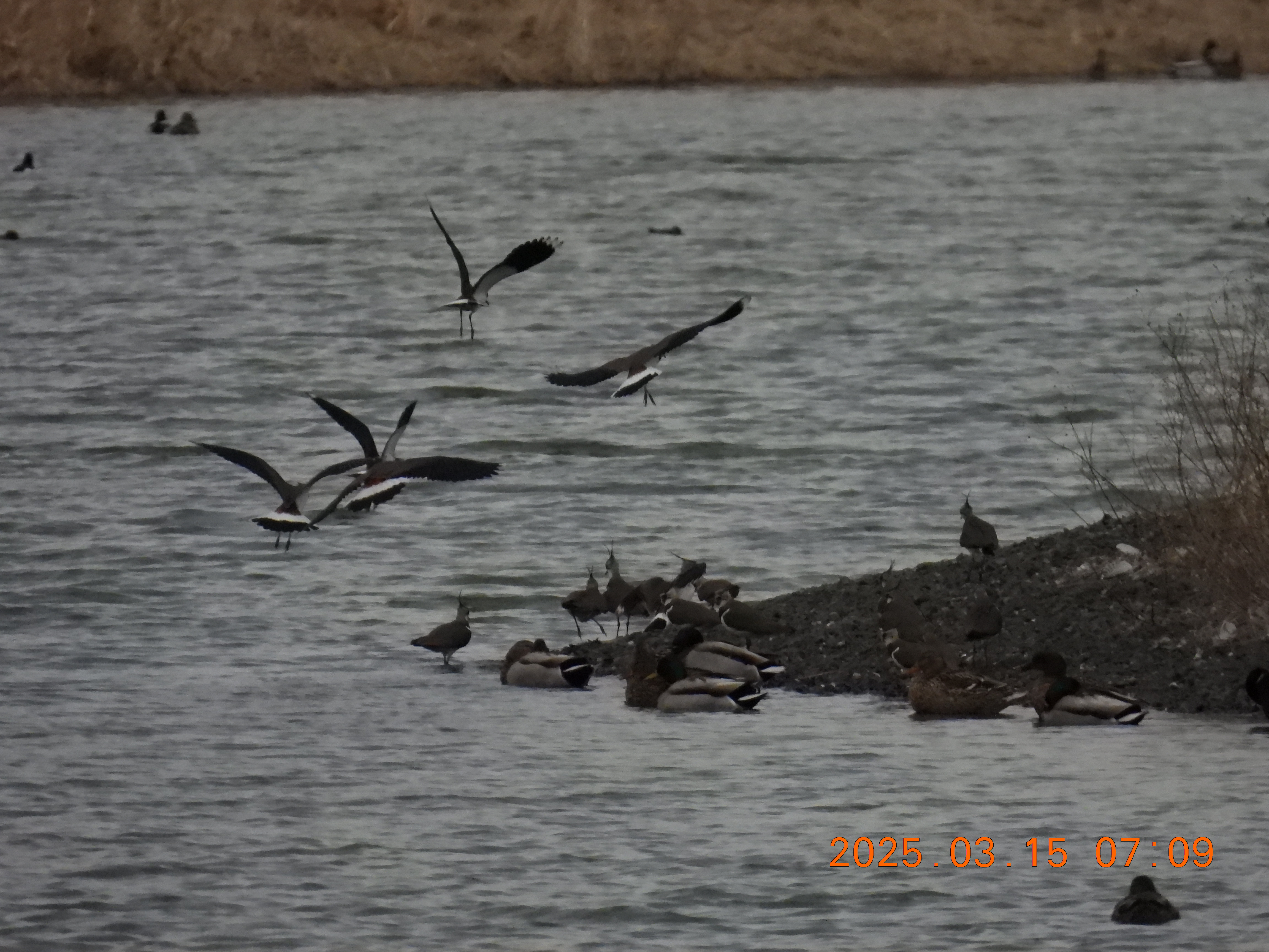 内湖の水面上にタゲリの群れが舞っています。