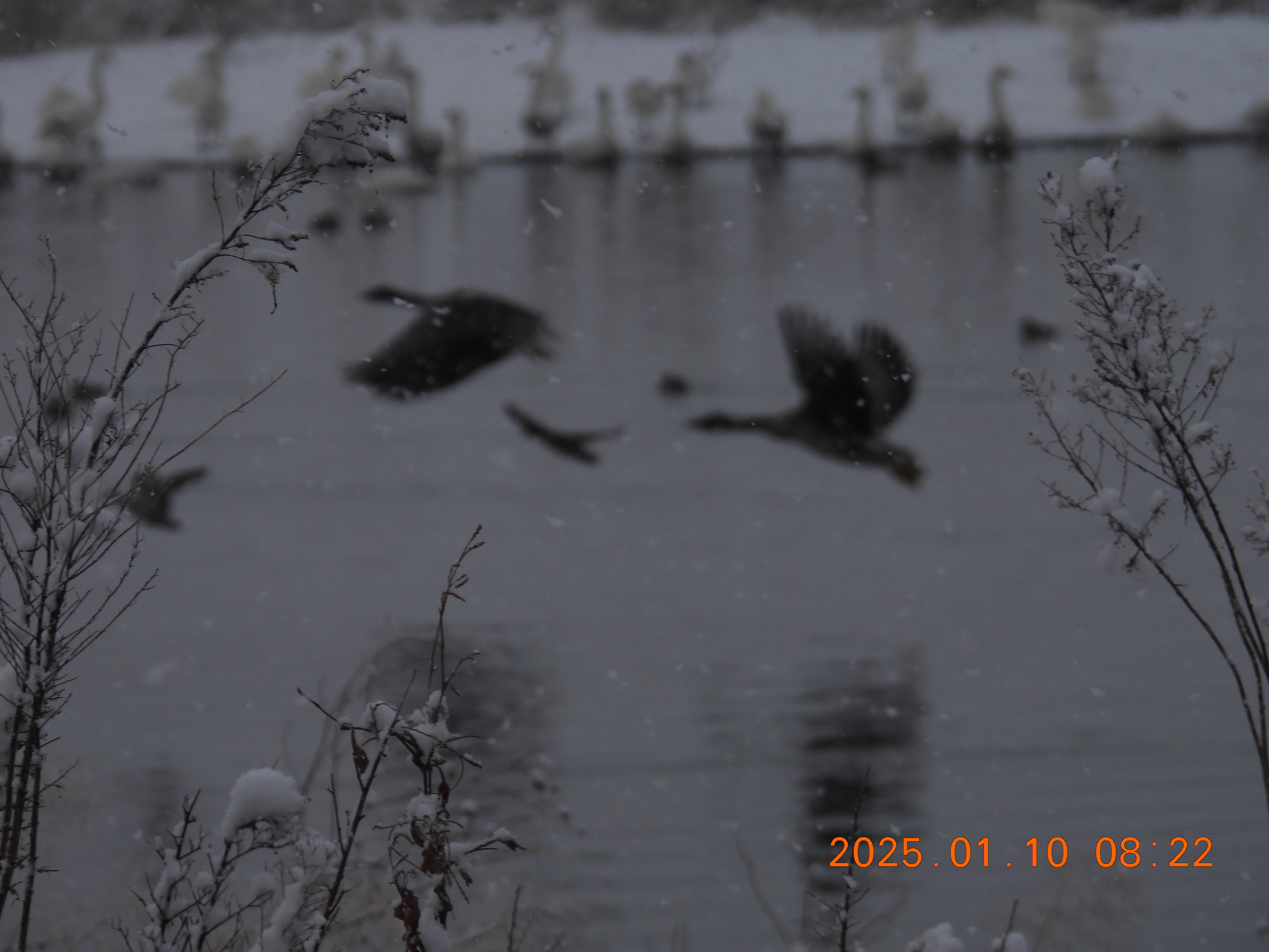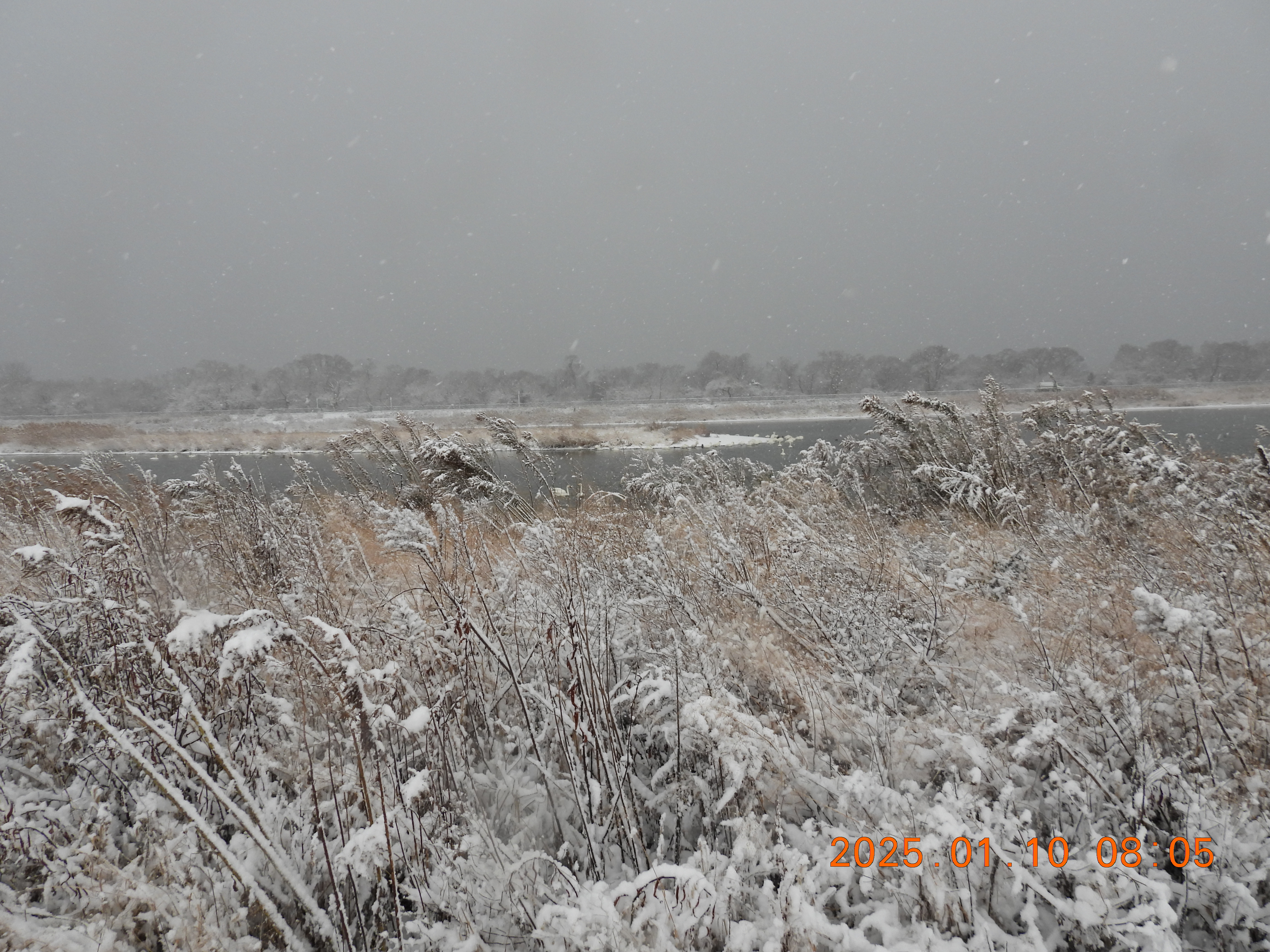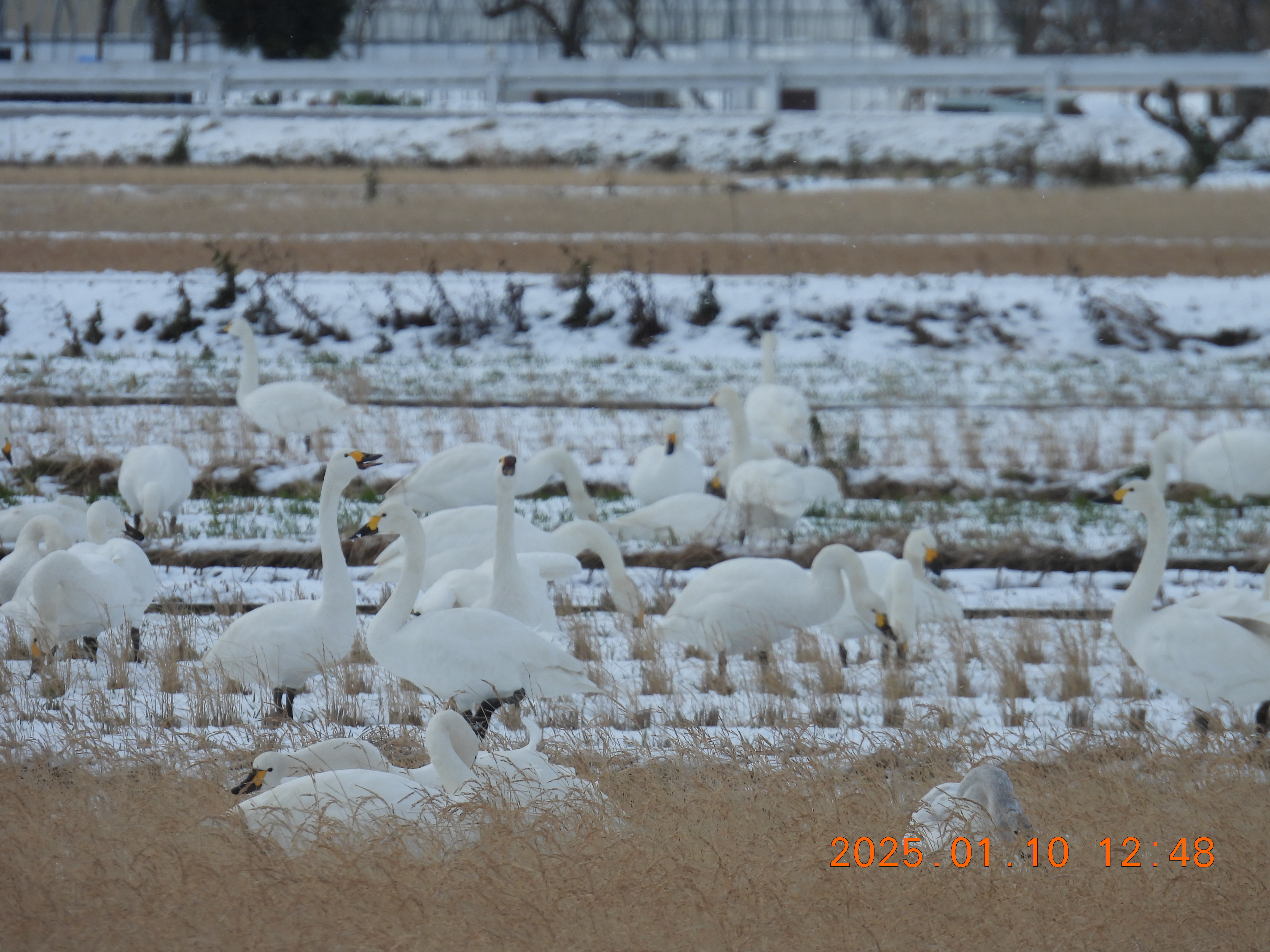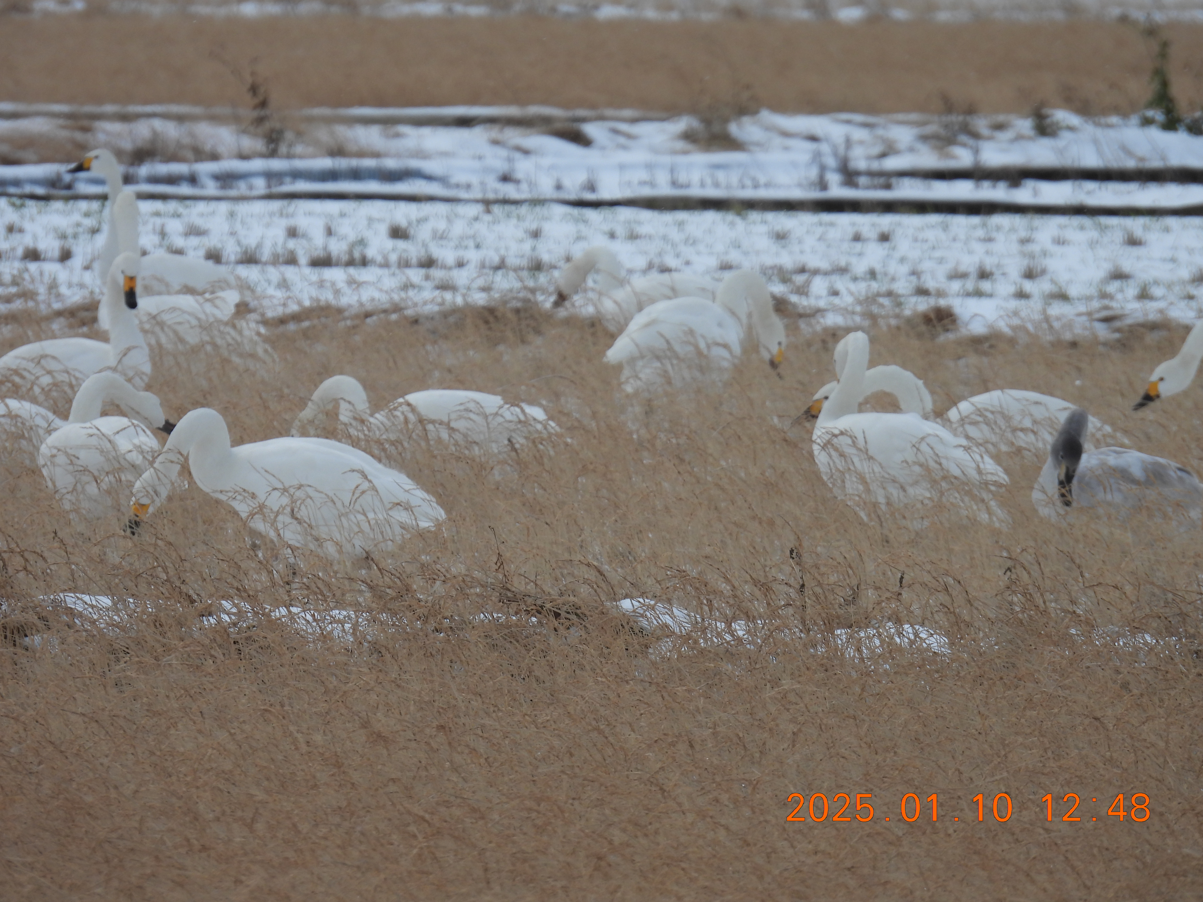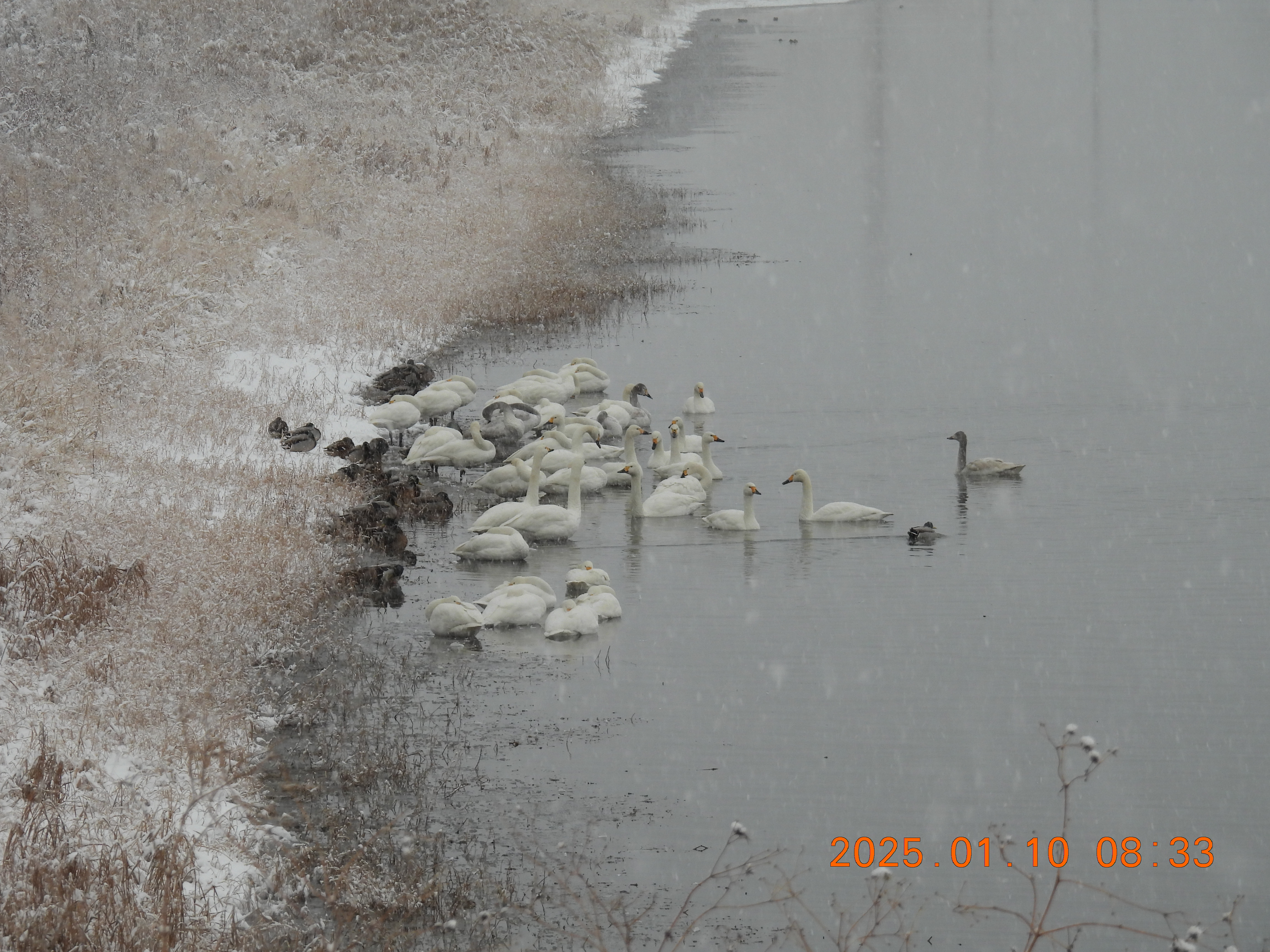 この冬初めての雪景色、積雪は5㎝位です。コハクチョウはここ2~3日少ないようです。