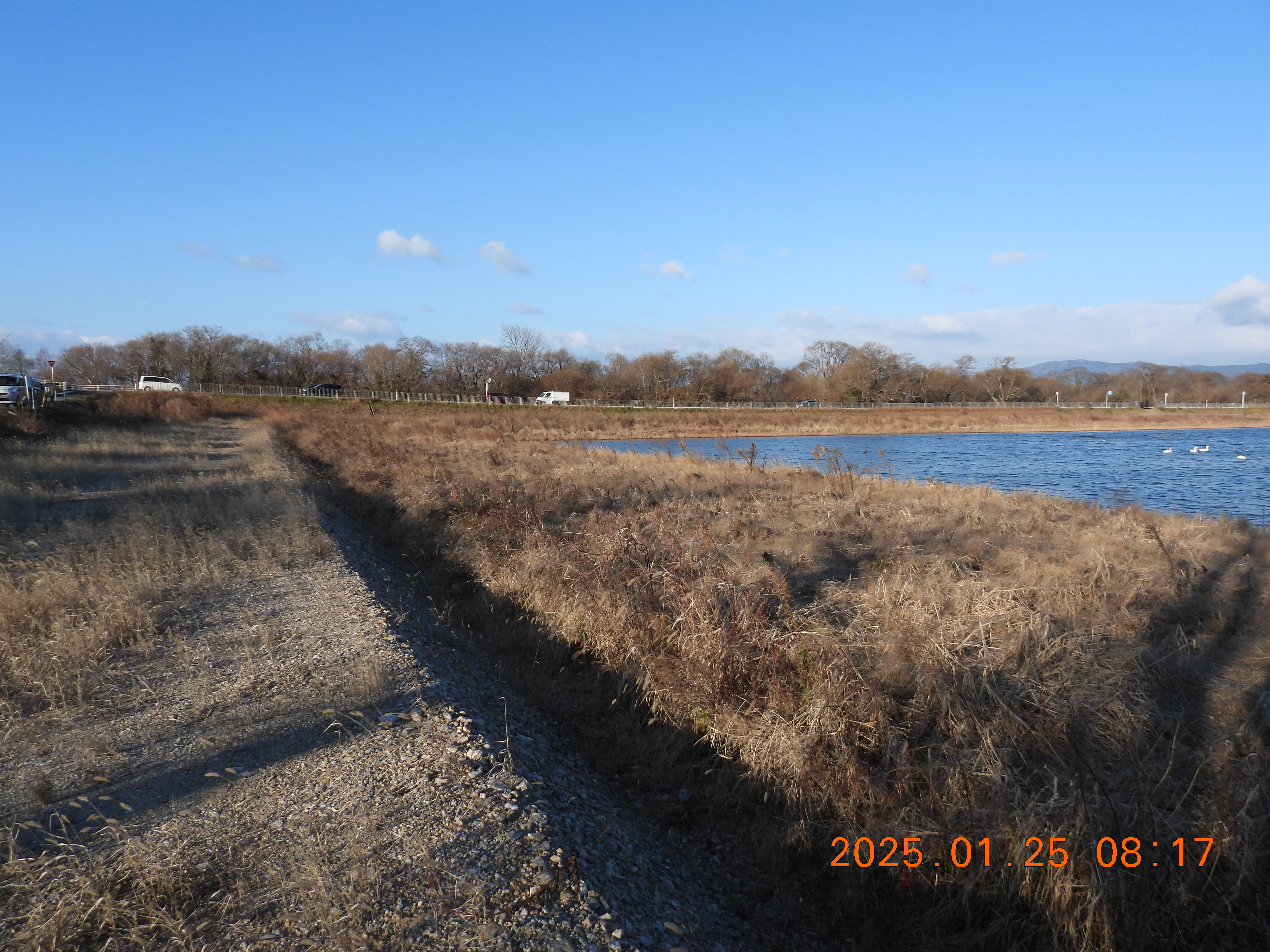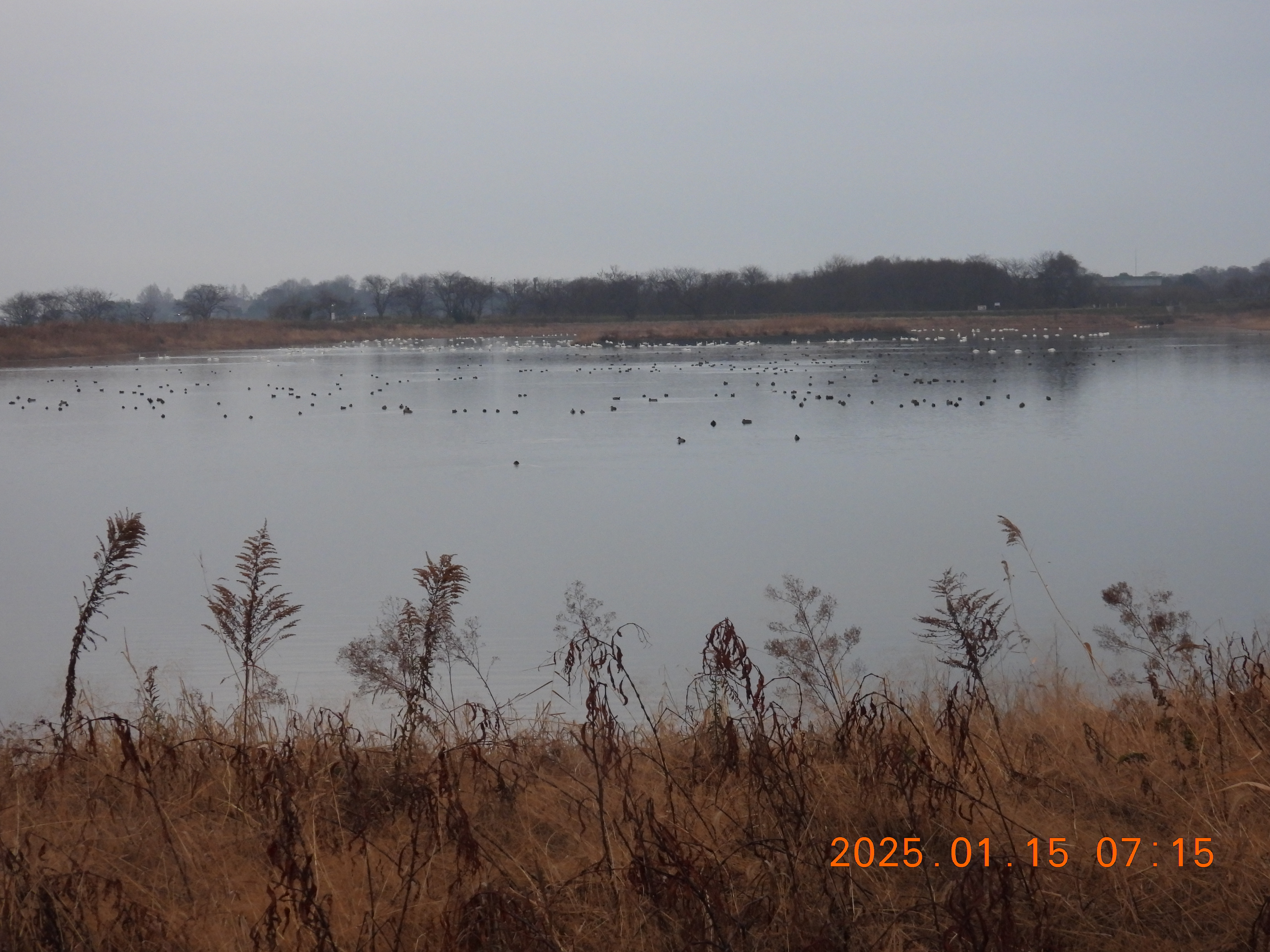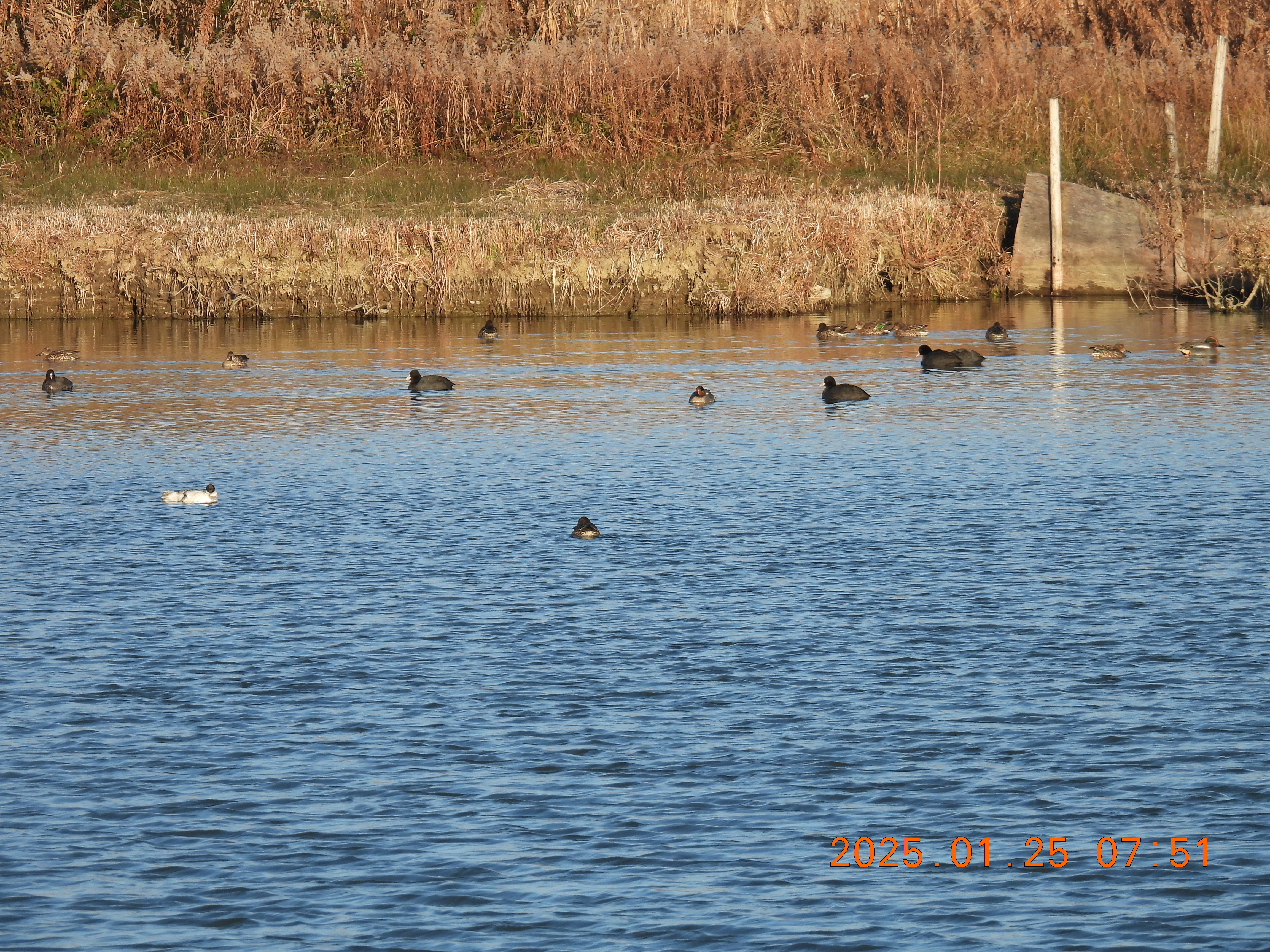 今朝は西からの風なので風を避けるように西の岸辺に集まっている。