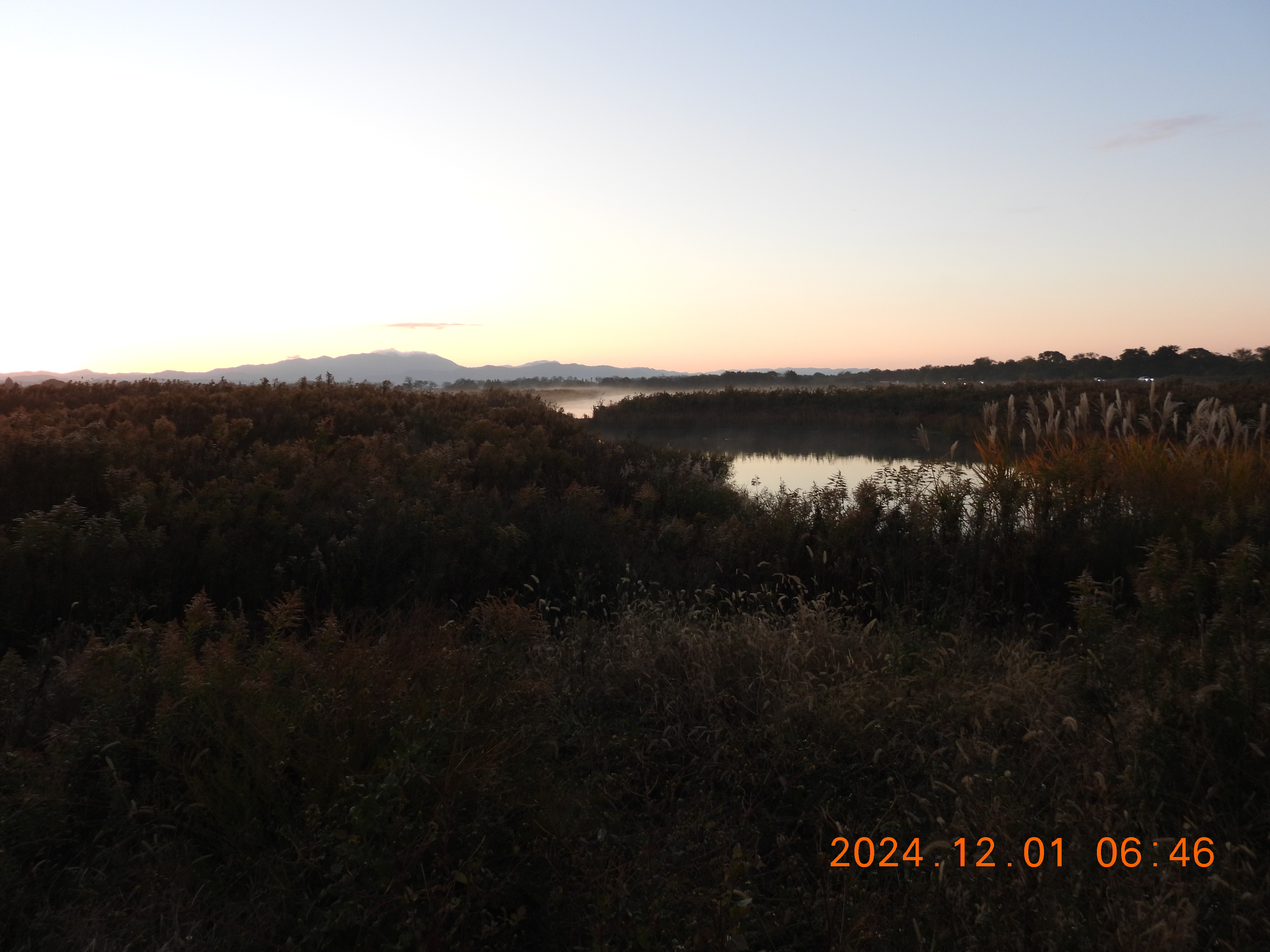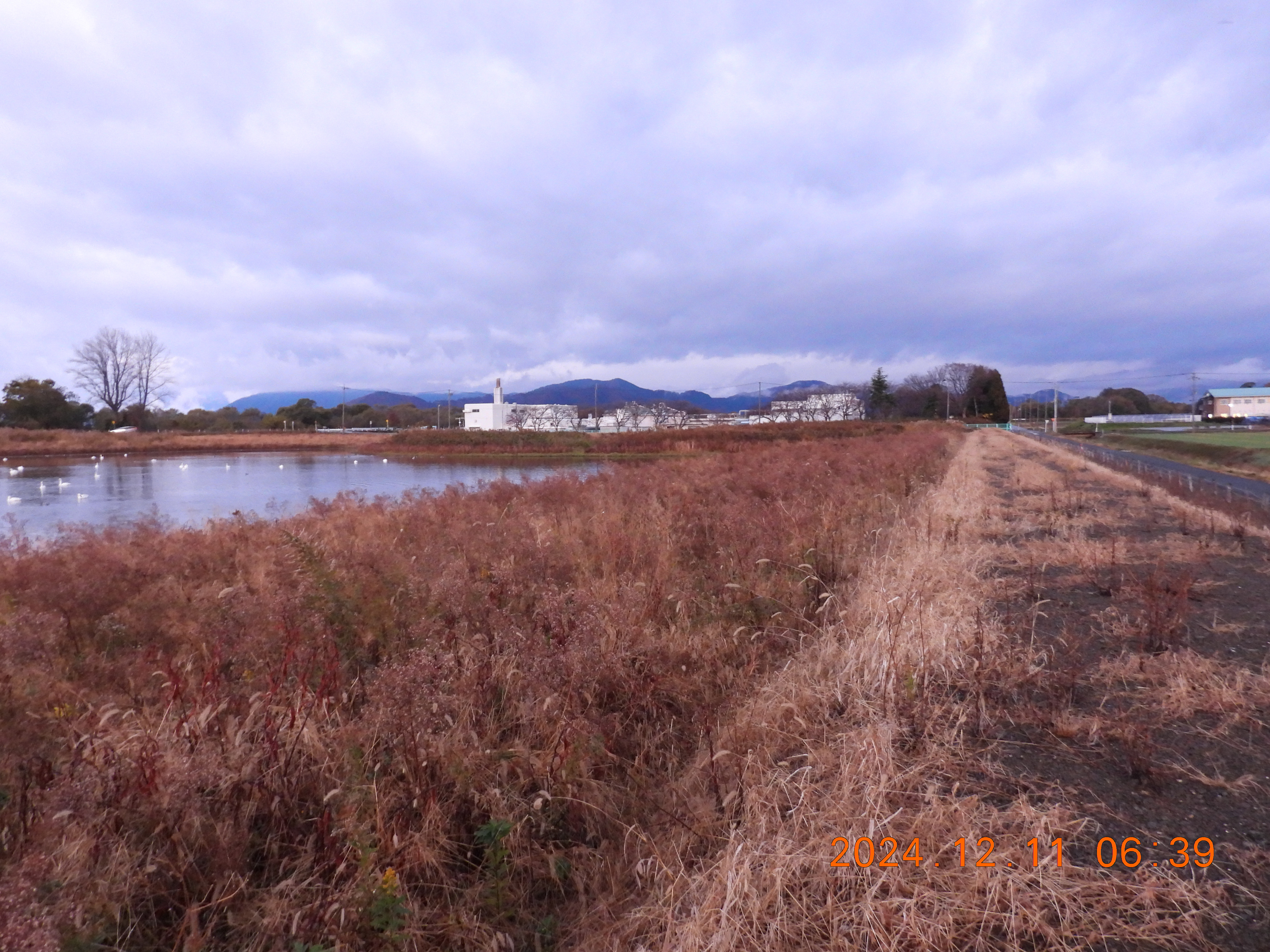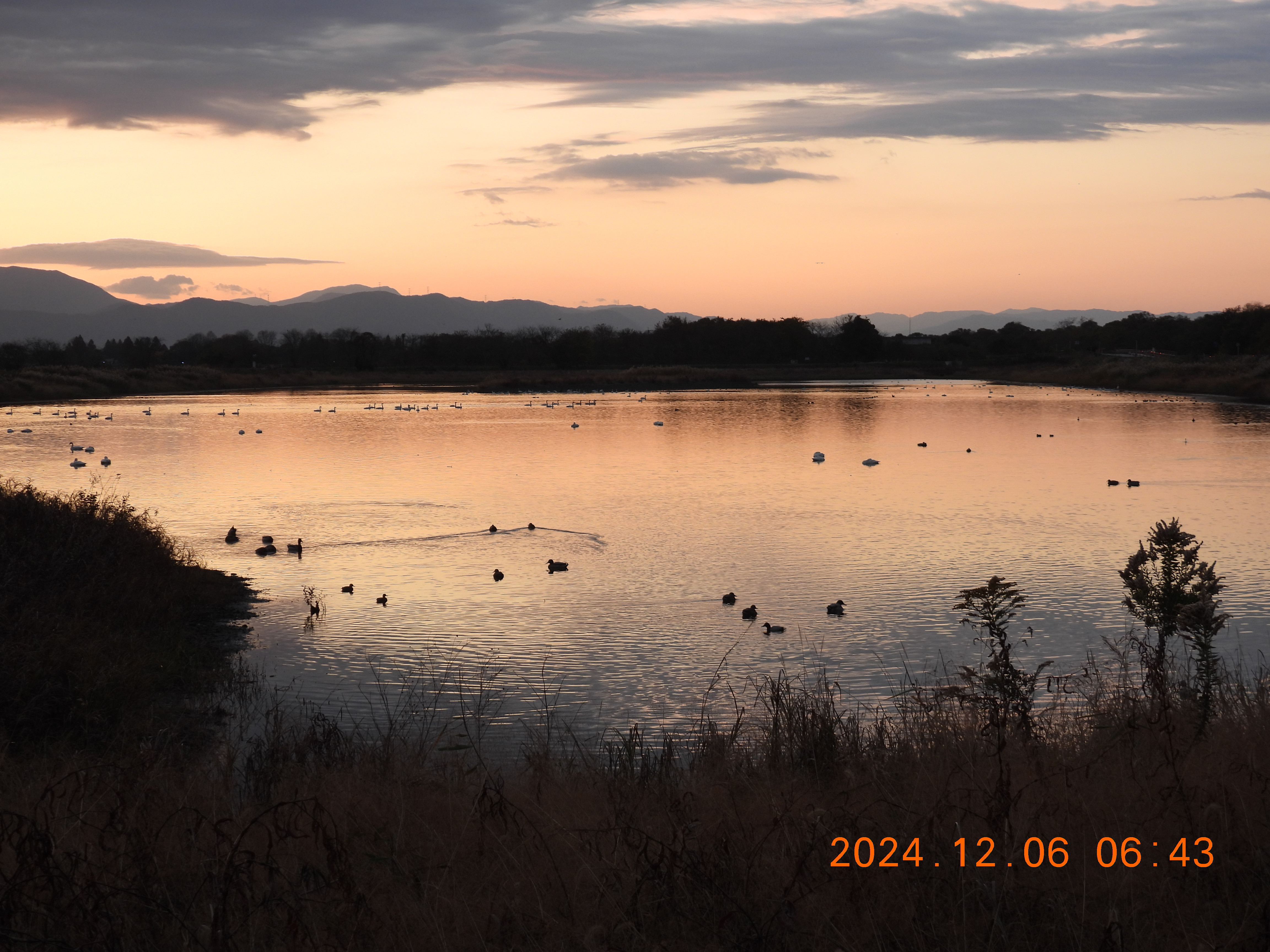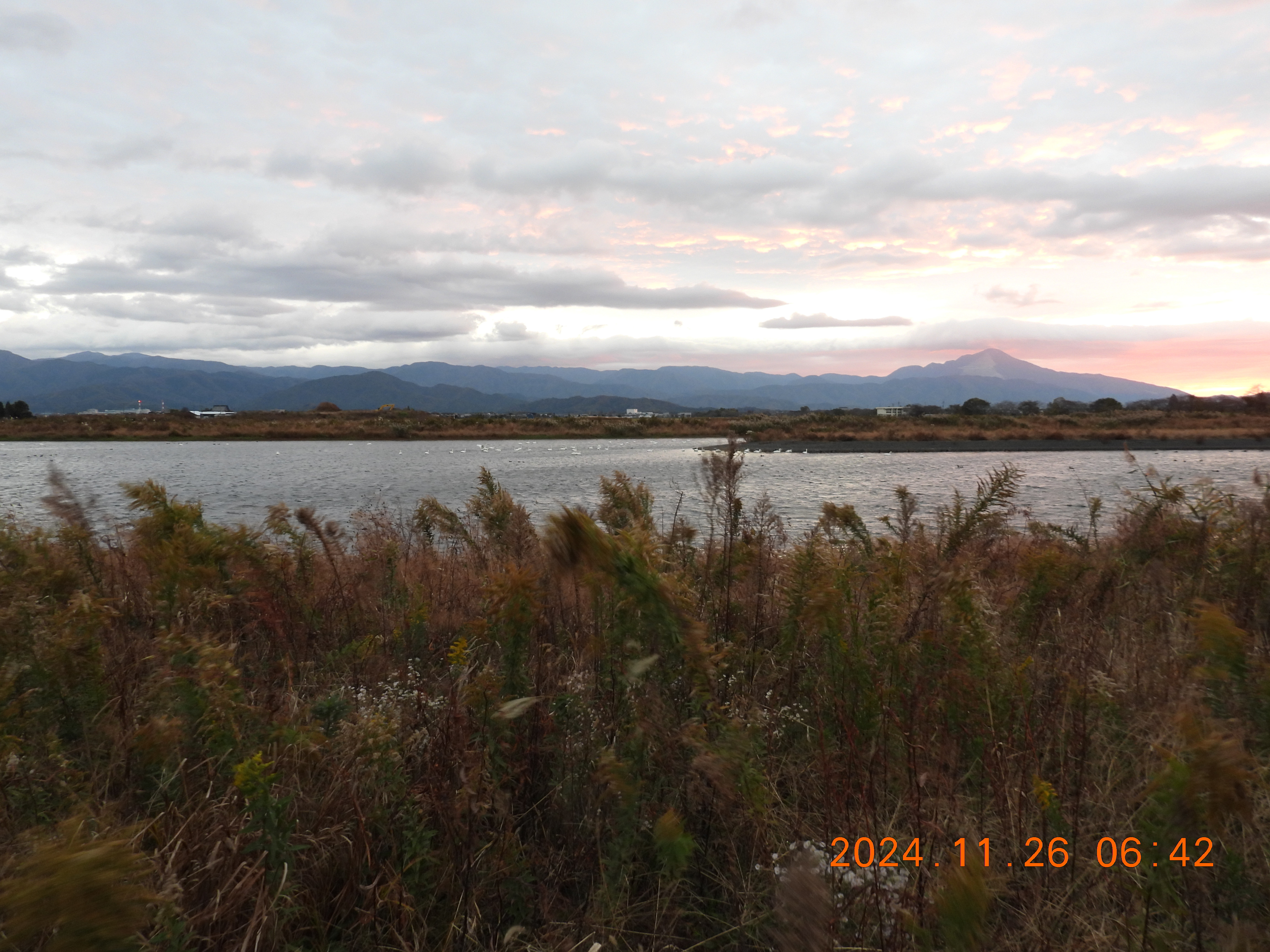 東を見ると日の出前の明るさ、内湖周辺は雨。今日も120~130のコハクチョウが入っています。