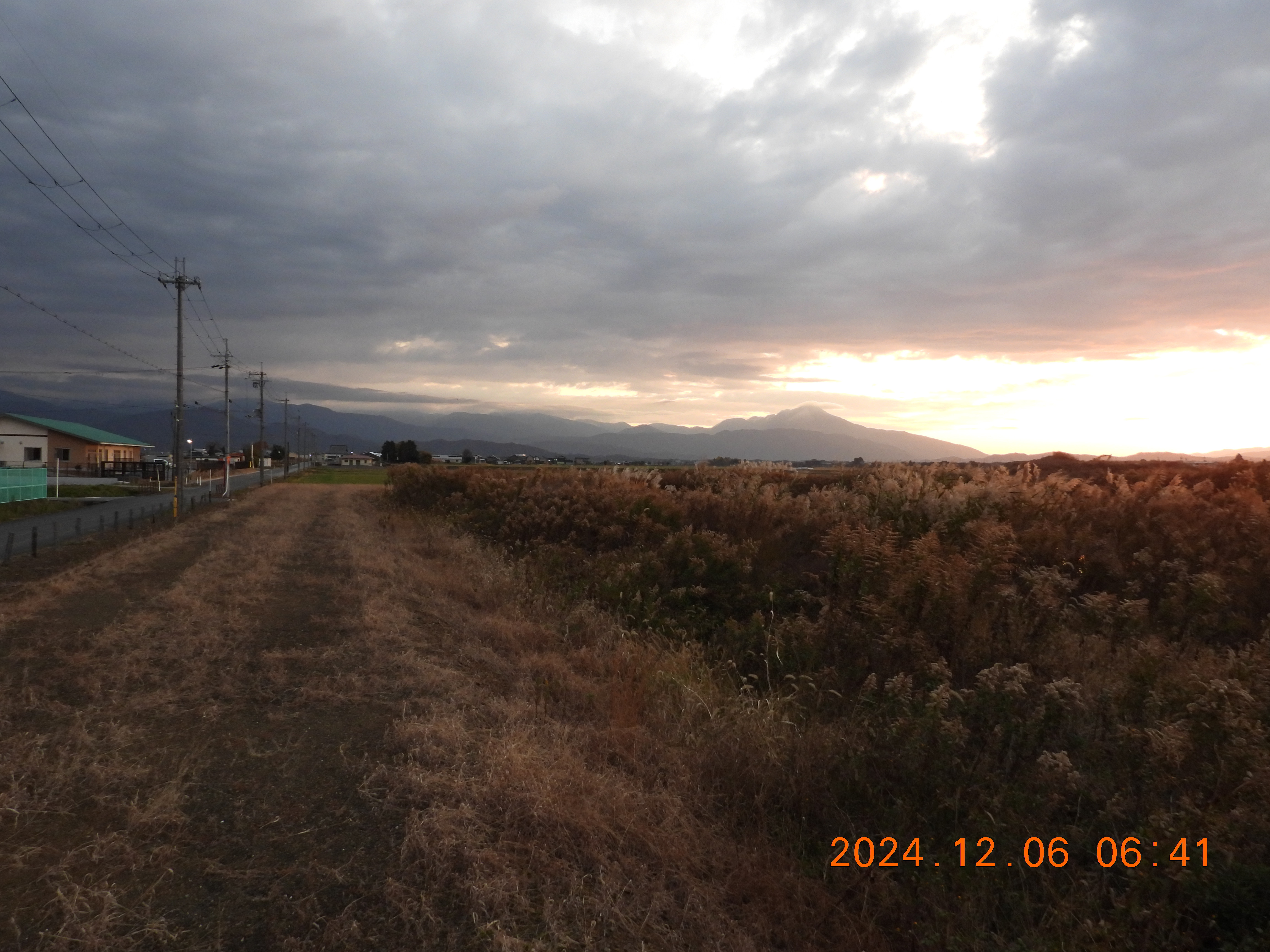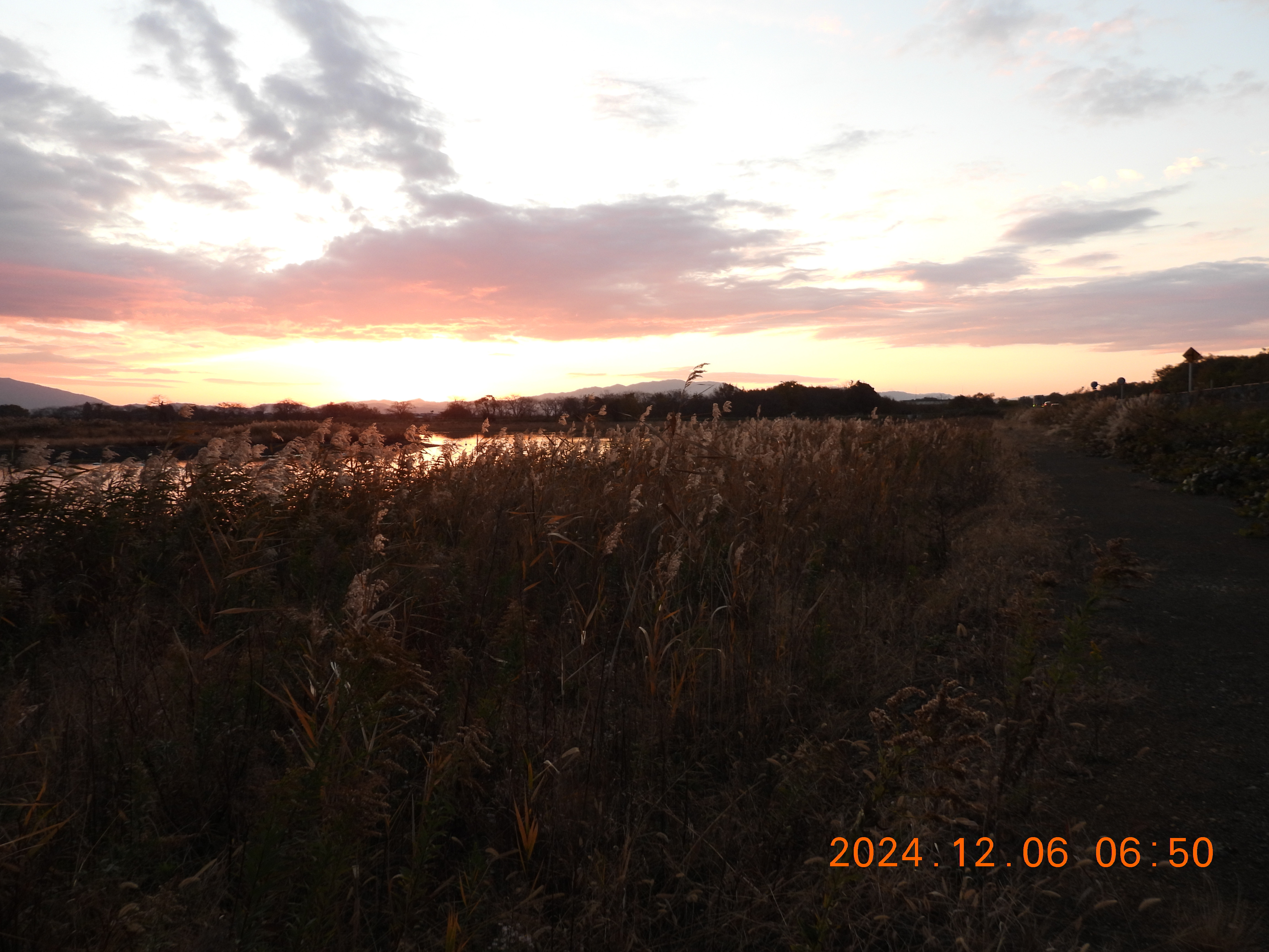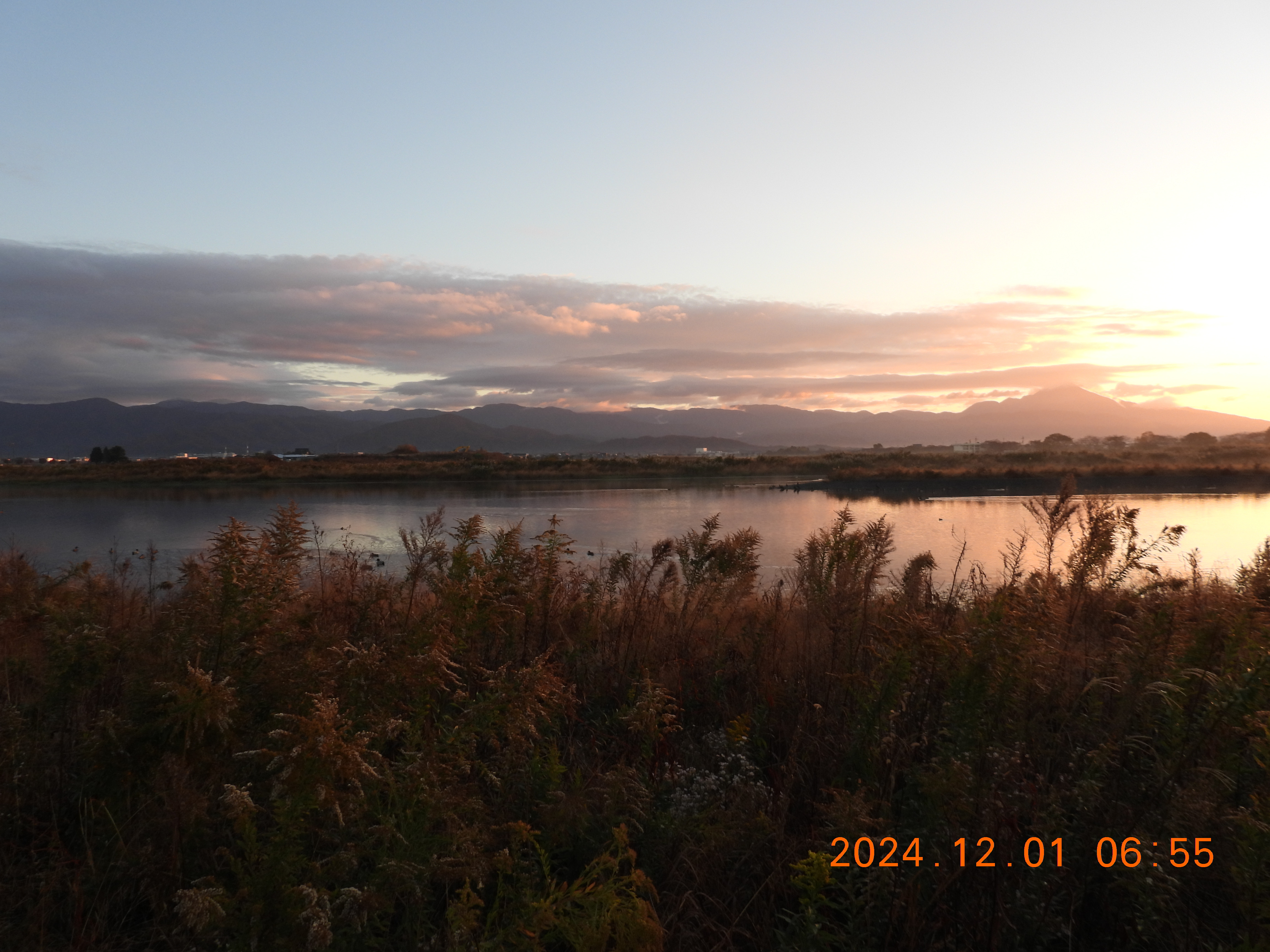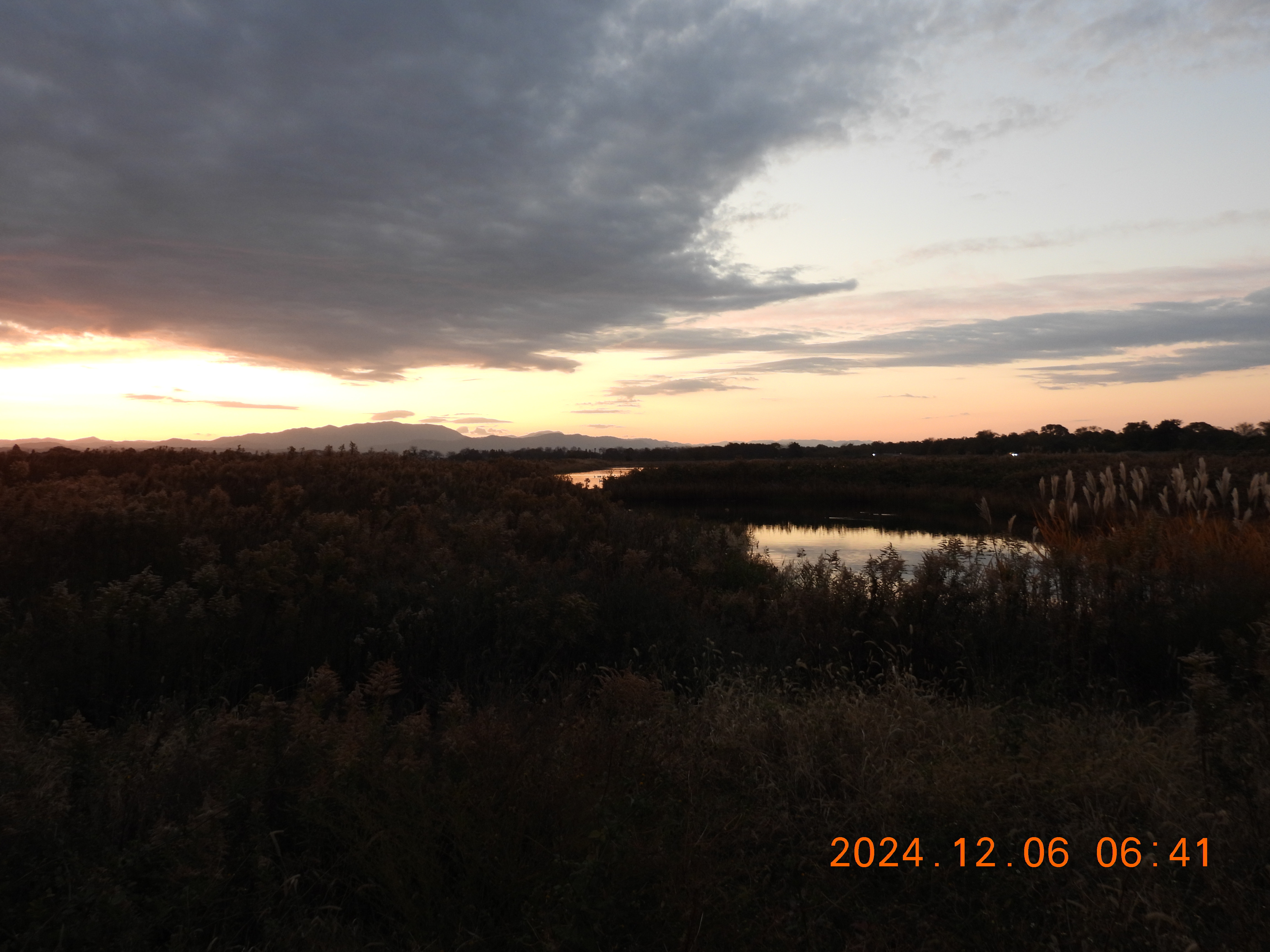 東を見ると日の出前の明るさ、内湖周辺は雨。今日も120~130のコハクチョウが入っています。