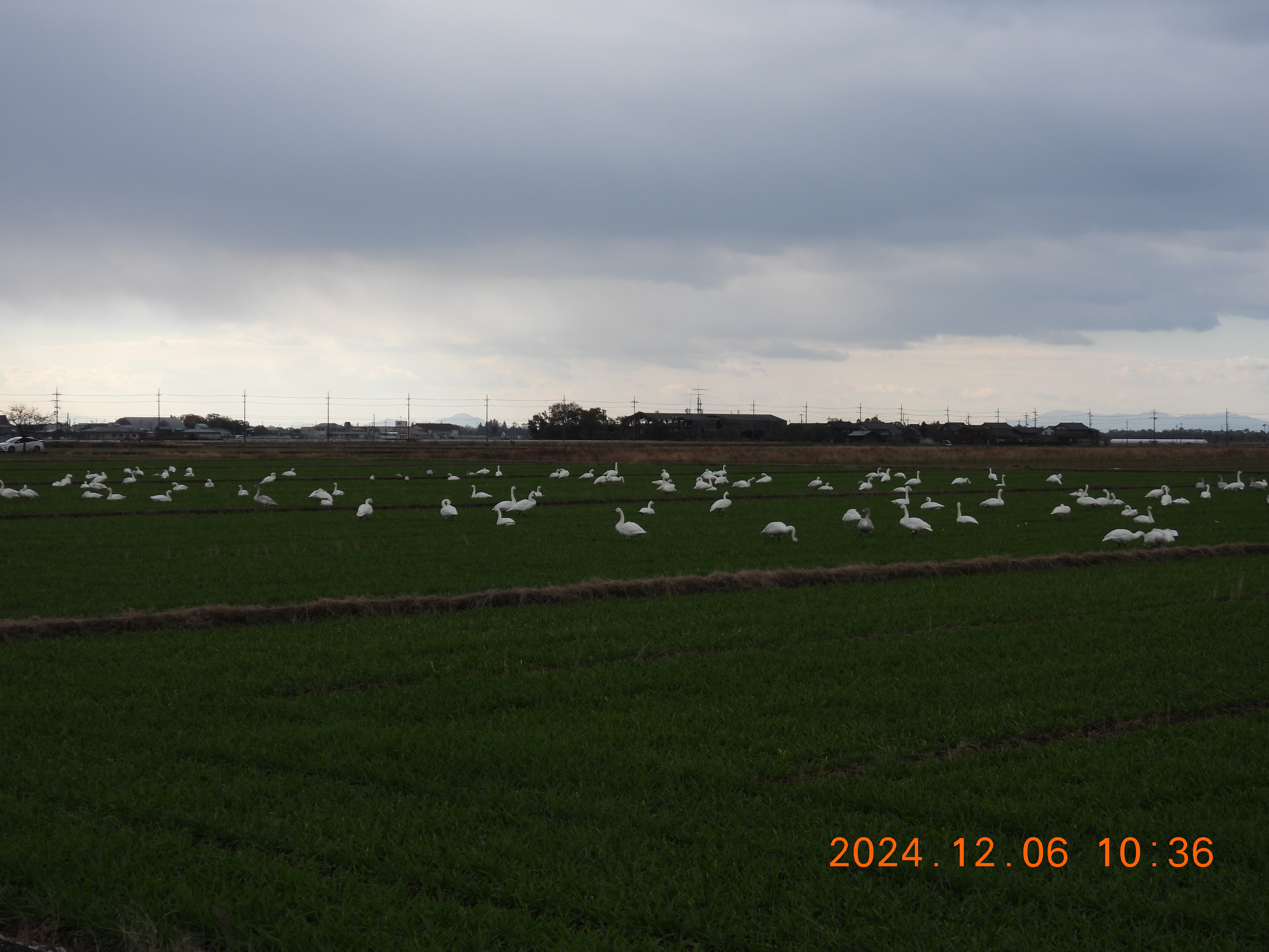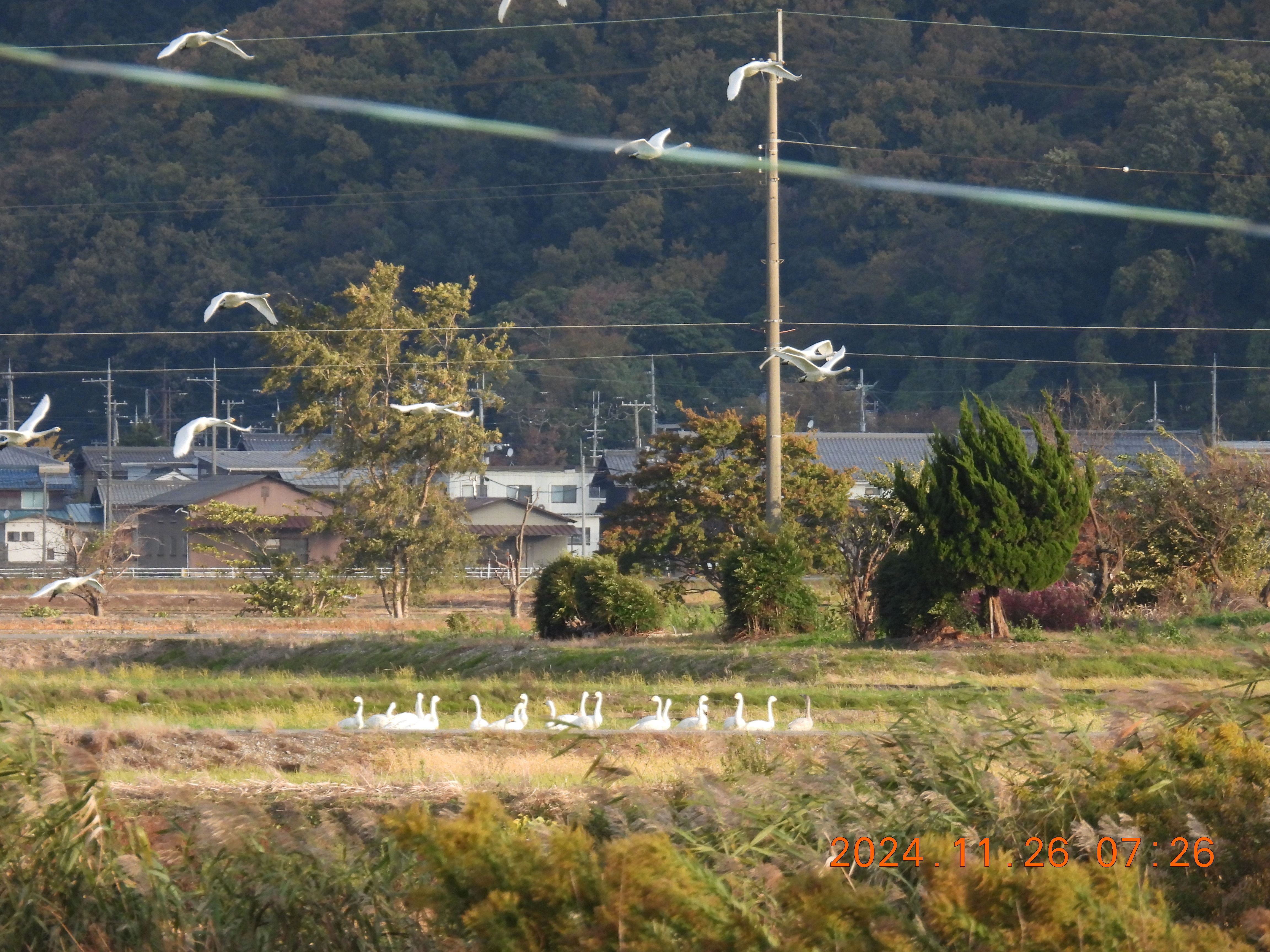 飛び立ったコハクチョウは海老江地区の南の田んぼに降りていきます。