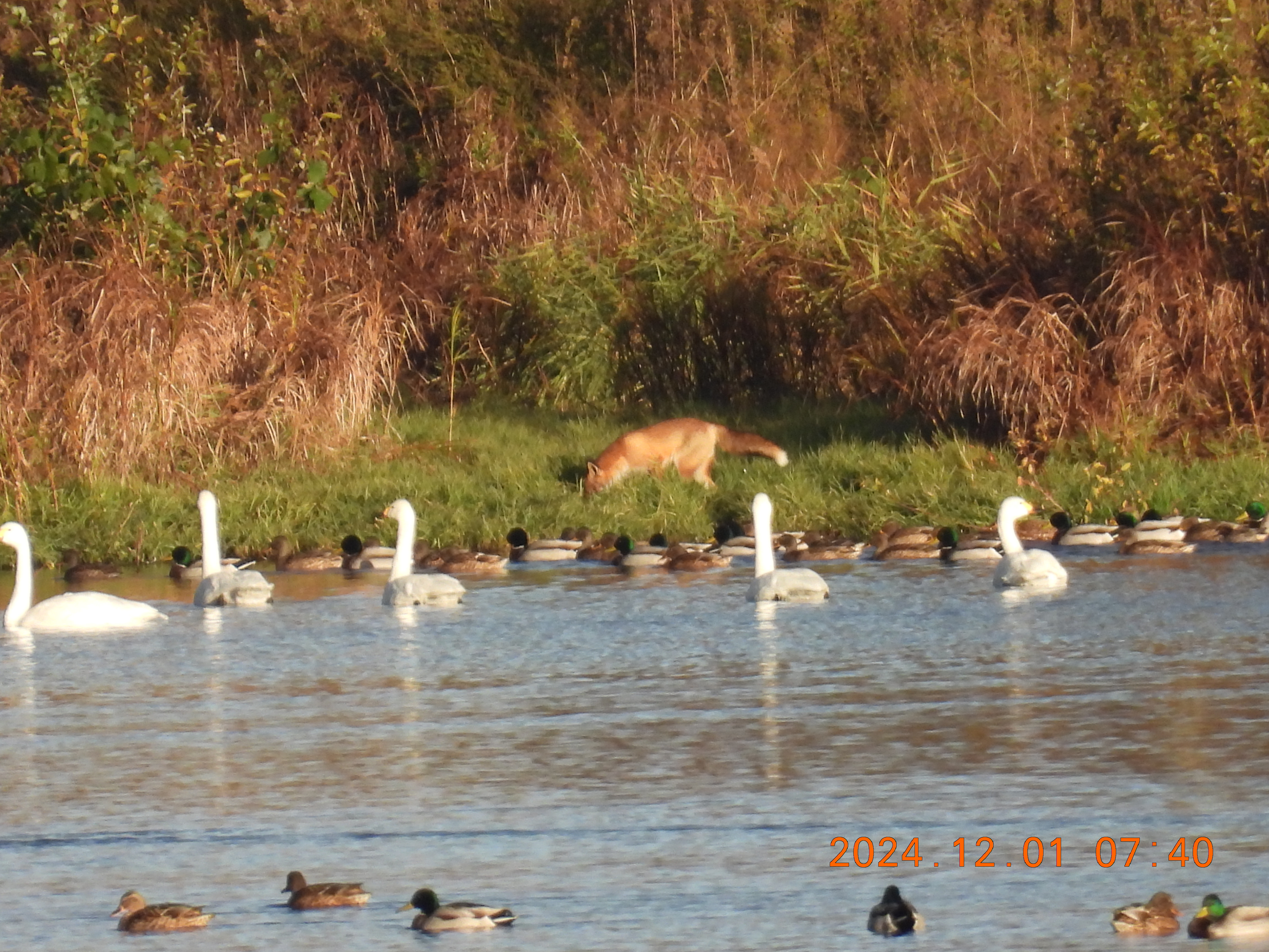 コハクチョウもキツネが気になるようです。
