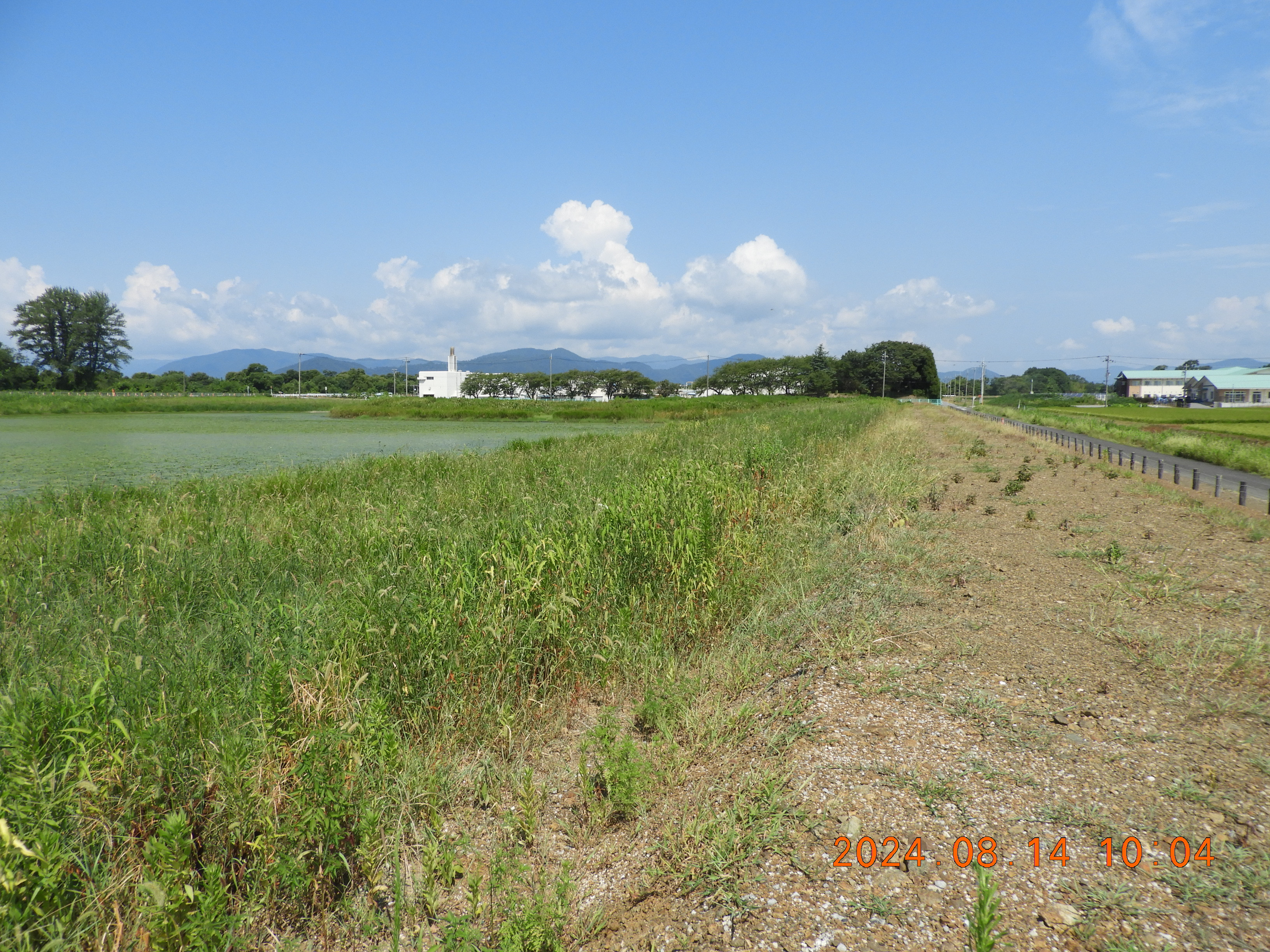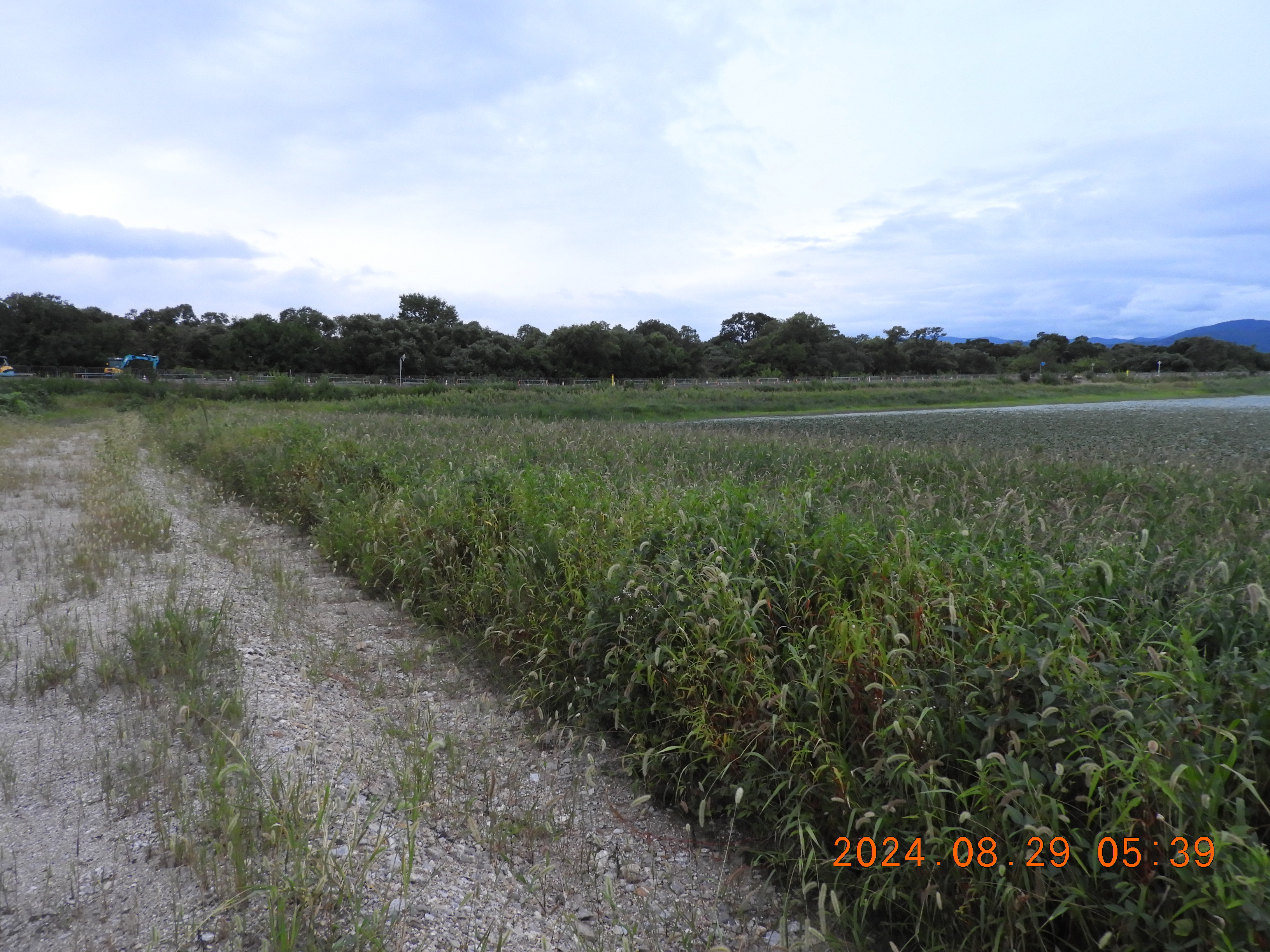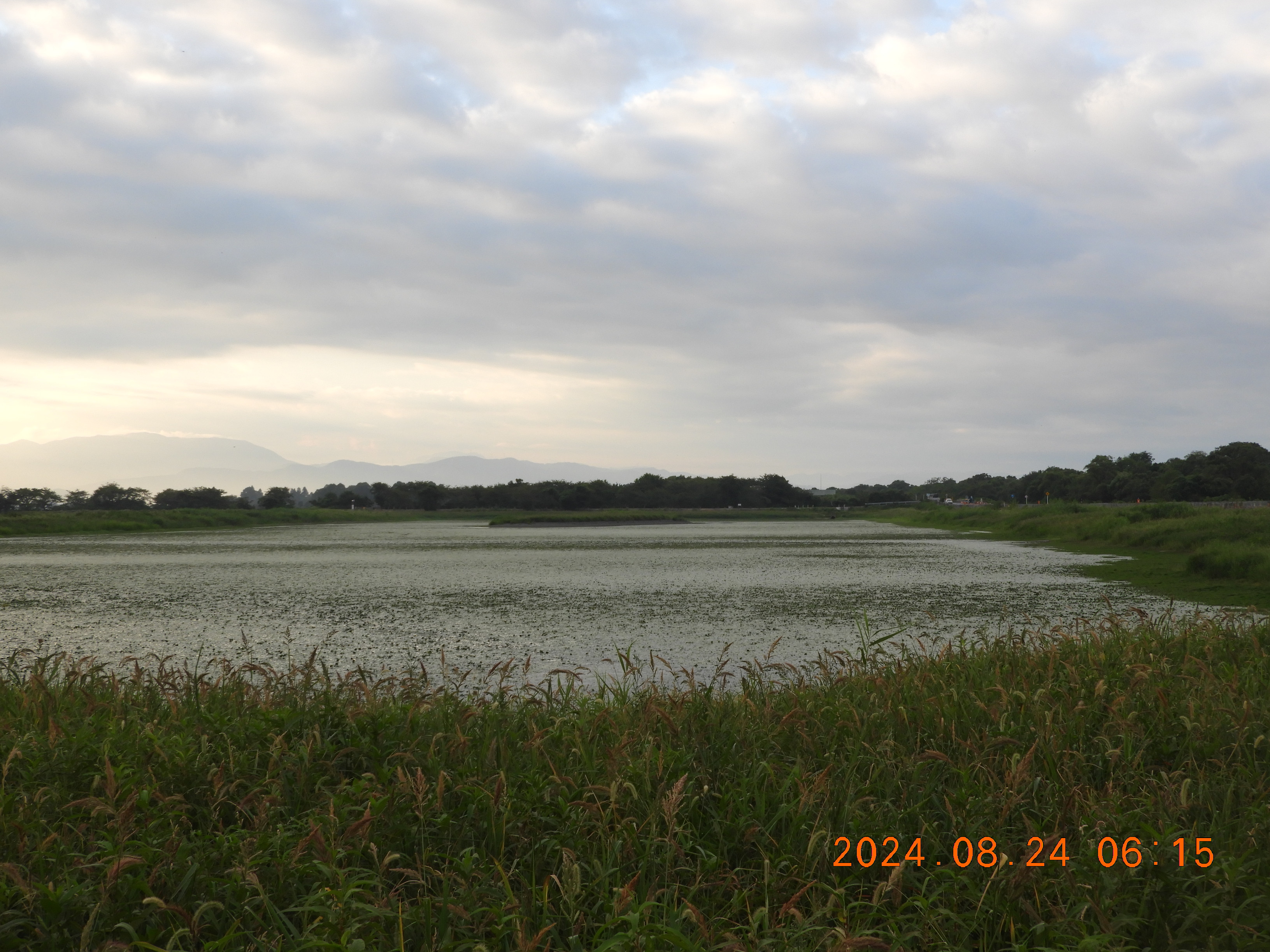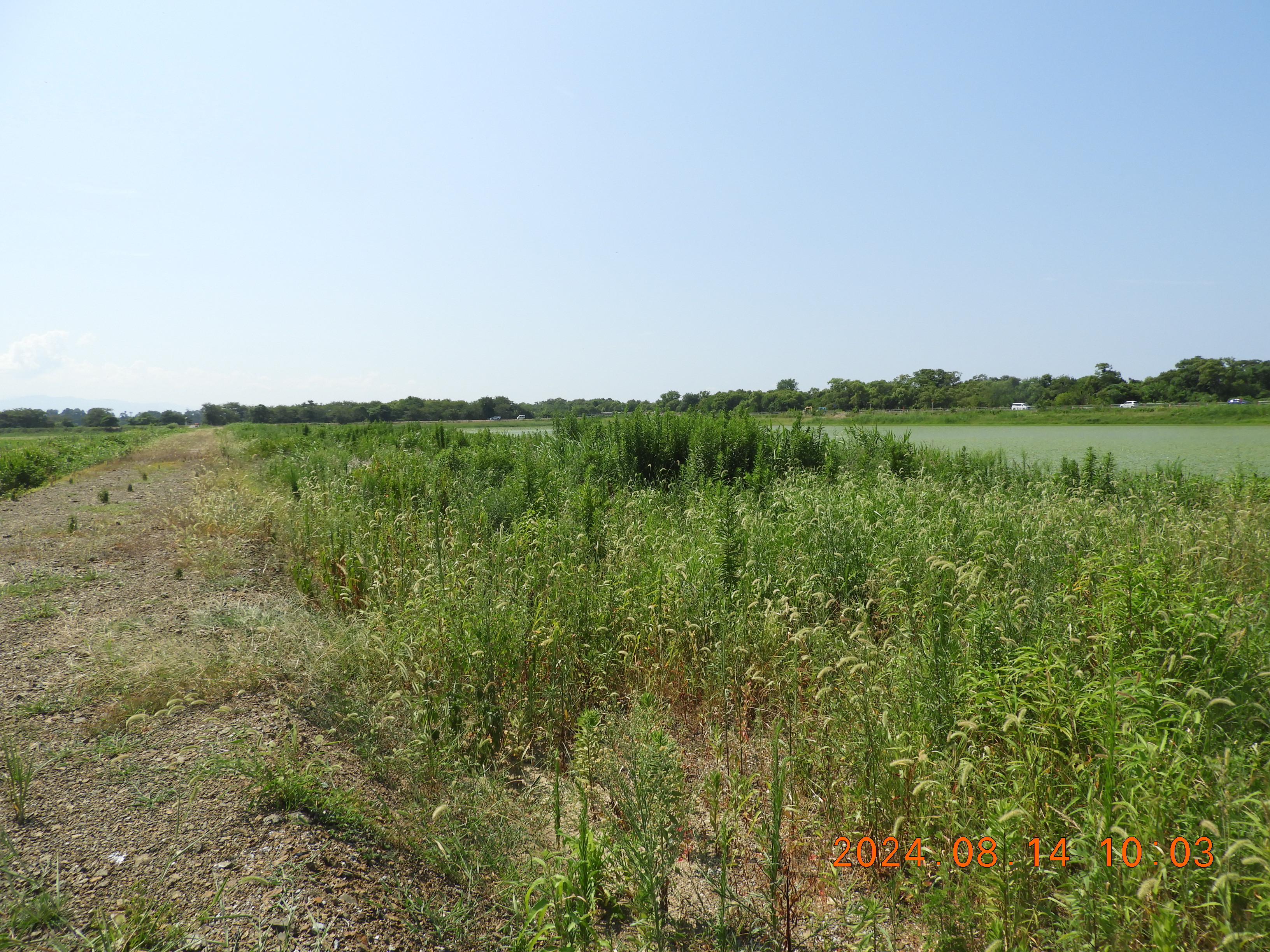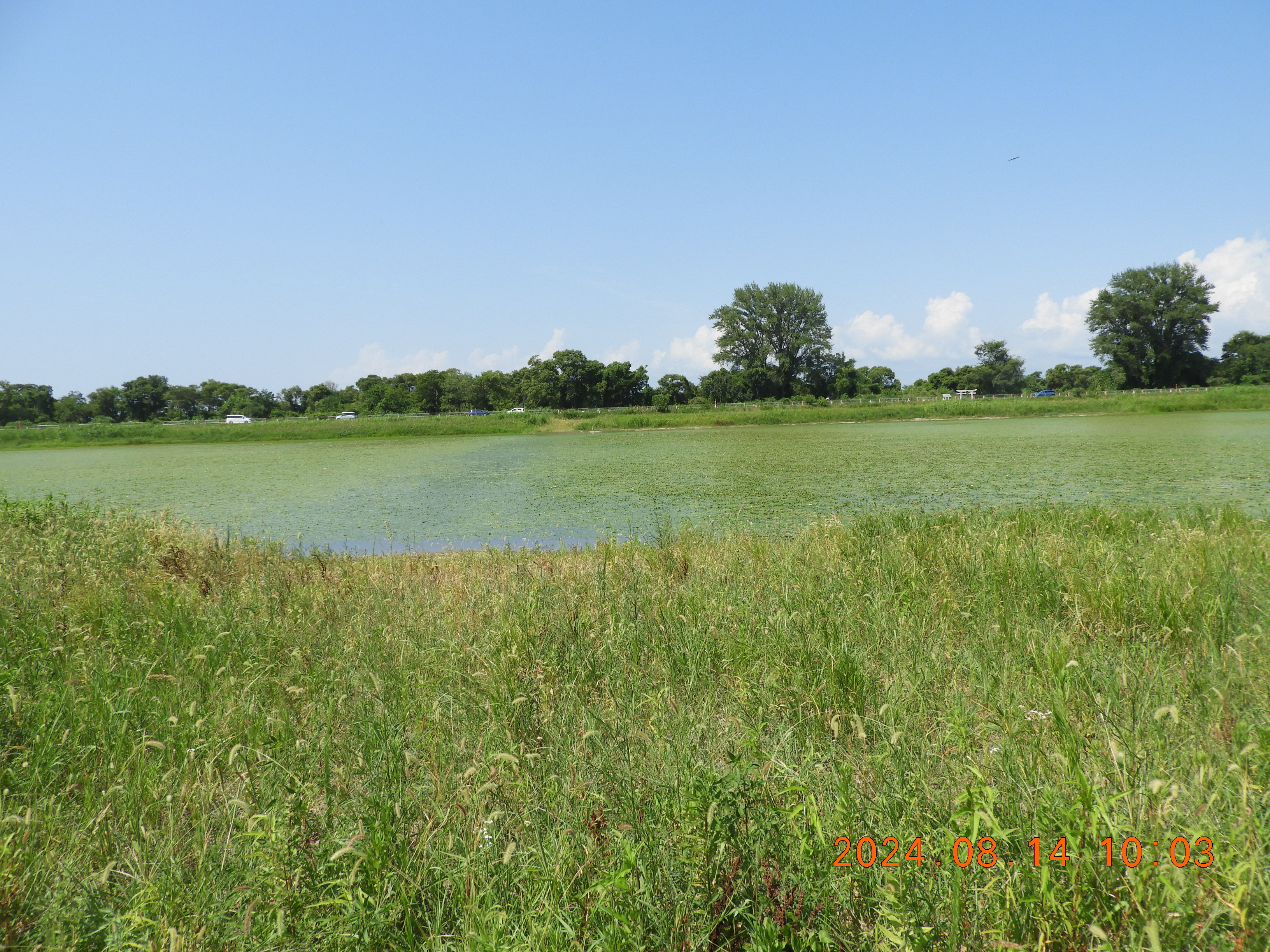 東からの撮影 中央部分の仮設道路の後は少しヒシの繁殖も少ないです。
