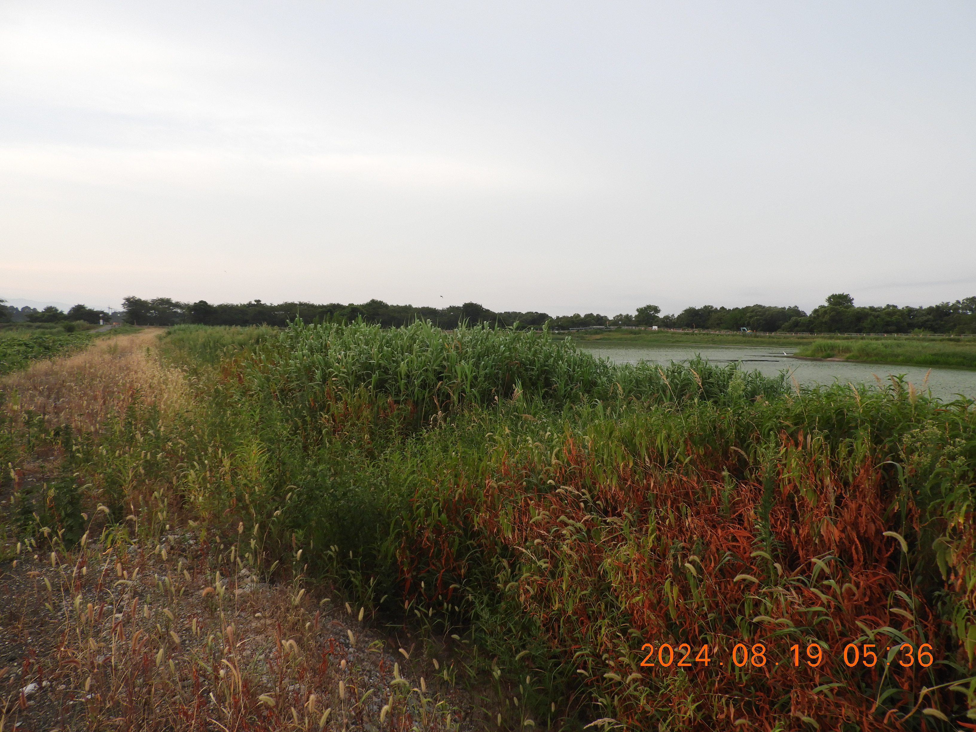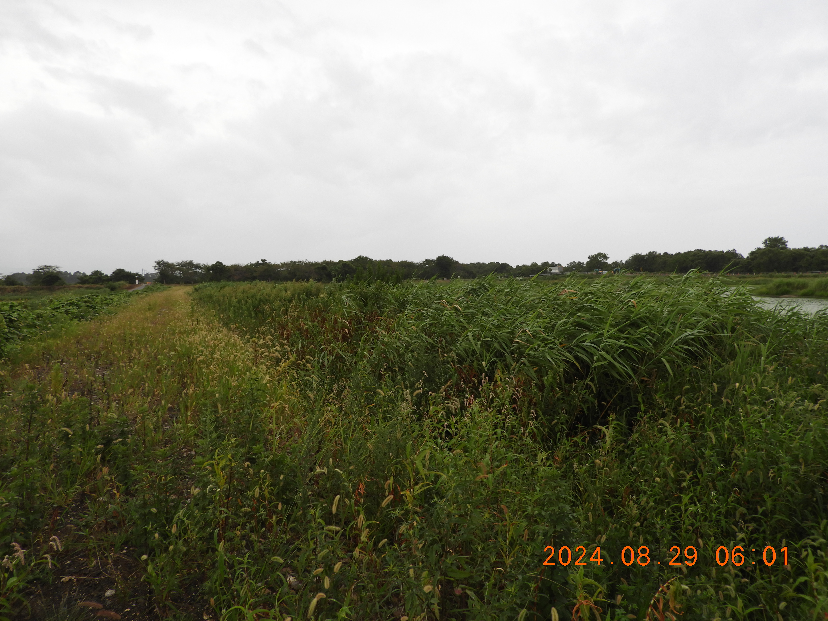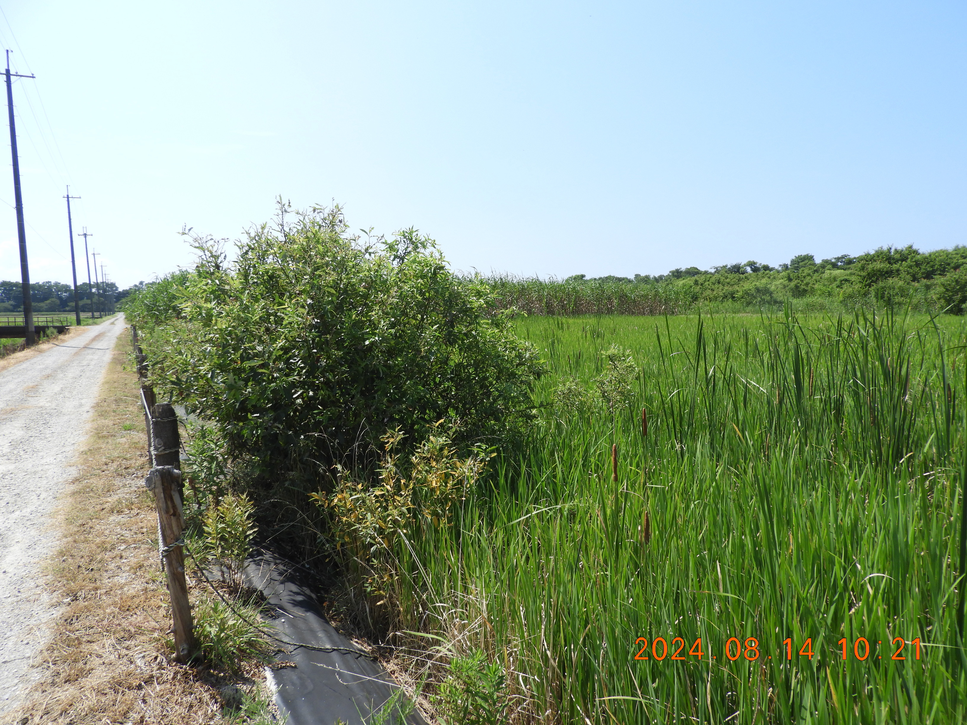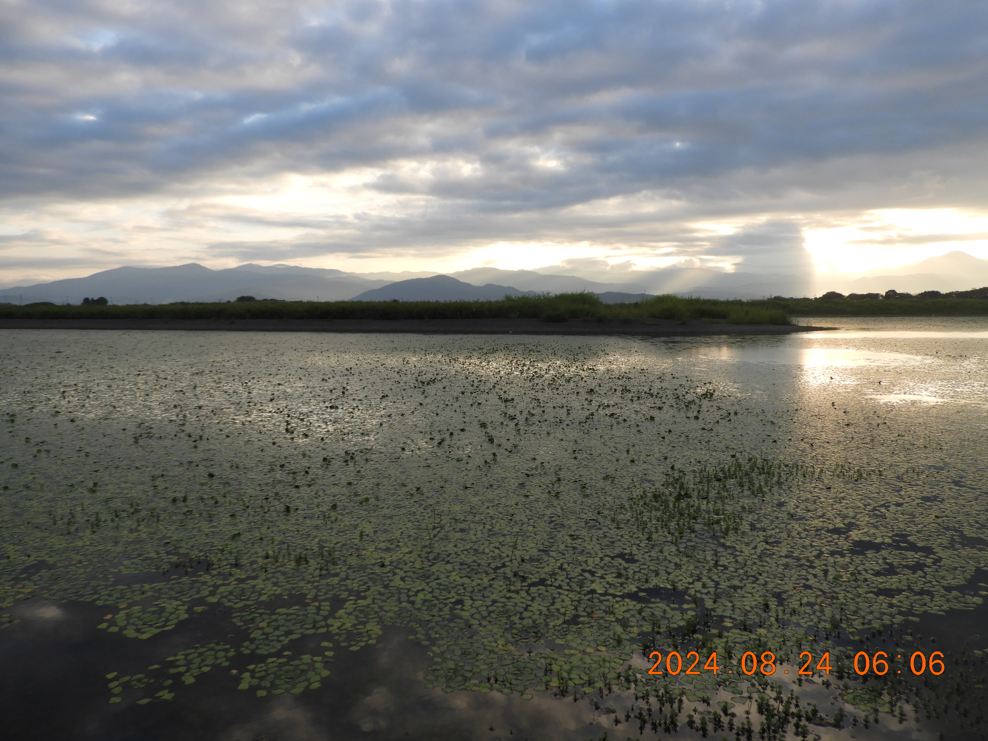 東からの撮影 中央部分の仮設道路の後は少しヒシの繁殖も少ないです。