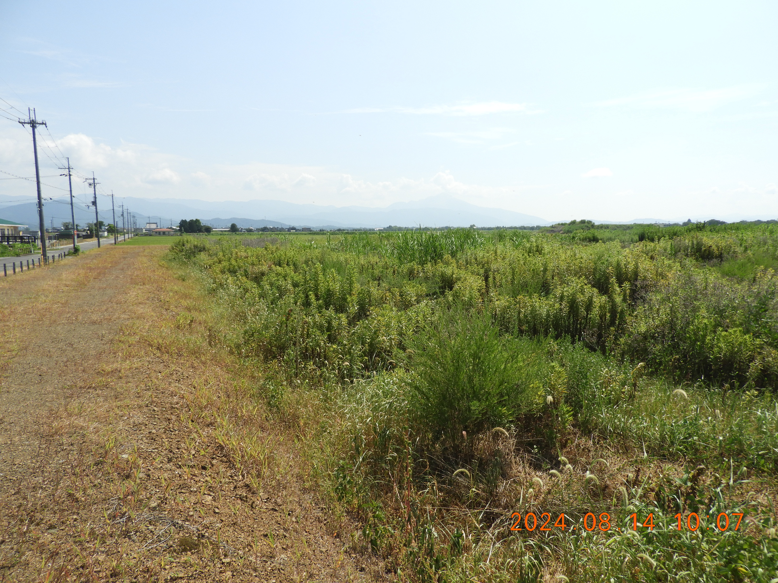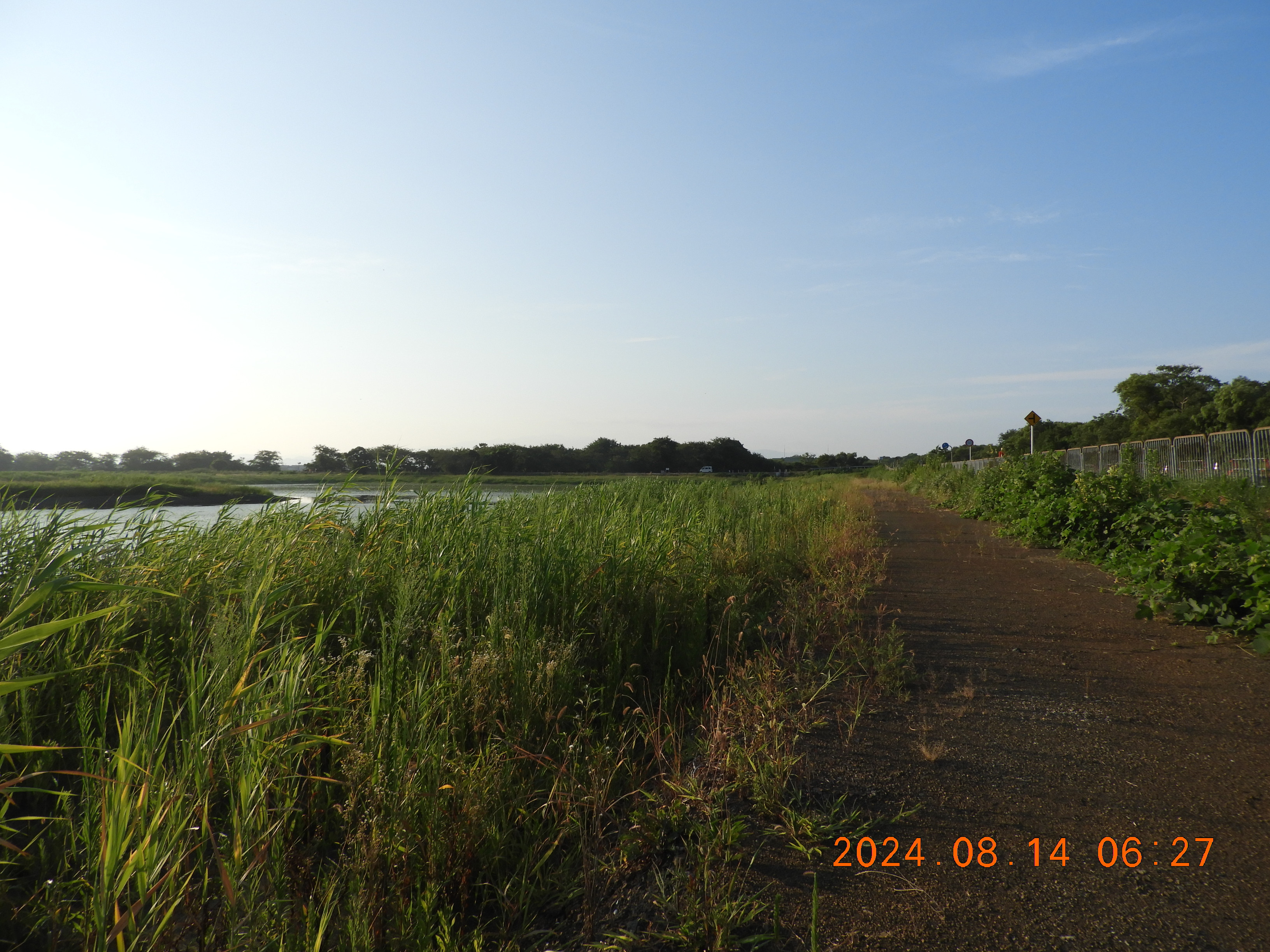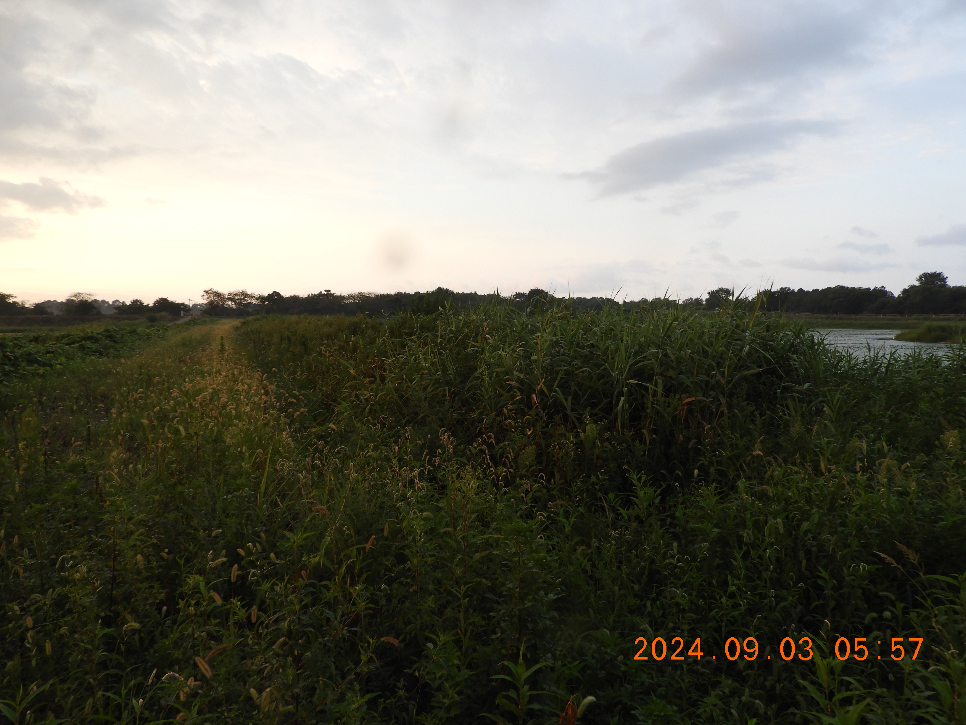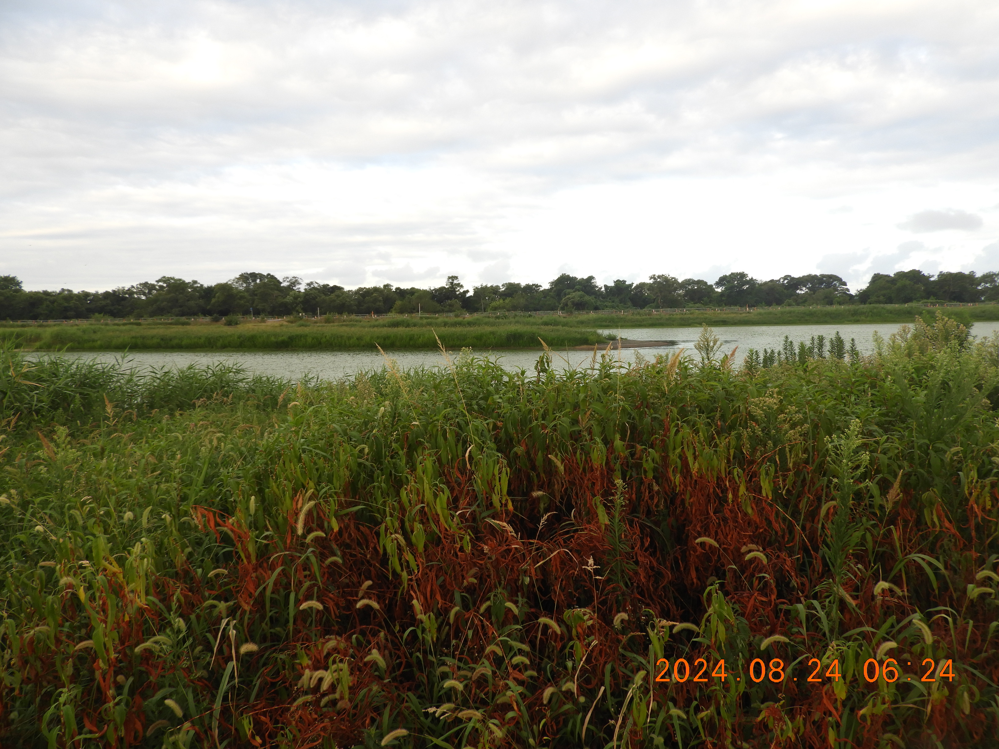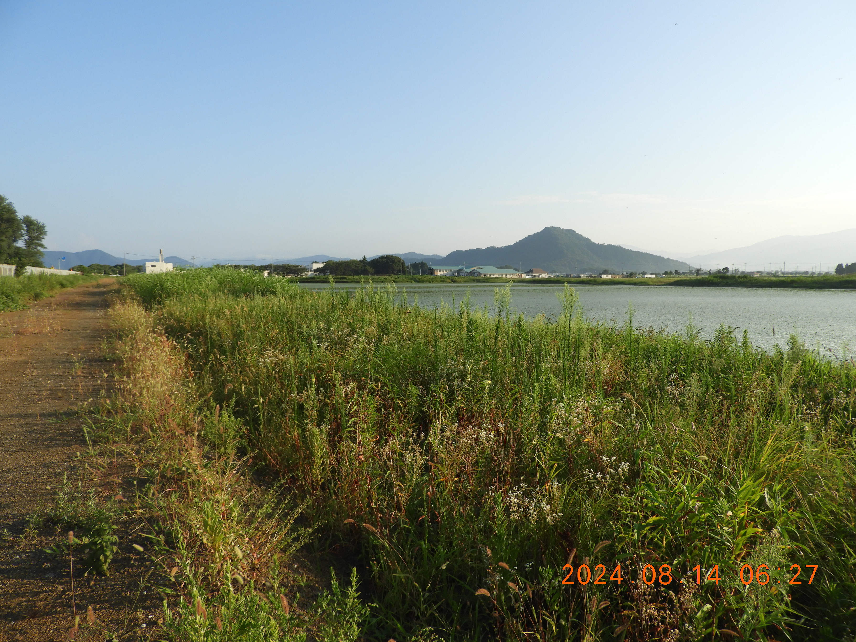 東からの撮影 中央部分の仮設道路の後は少しヒシの繁殖も少ないです。
