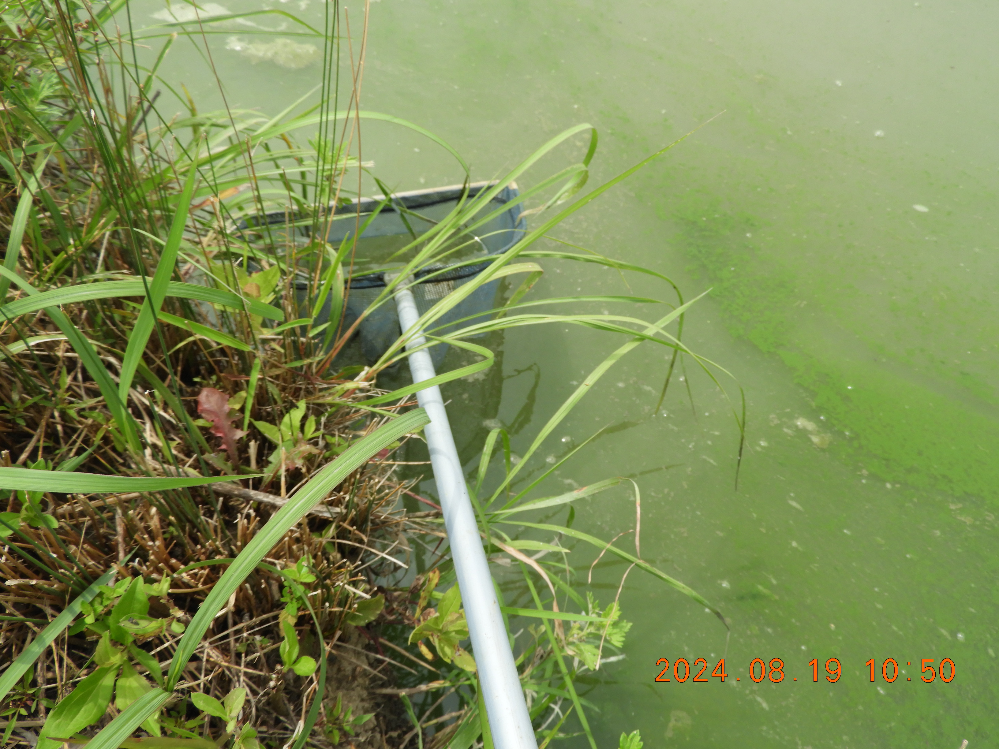 アオコで岸は緑です。