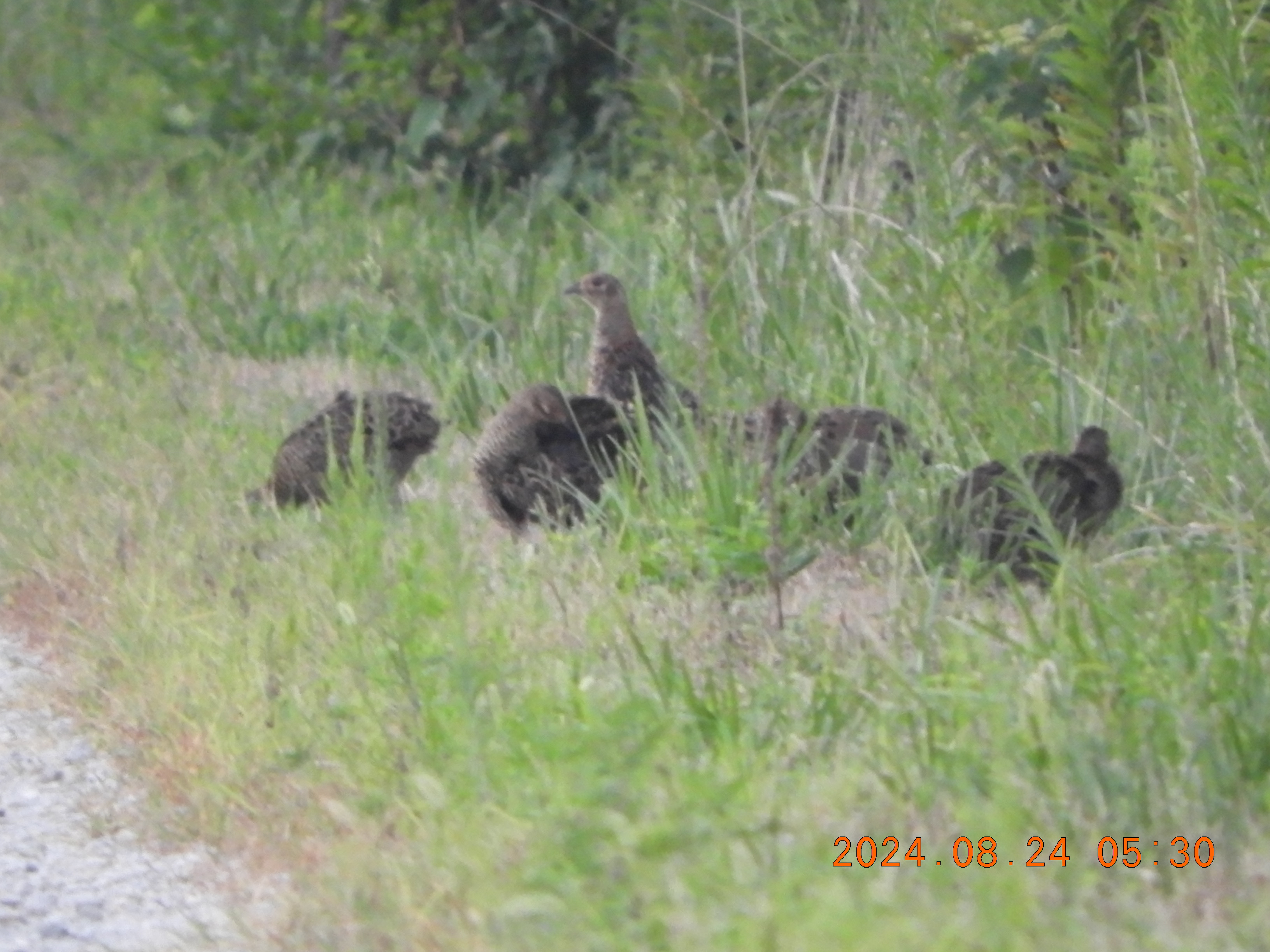 今朝は、6羽のキジの子供が道端にいます。遠くからの撮影で霞んでいるようですが