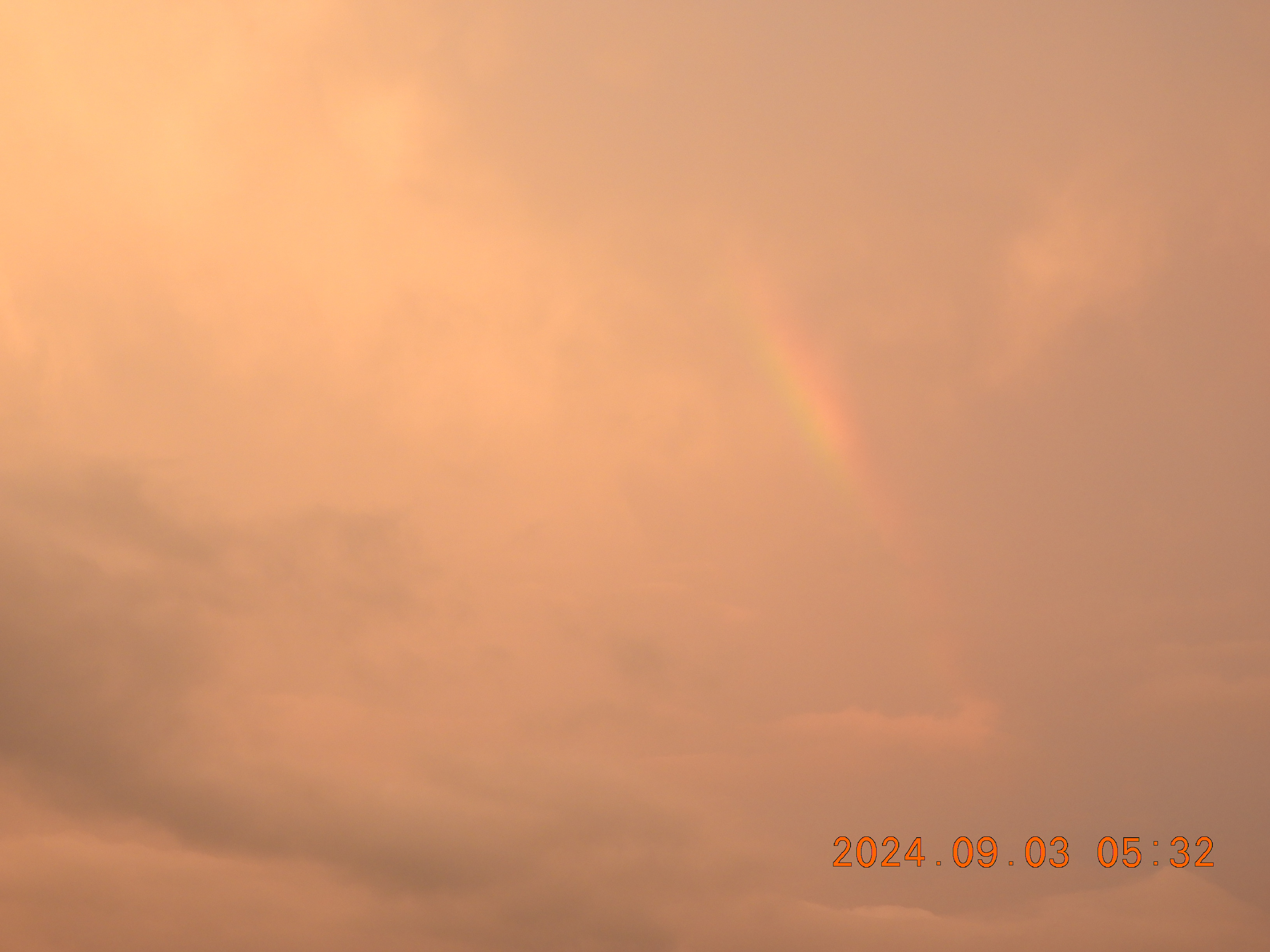 西の空には、雲間に小さな虹が出ています。