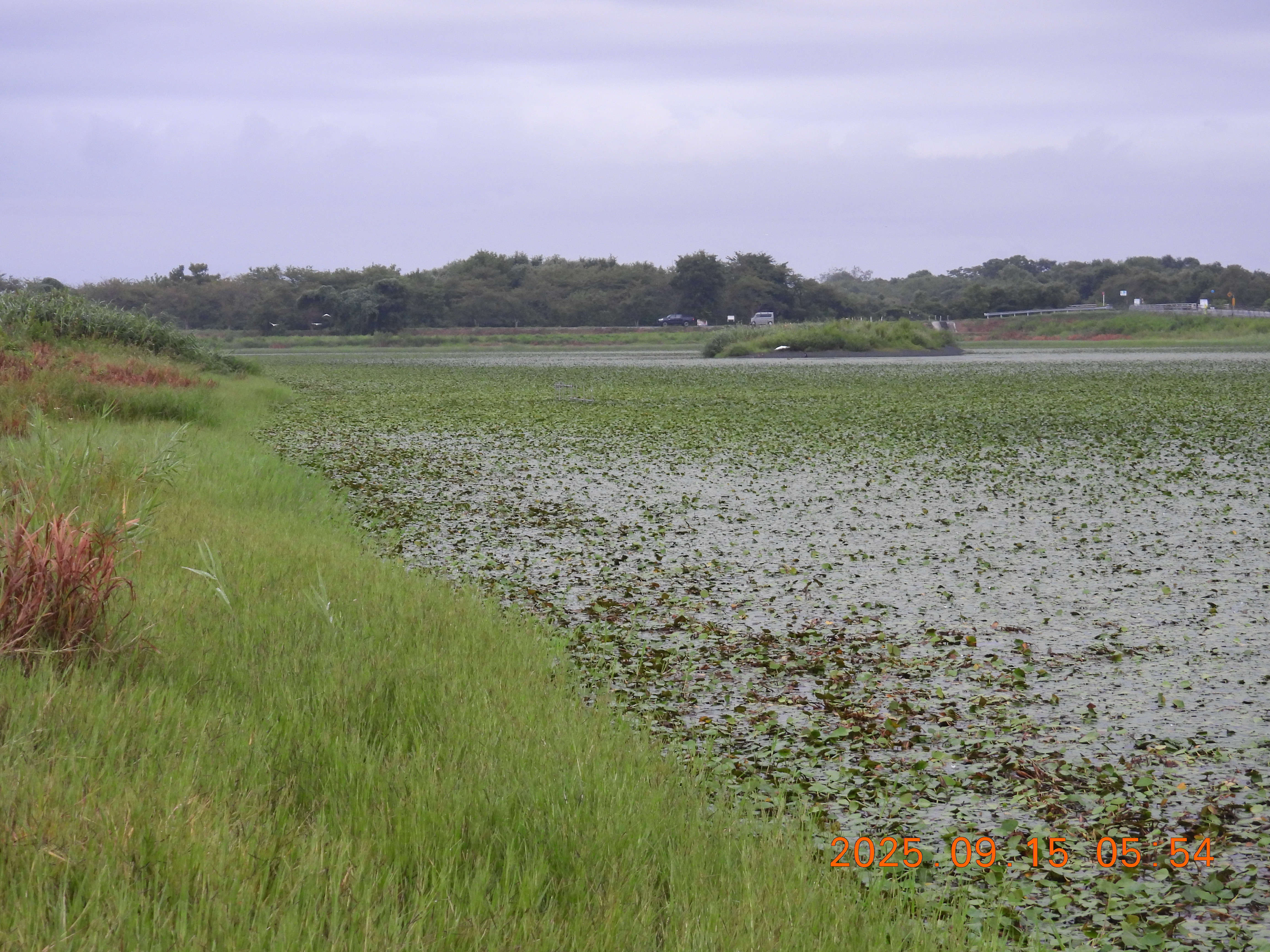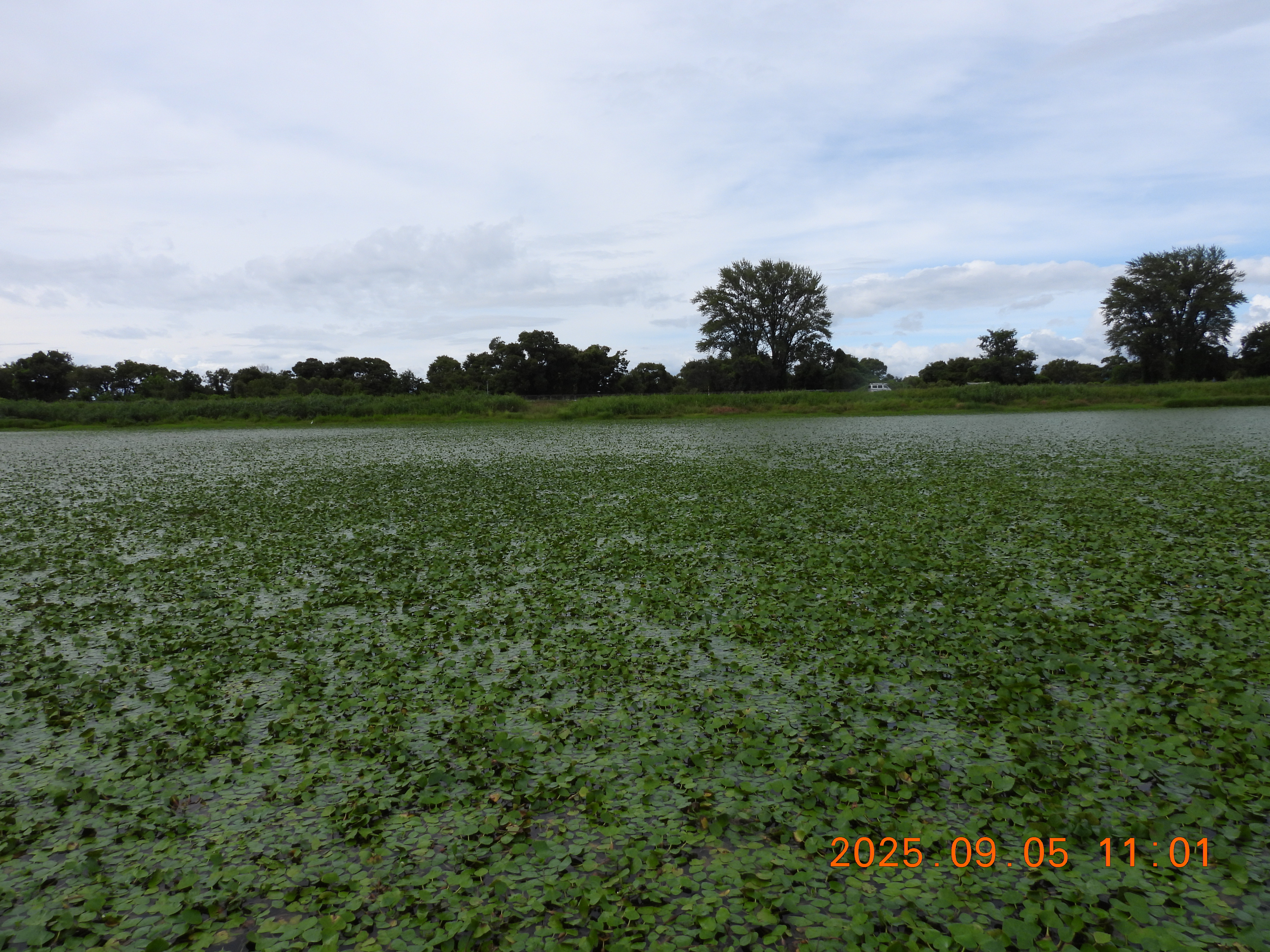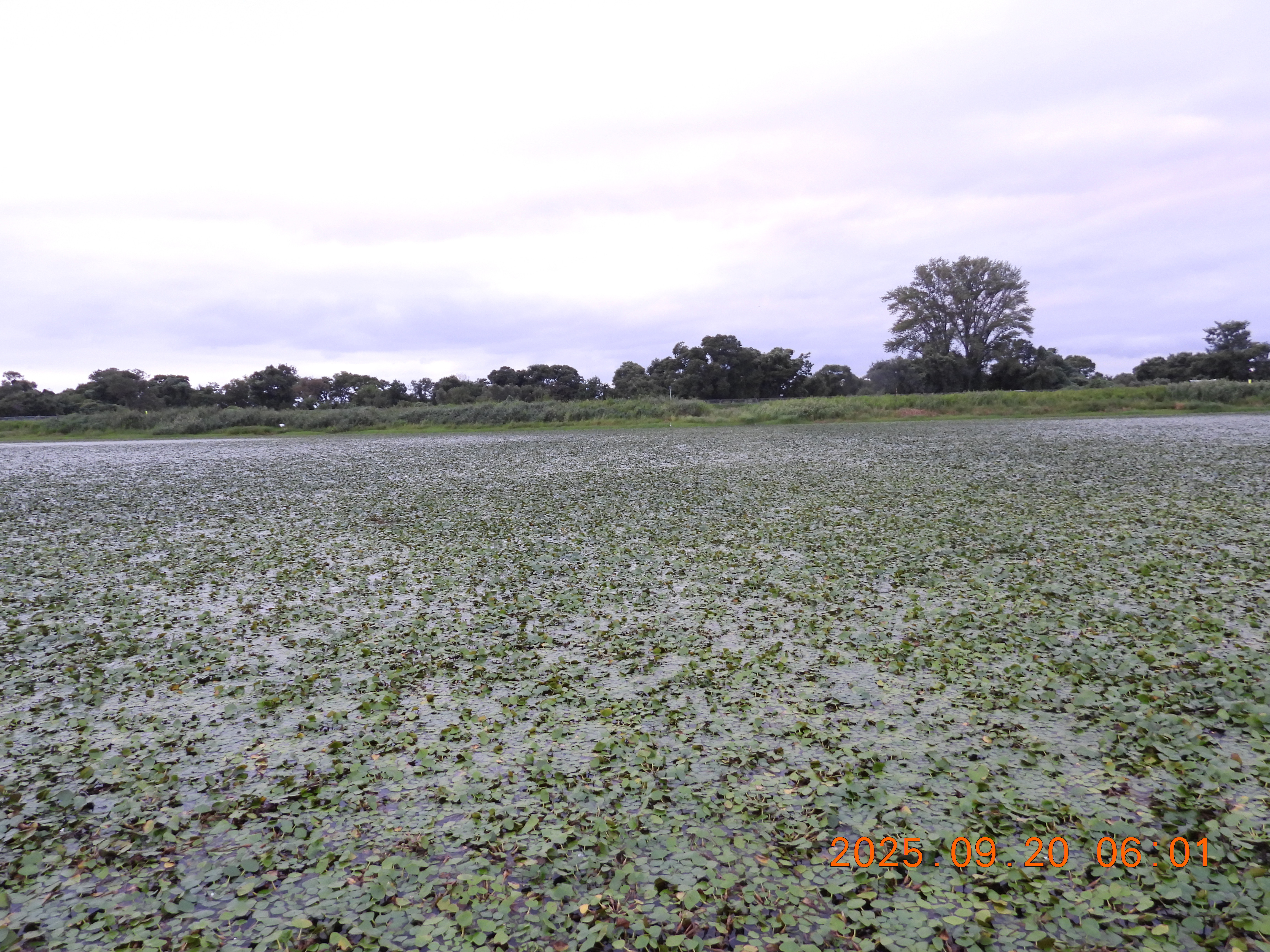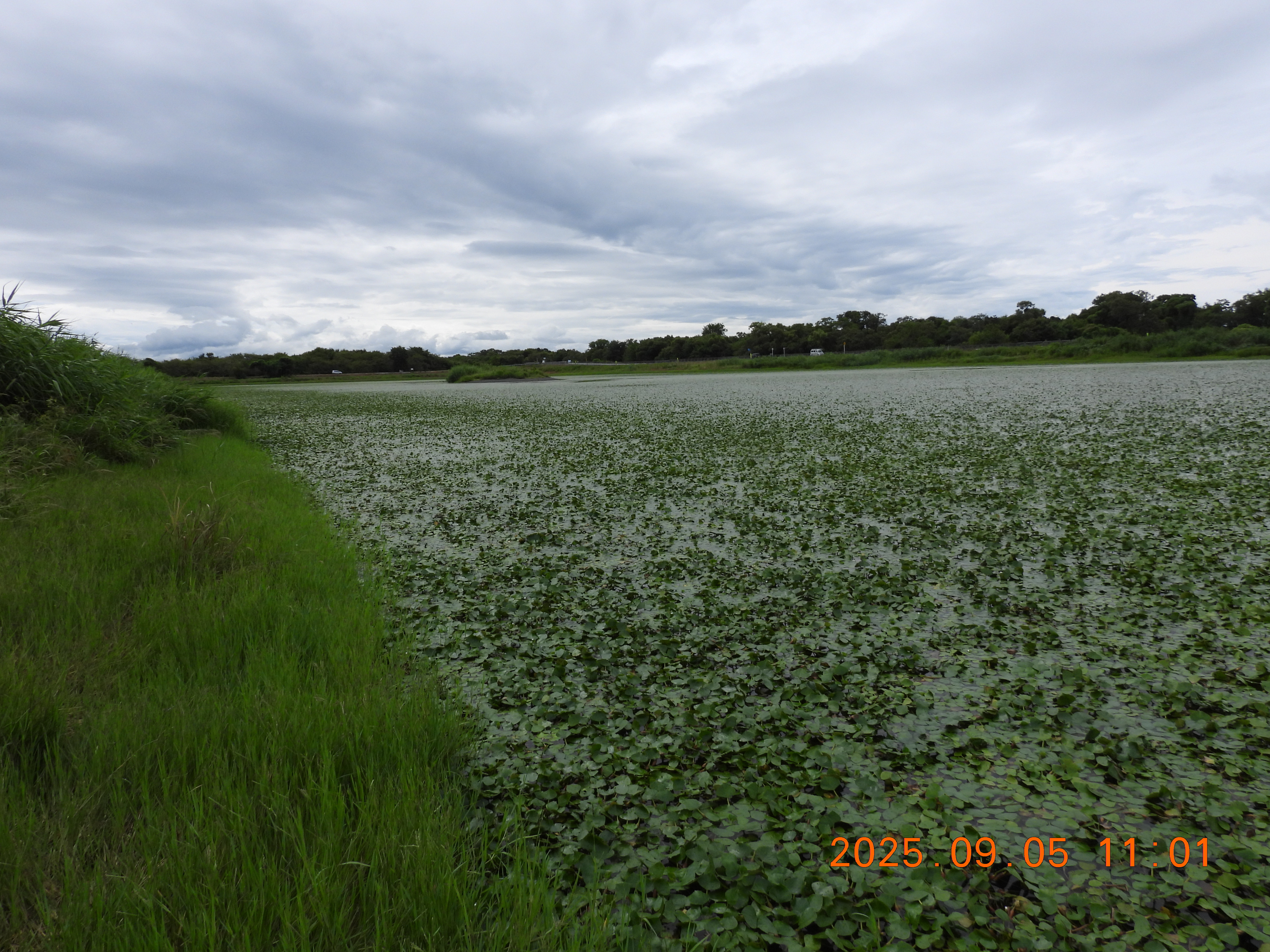 堤防の草が刈られているので法面と水面がよくわかります。水面はヒシで蔽われています。
