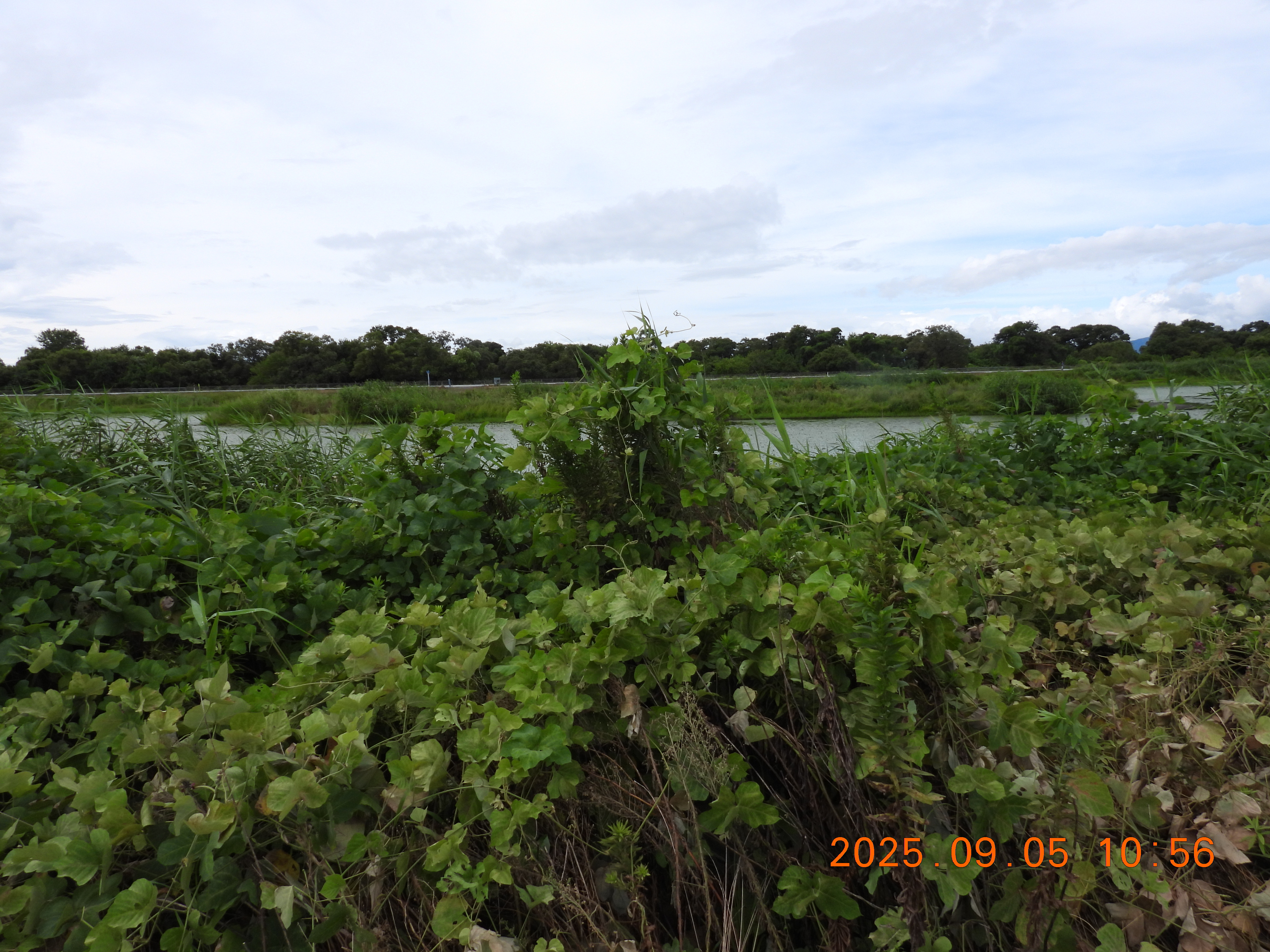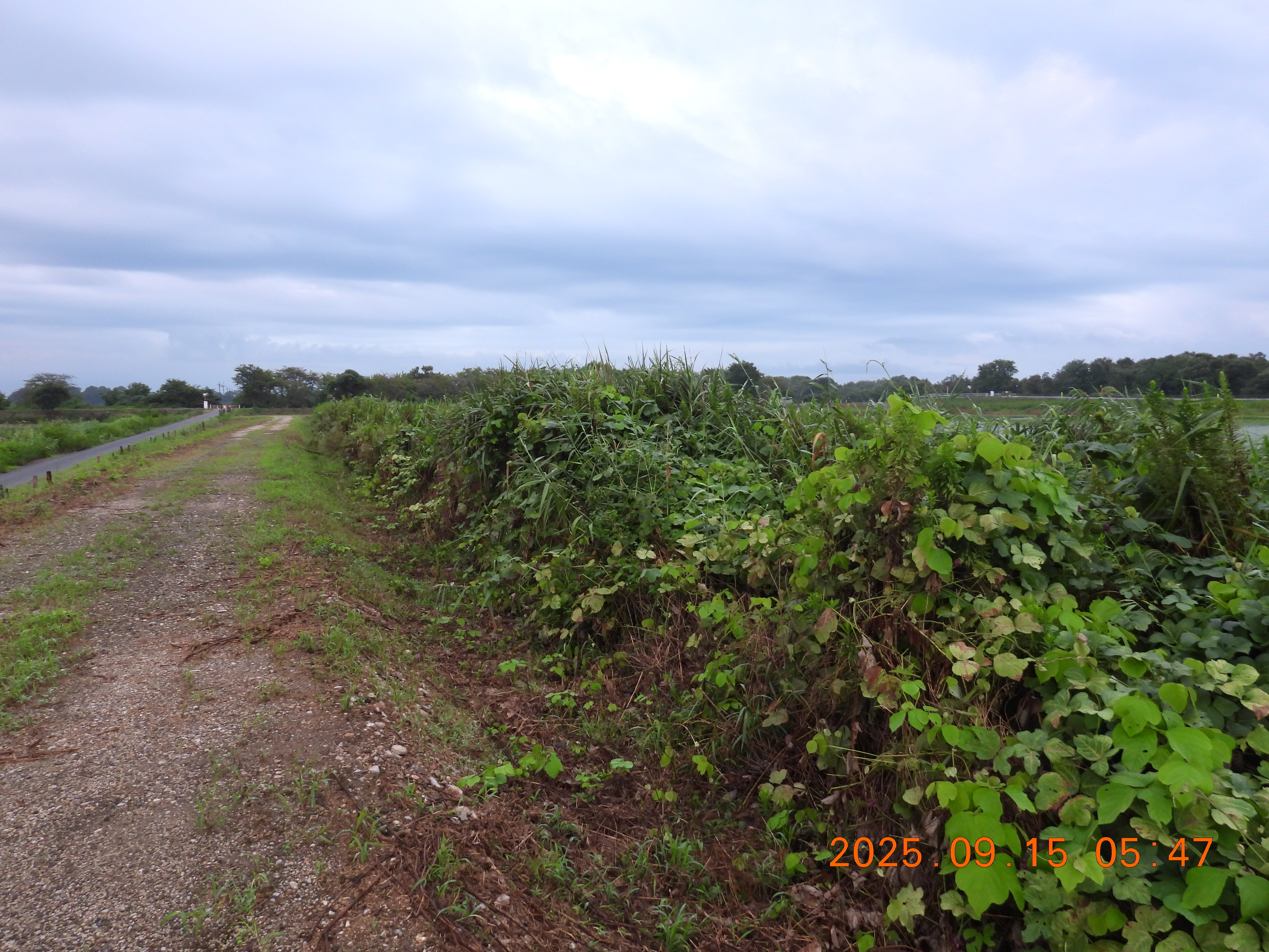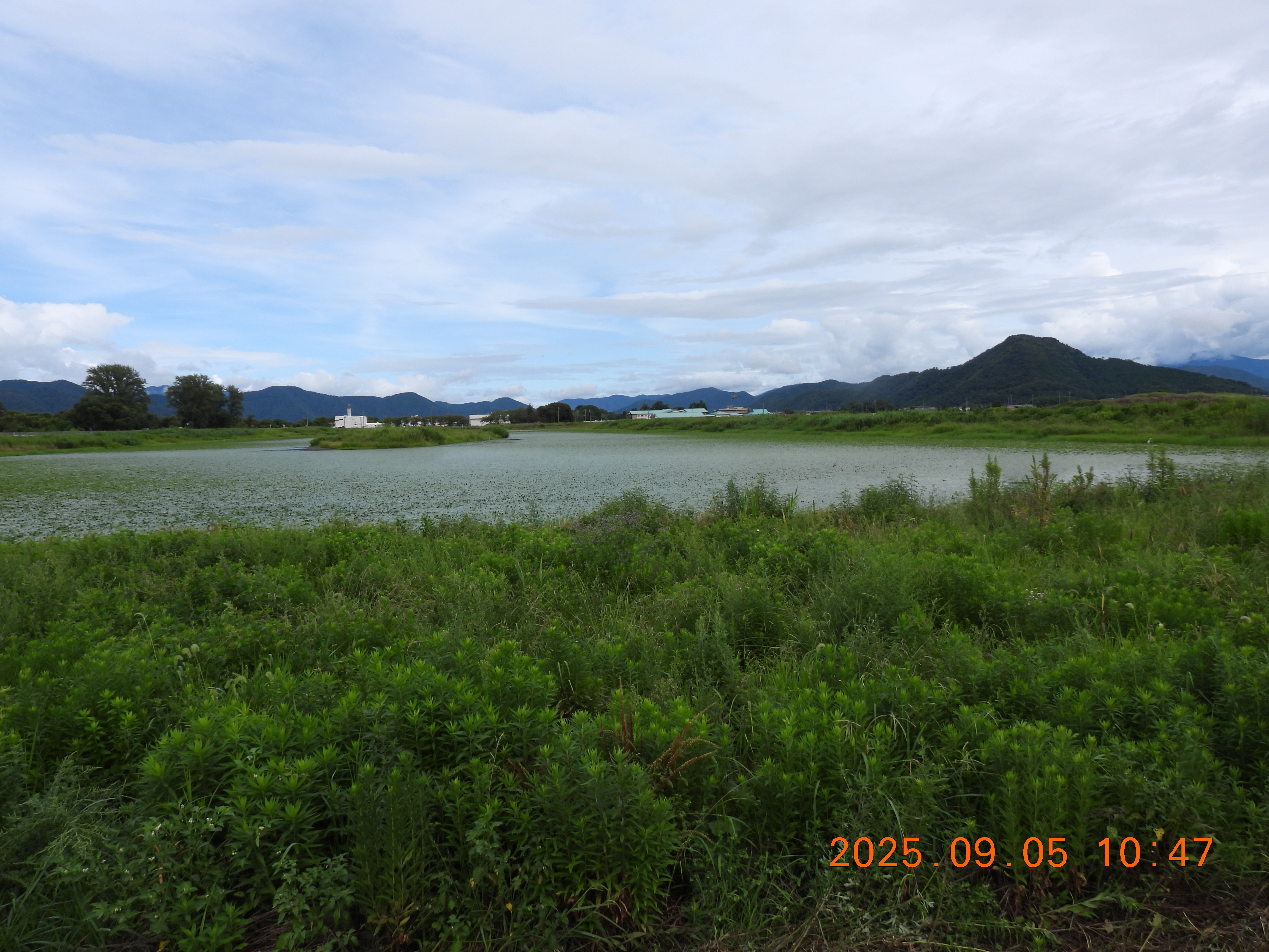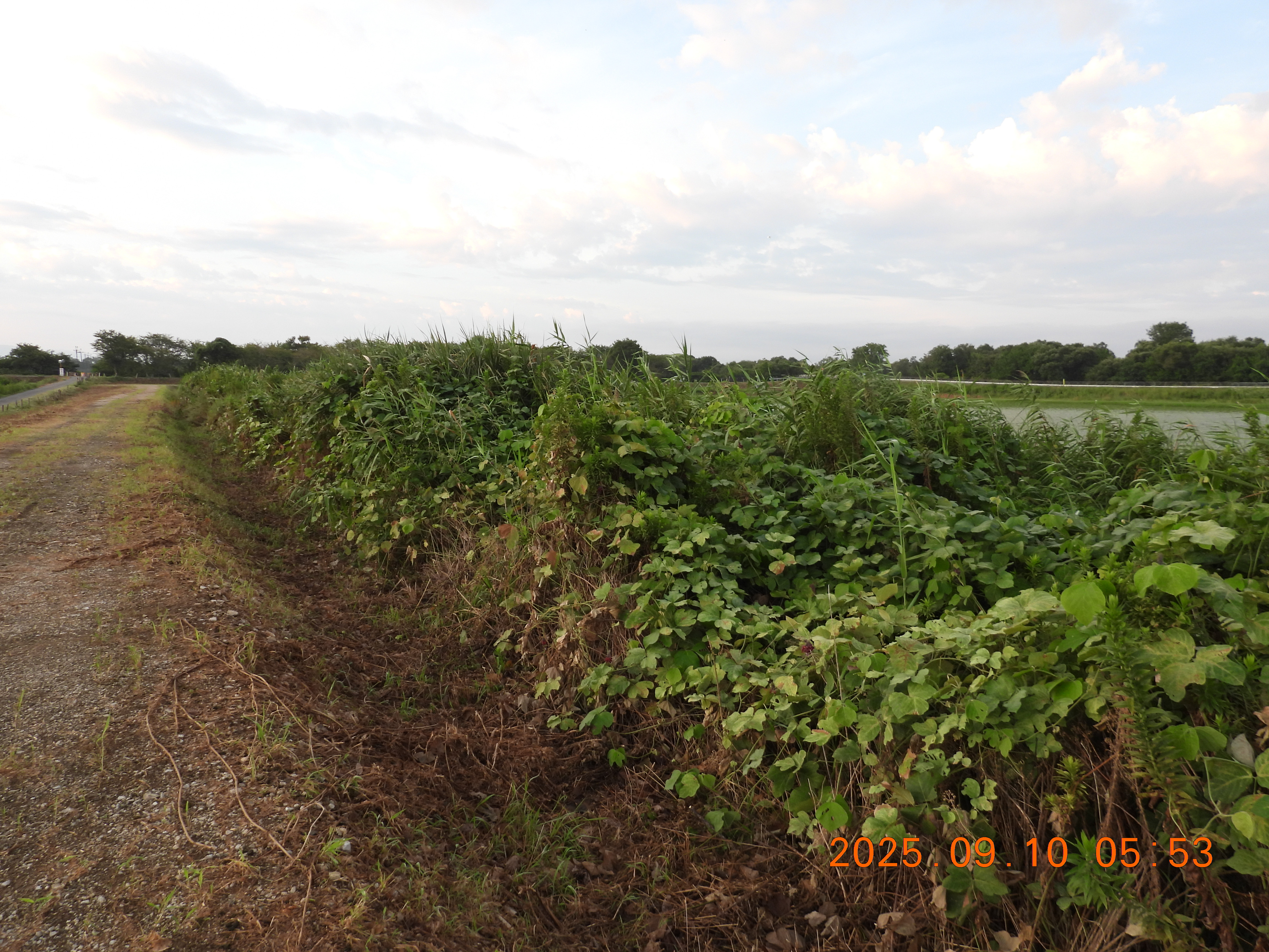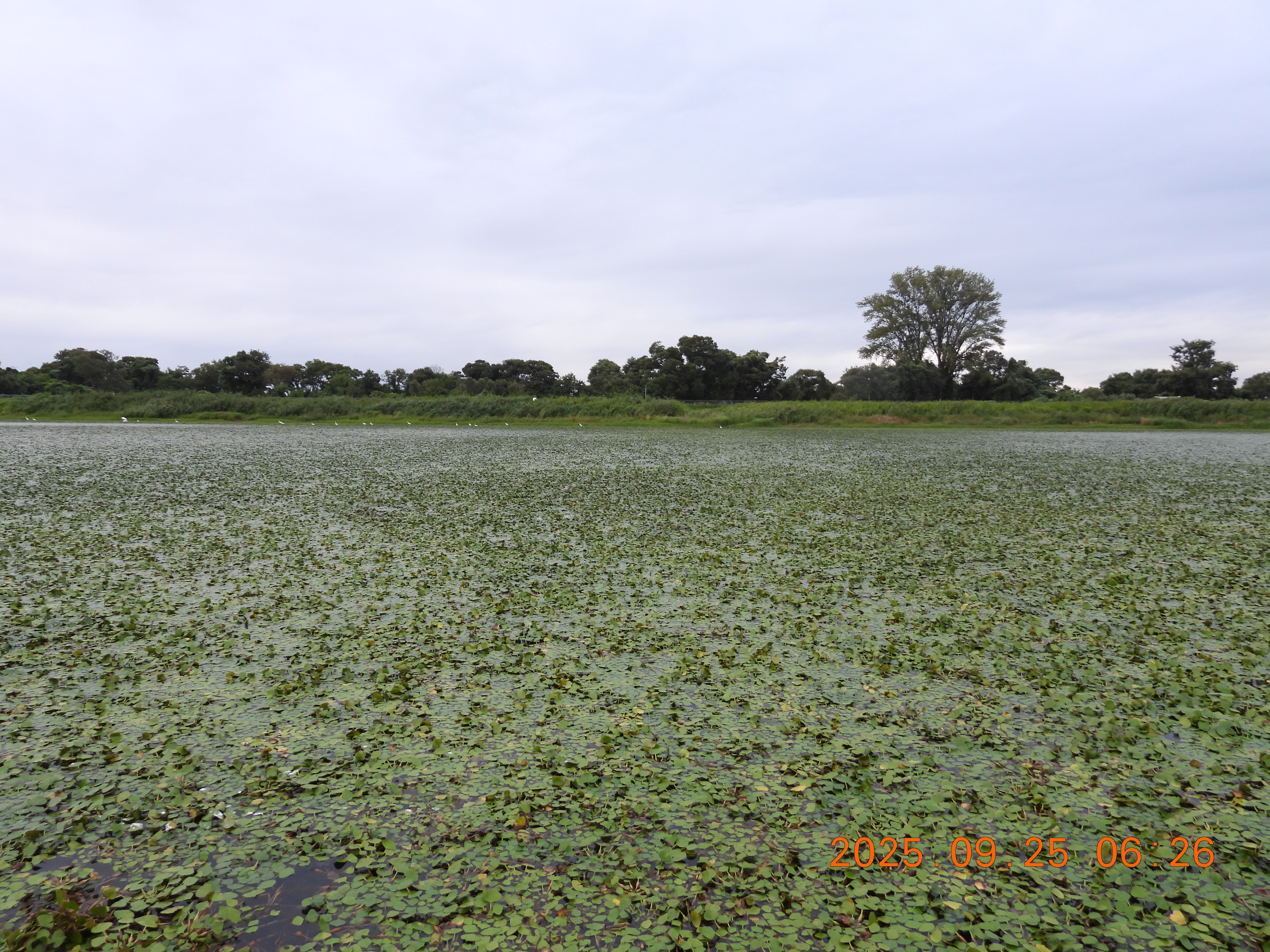 堤防の草が刈られているので法面と水面がよくわかります。水面はヒシで蔽われています。