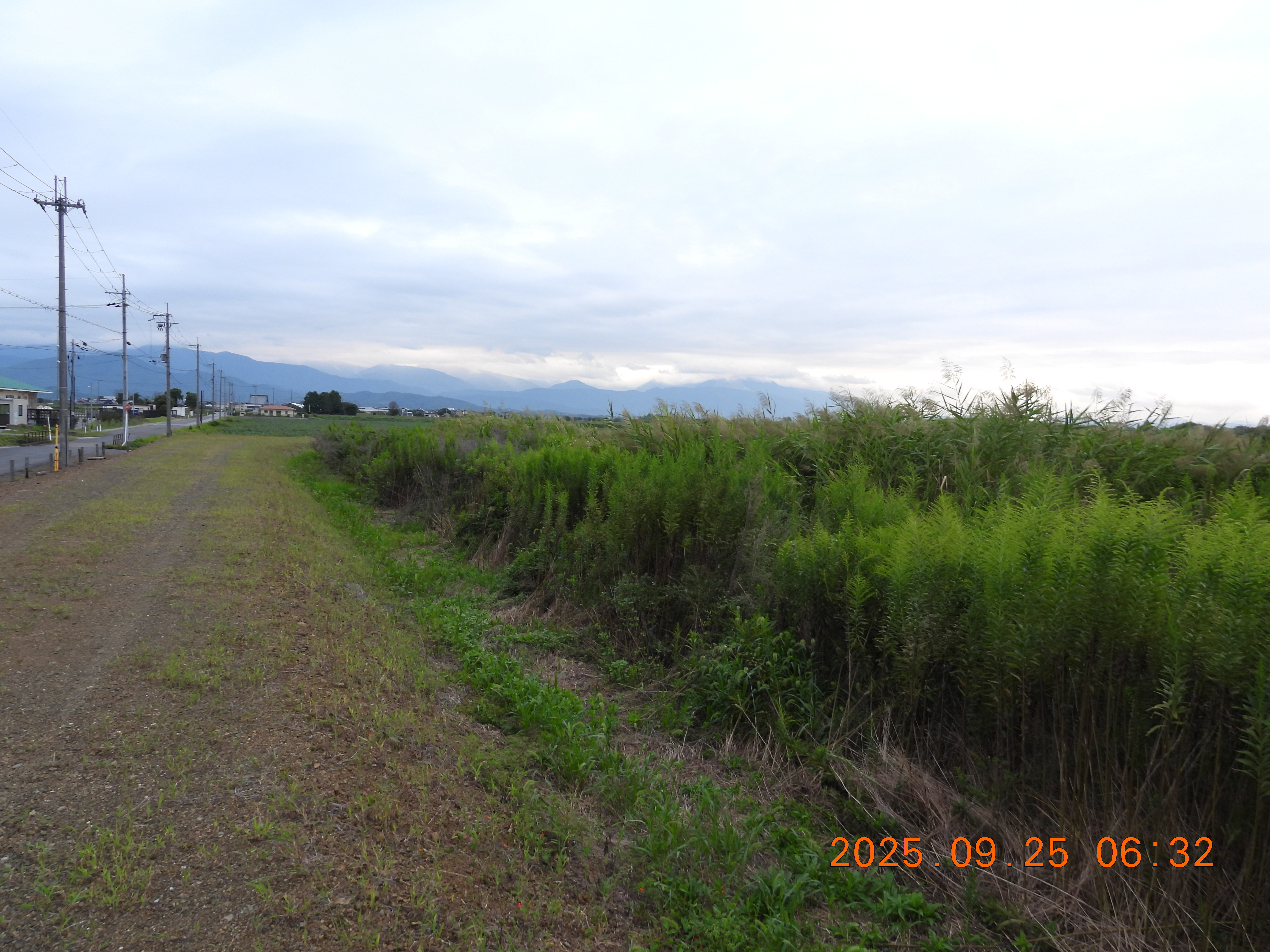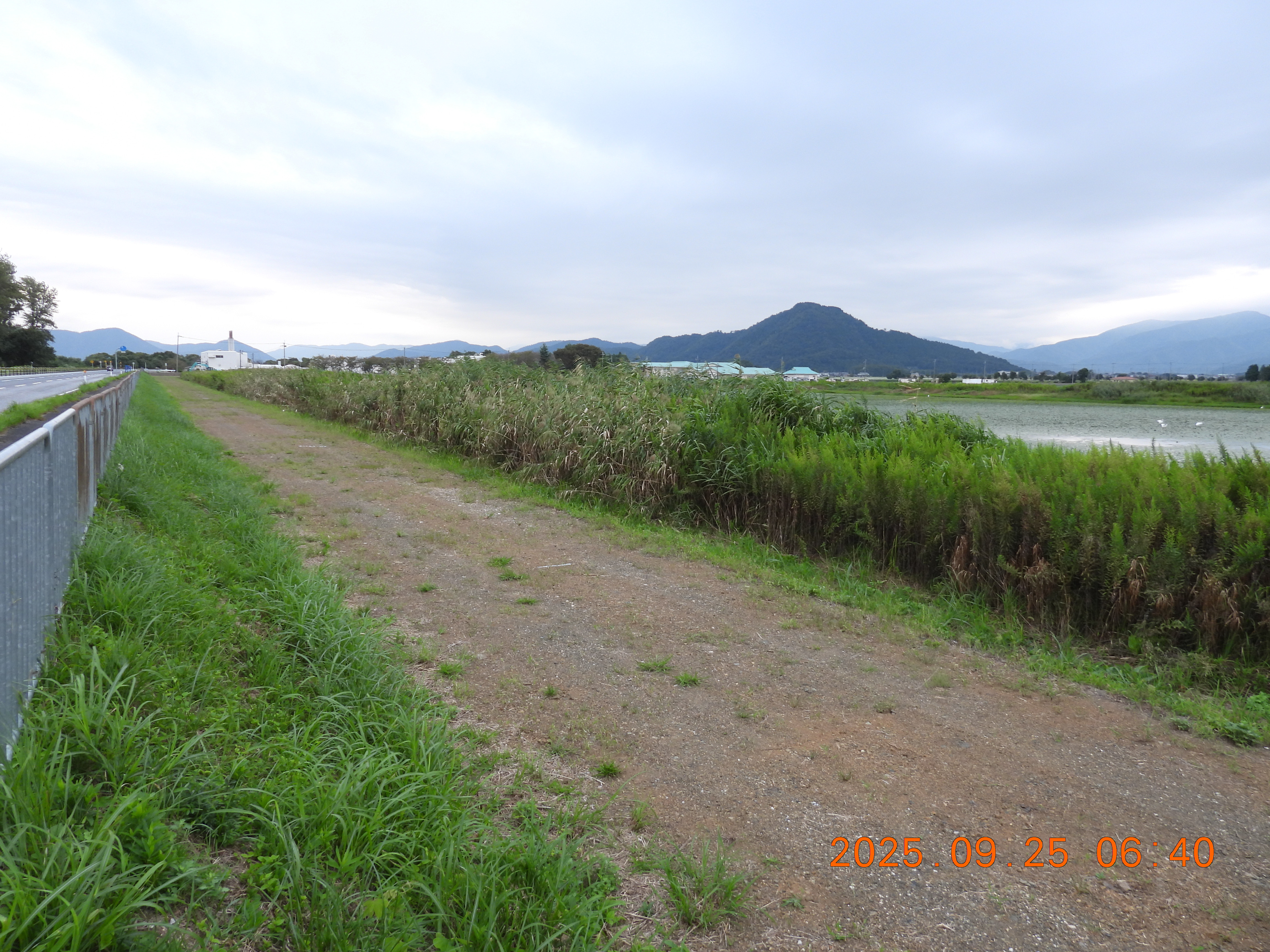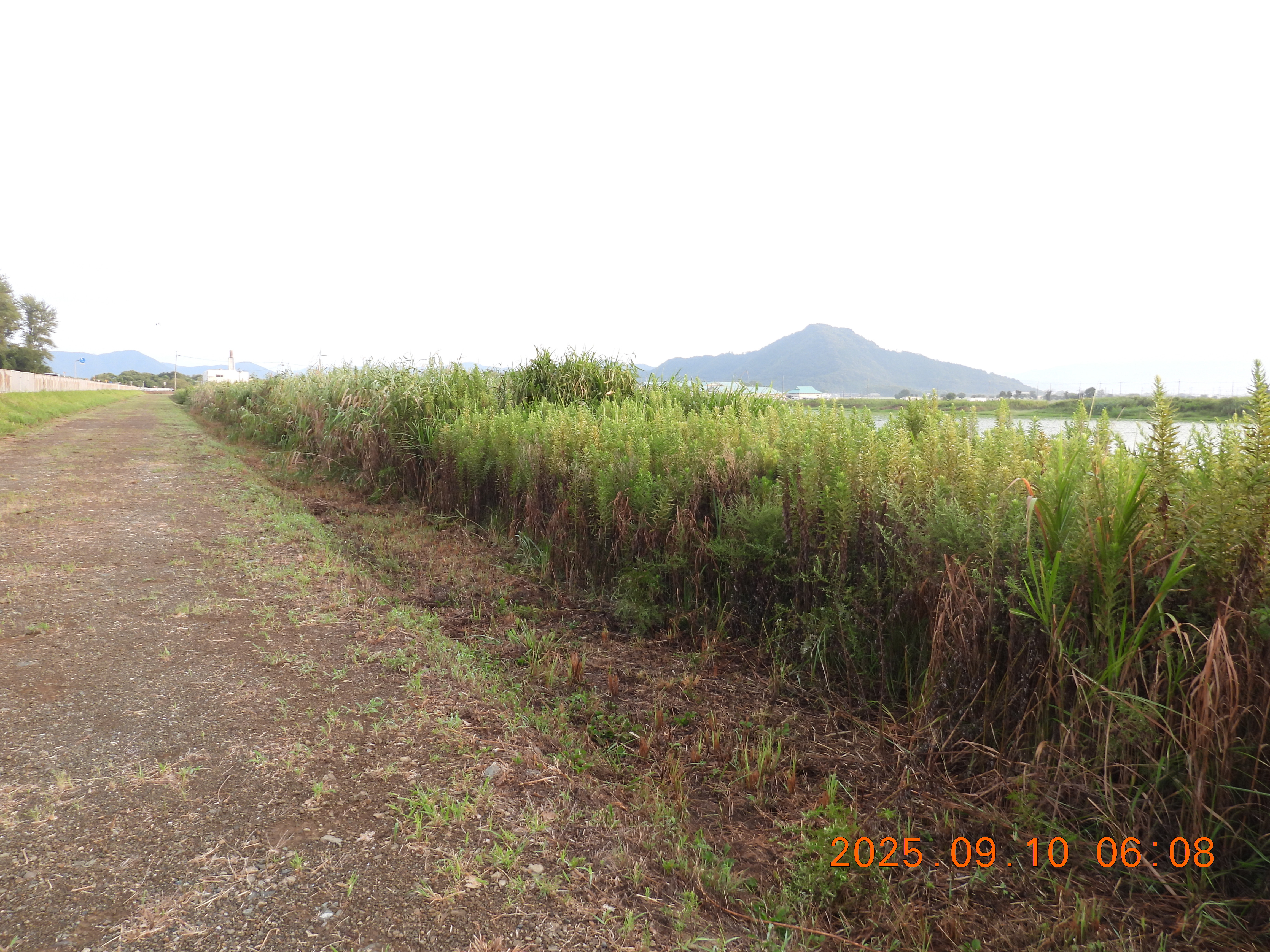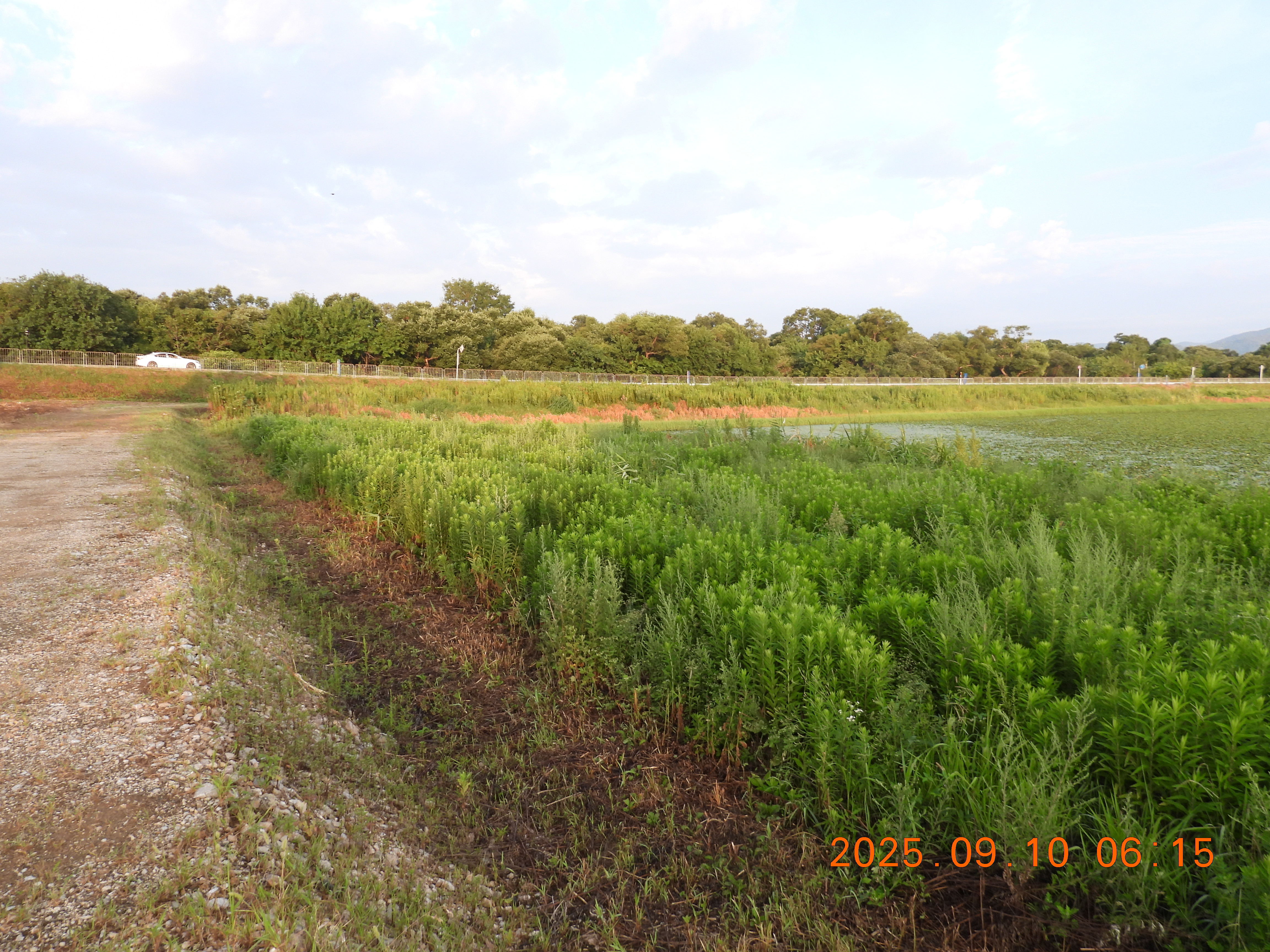 堤防の草が刈られているので法面と水面がよくわかります。水面はヒシで蔽われています。