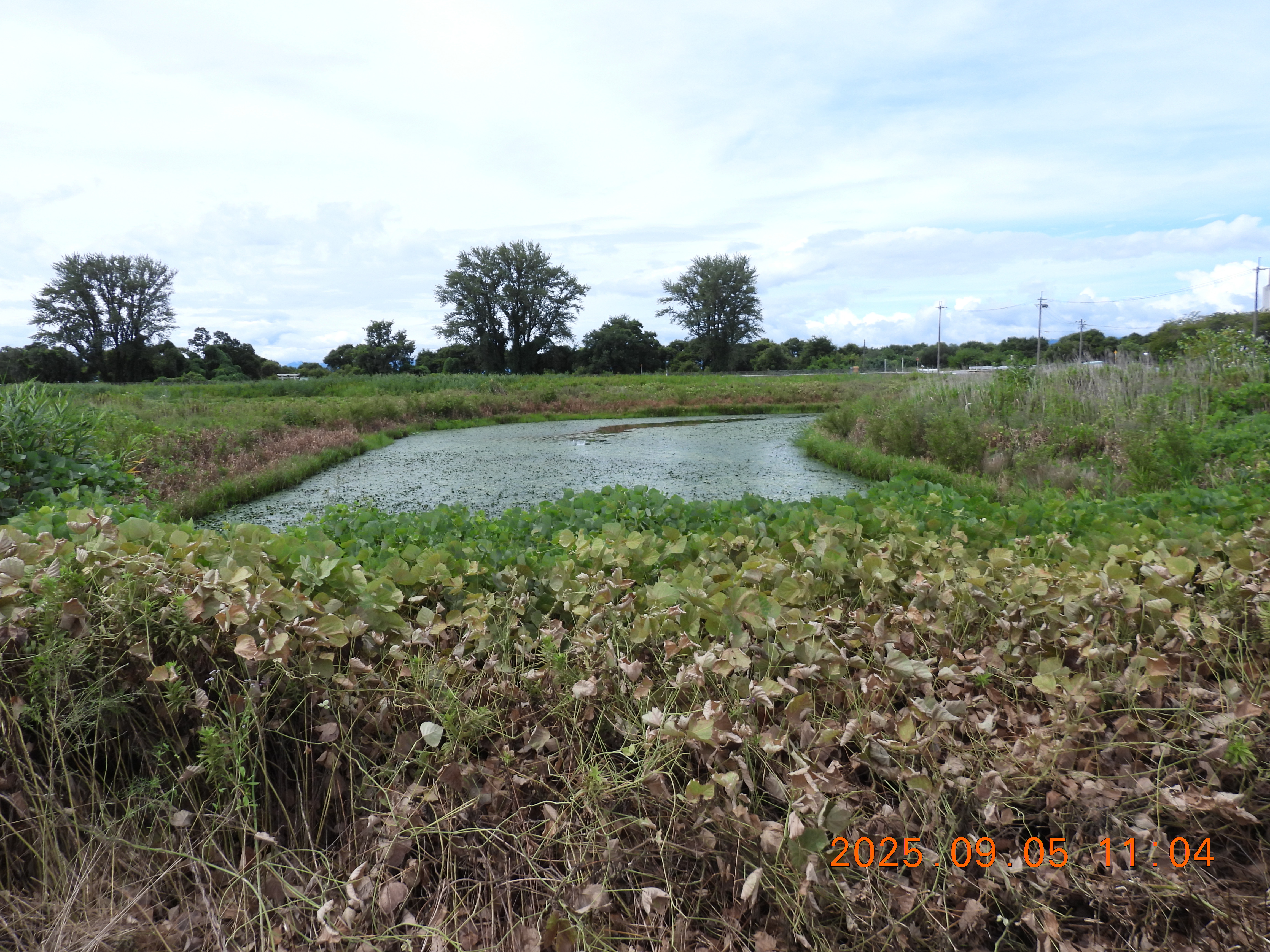 マコモ原 今年は水不足と暑さでマコモは、いろんな草に負けてきています。