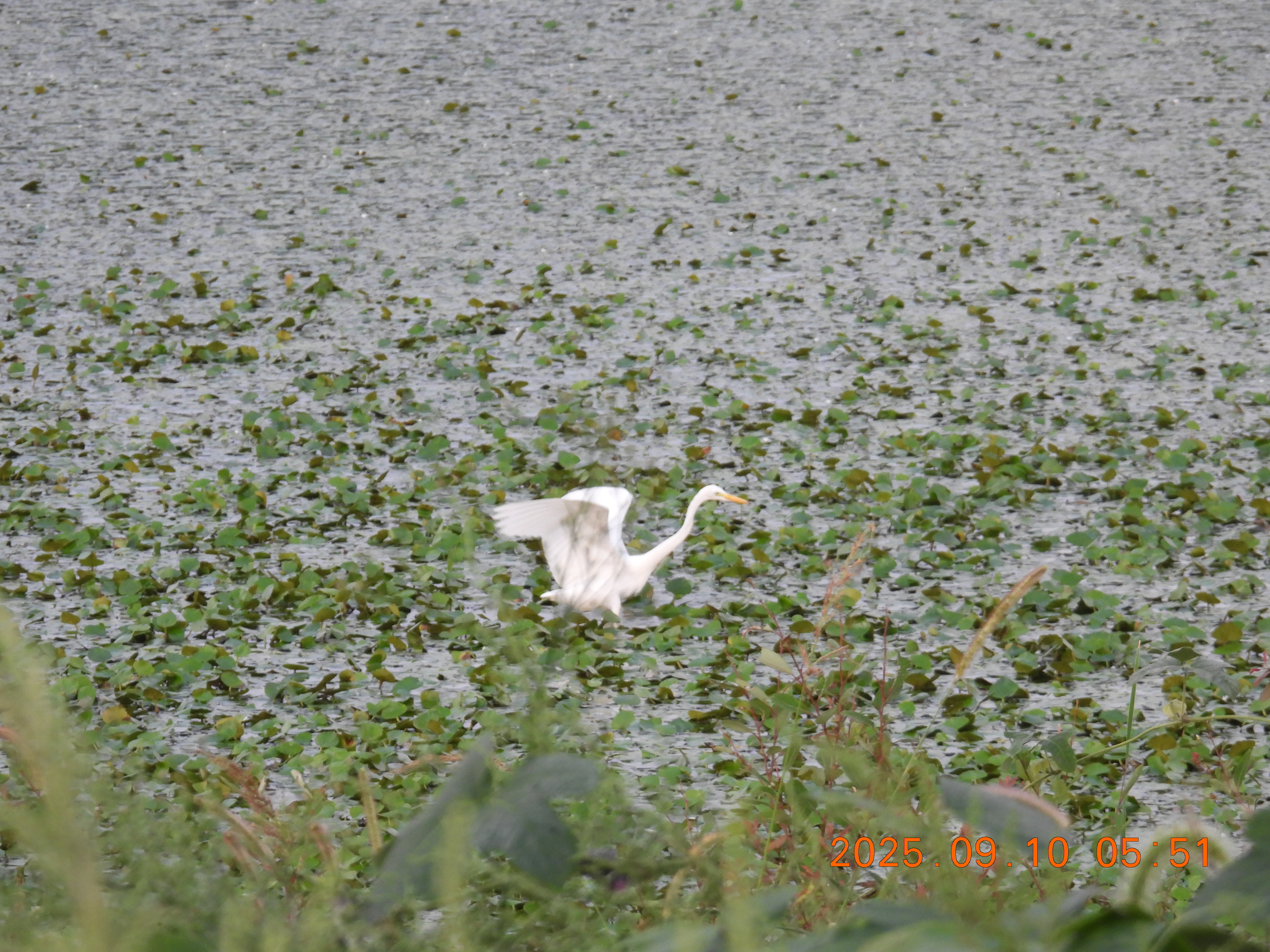 ヒシの上を羽ばたきながらの朝食探し