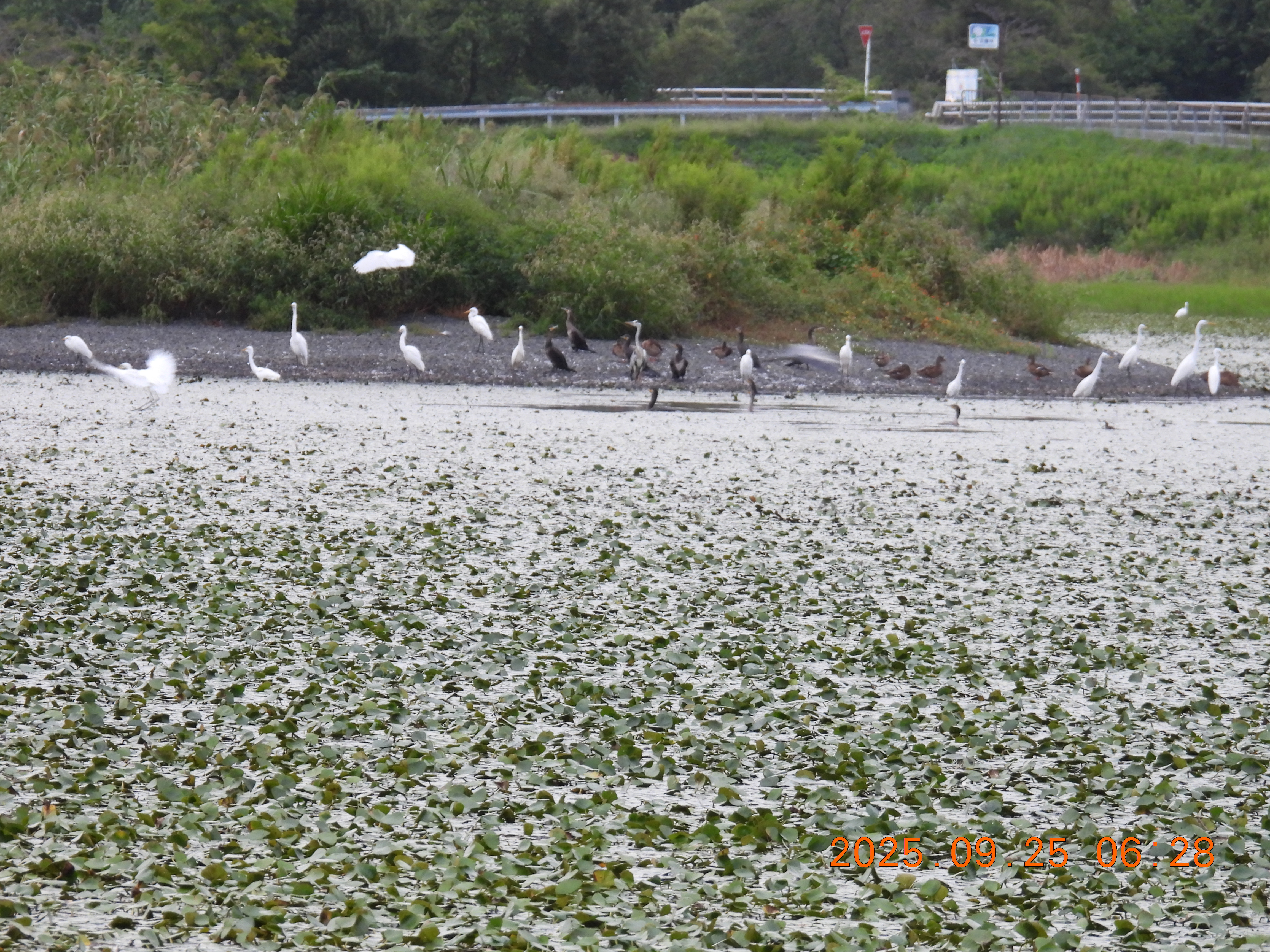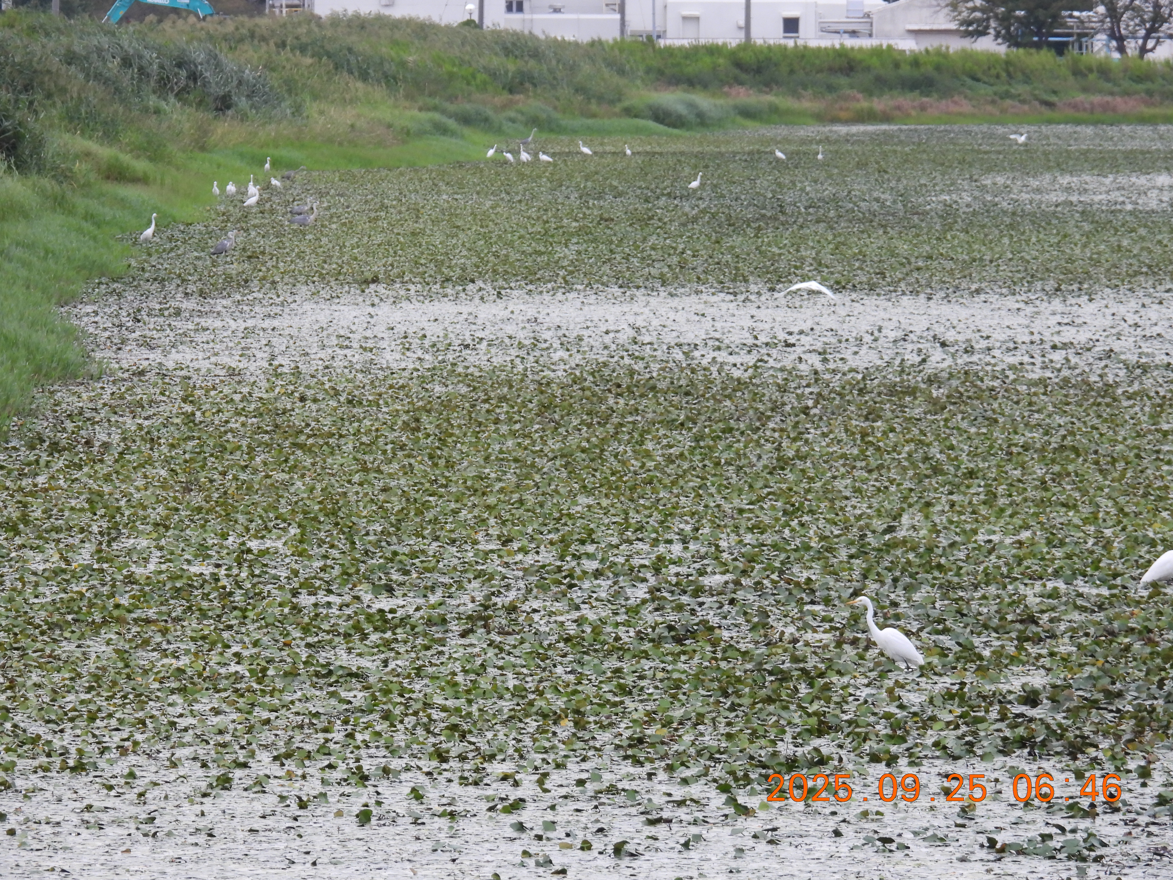 チュウサギが主ですが、今朝は70羽近く来ています。