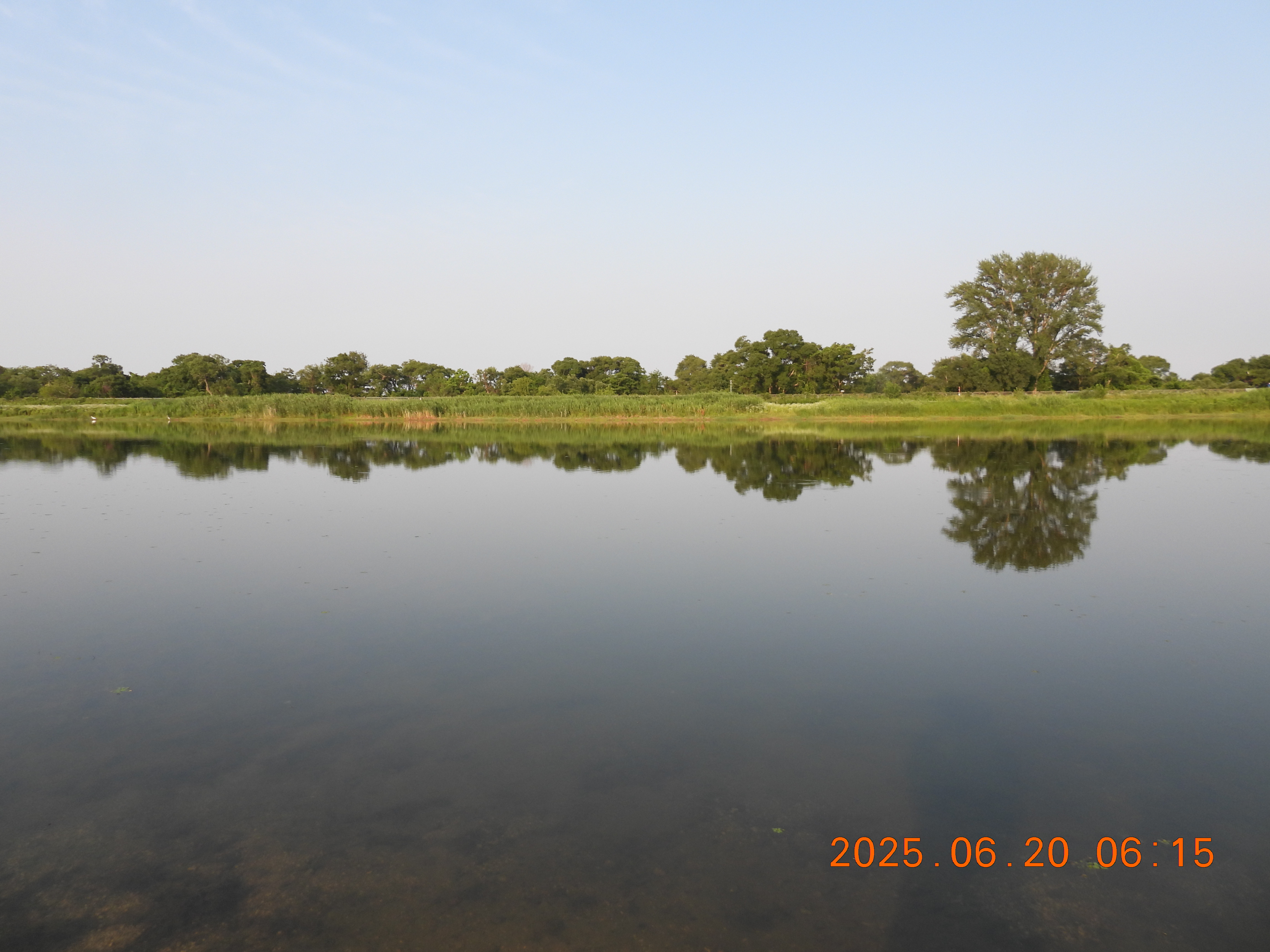 今朝は、風もなく水面も鏡面のごとく静かです。鳥の姿も見つかりません。