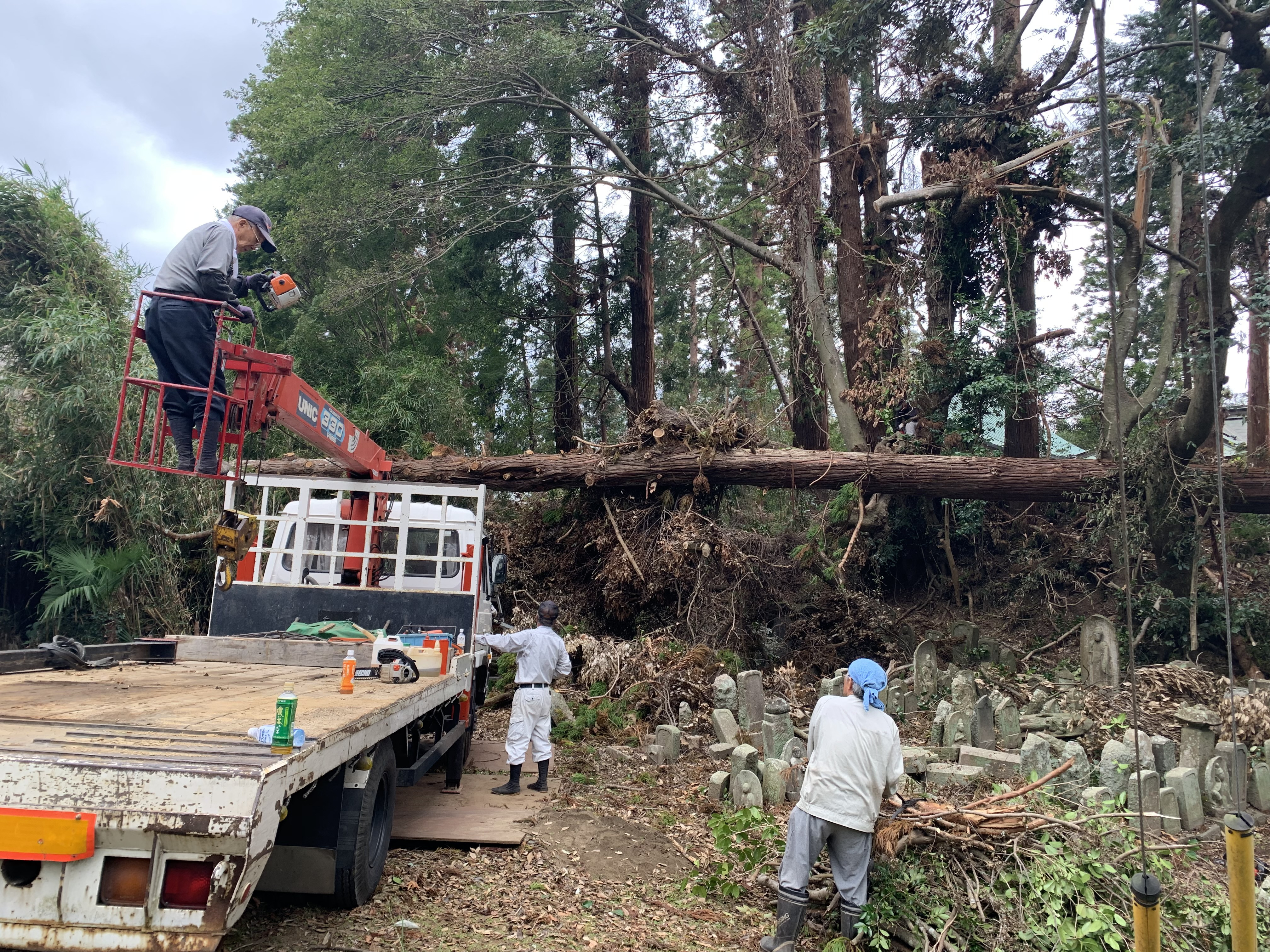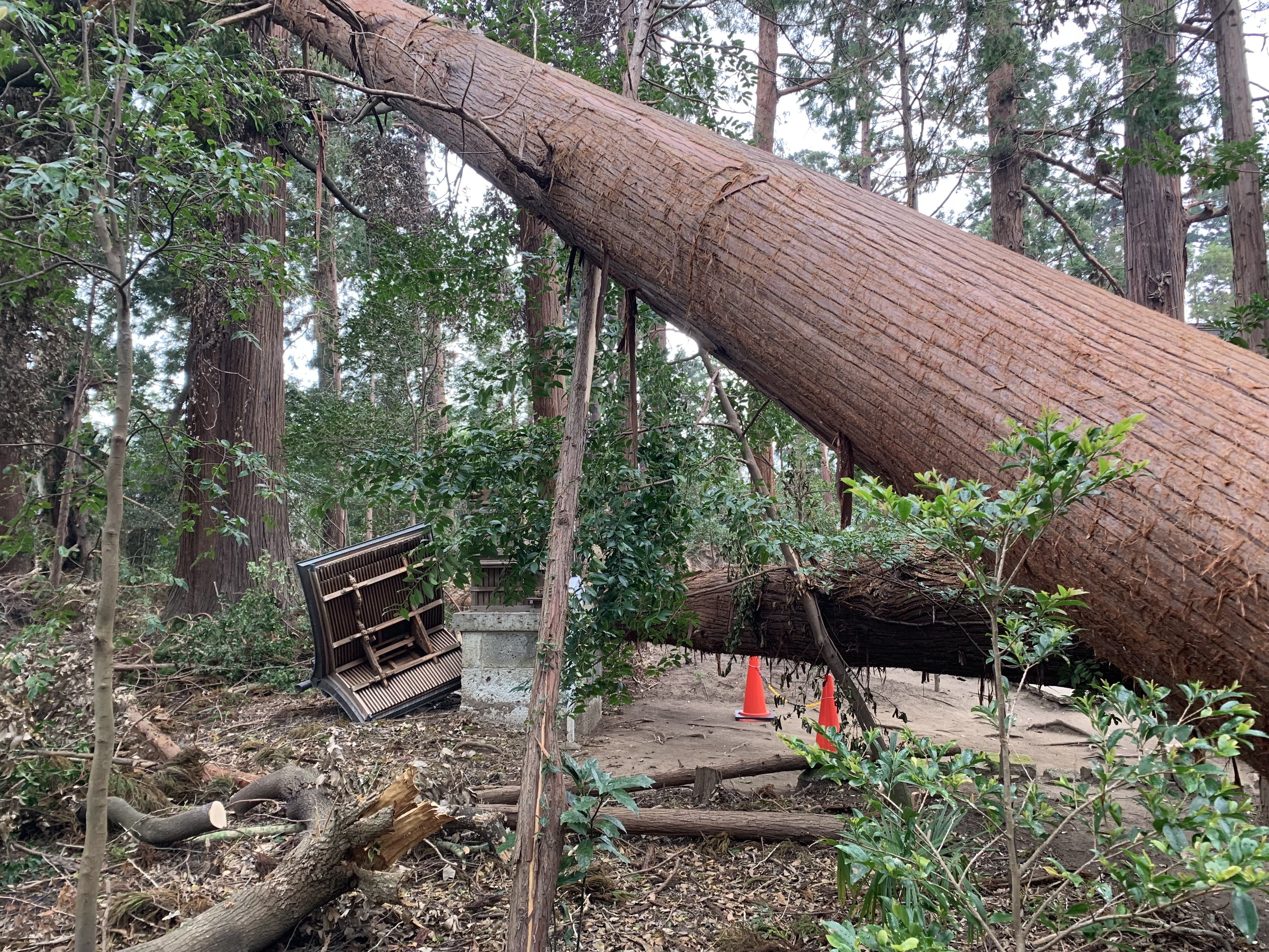 常日頃、当宮にご崇敬を賜り厚く御礼申し上げます。 去る令和元年の台風15号は、県下の様々な地域で災害をもらたし多くの方が被災されました。 未だ、復旧なされていない方もいらっしゃることかと存じます。 1日も早い復旧を心よりお祈り申し上げます。 当宮におきましても、大変な被害を被りました。 御神域を守っていた樹齢400年程の杉が約20本なぎ倒され、境内末社は全壊するなど想像を絶する出来事でした。