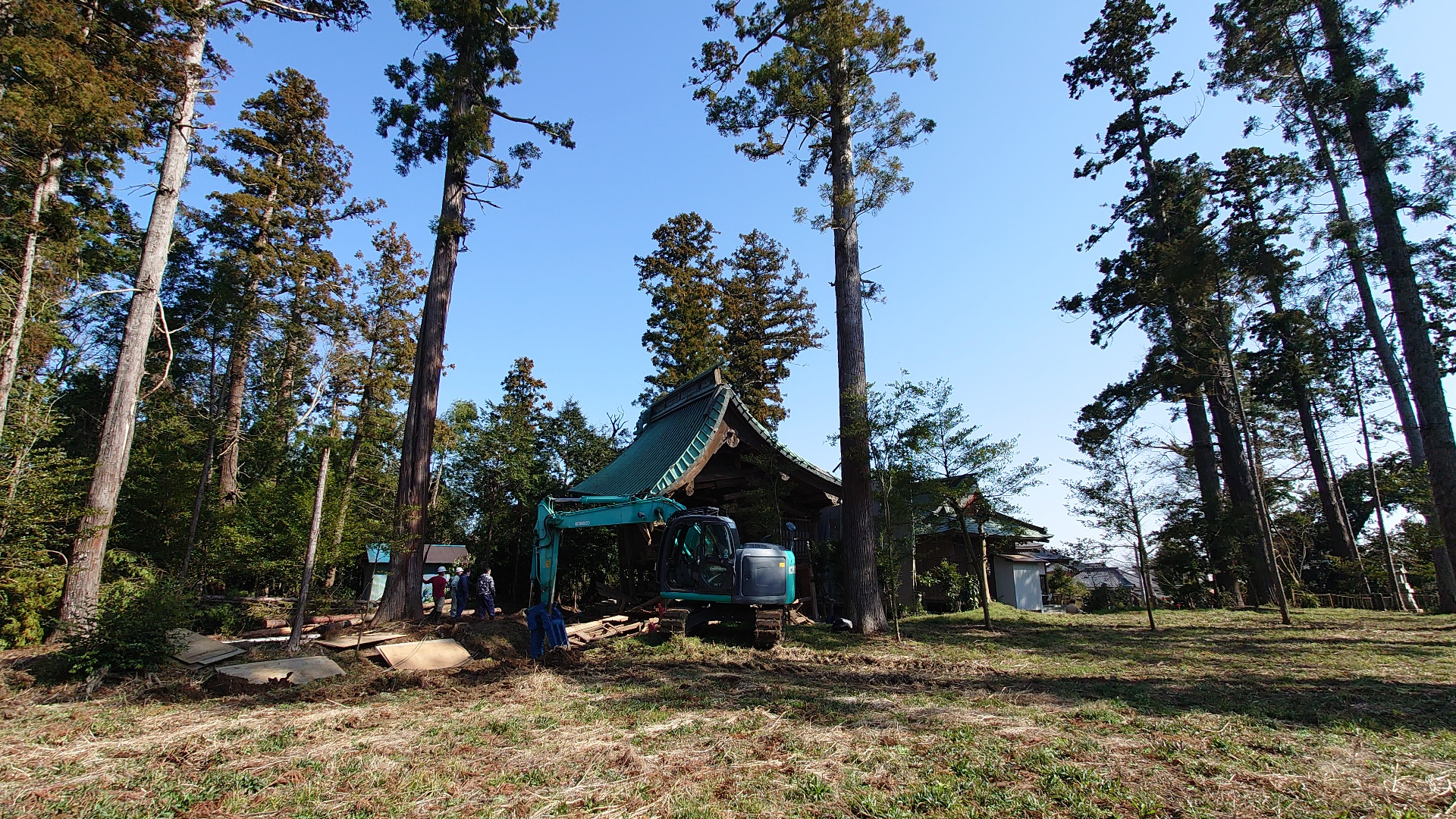 当宮は、江戸末期に火災の被害を受け全焼し 元の山上の鎮座地より、現在地に境内を移し 御本殿を再建しました。 県下でも指折りの規模の御本殿でございましたが、すぐの修繕の目処が立たず、倒壊した場合の周囲への安全を第一に考え、断腸の思いで解体致しました。尚、御神体は解体前に遷座祭(御神体を遷す神事)を行い、現拝殿内に仮祀りしております。