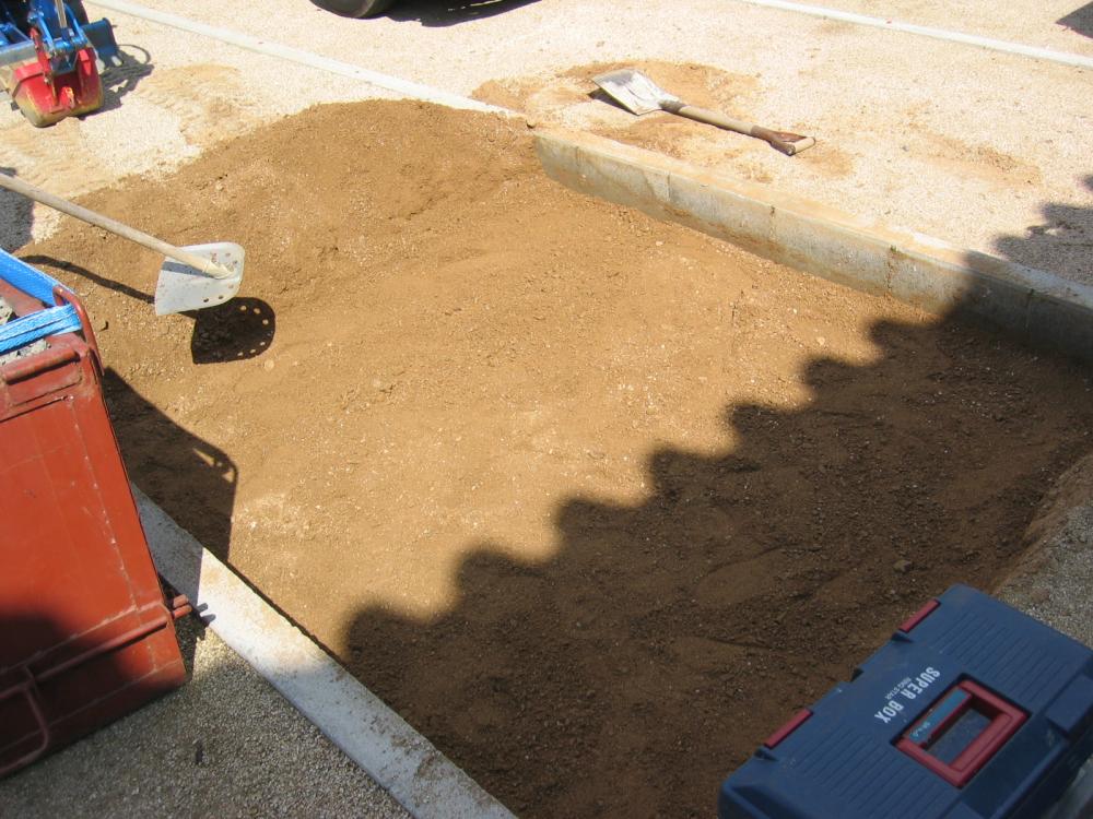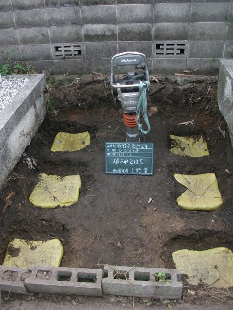 D-box(黄色い袋に特殊な砂を入れたもの)を埋め点圧していきます 。(こちらの基礎工事は別途費用がかかります)