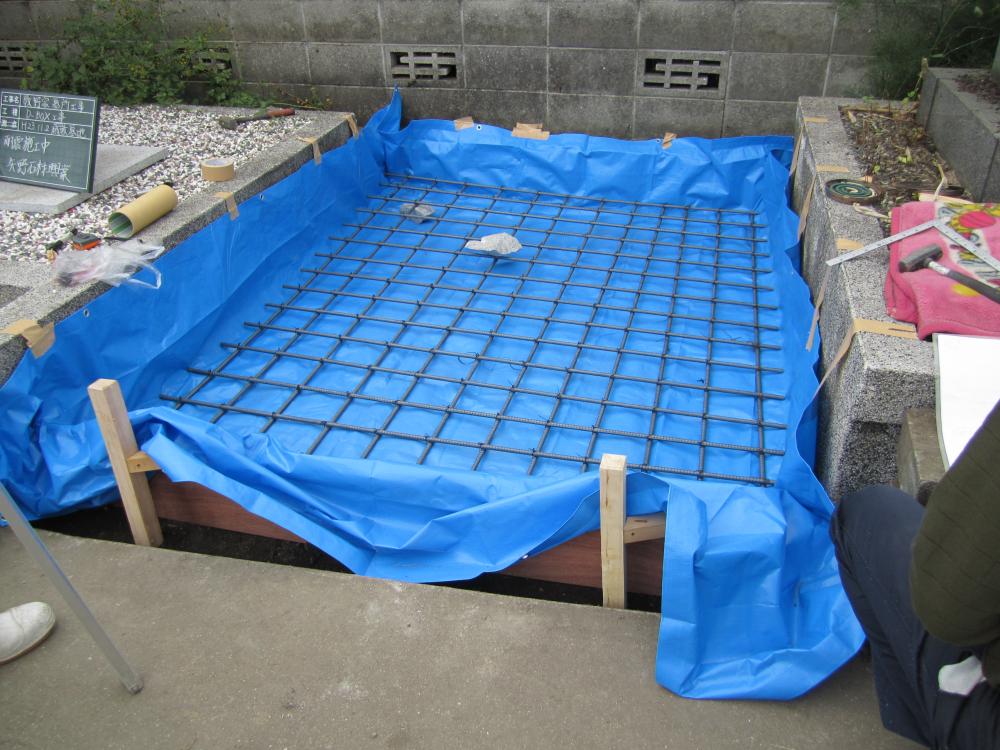 鉄筋を15cmピッチで編みこみます ブルーシートは下のD-boxとコンクリートが固まらない様にする為敷き詰めます。(免震力低下するため) 。(こちらの基礎工事は別途費用がかかります)