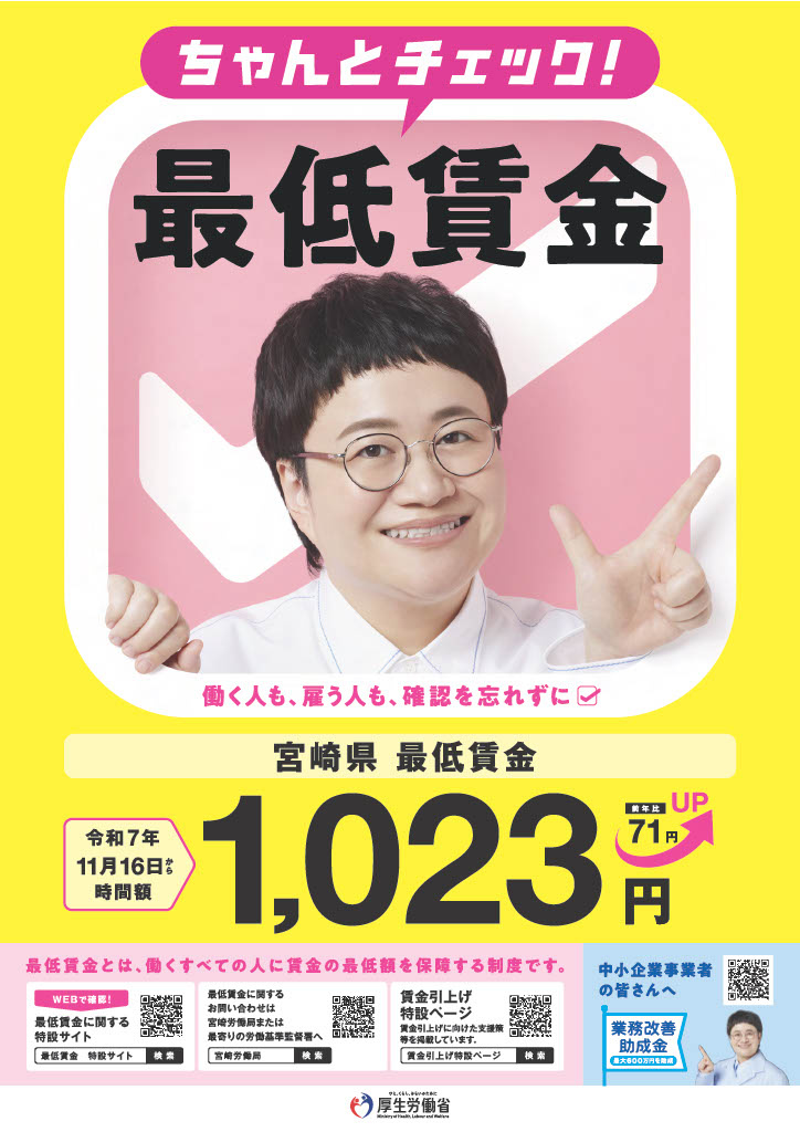 宮崎県の最低賃金が令和7年11月16日から1,023円(前年比71円UP)に改正されます。