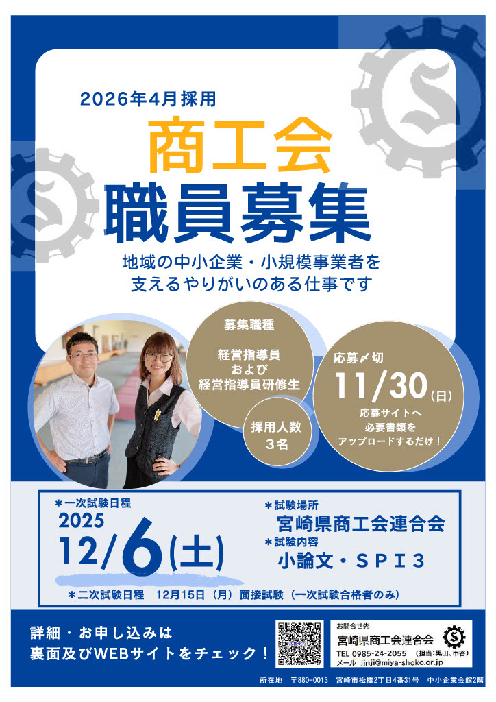 宮崎県商工会連合会(県内の商工会を含む)では、令和8年4月1日採用の職員を募集しています。