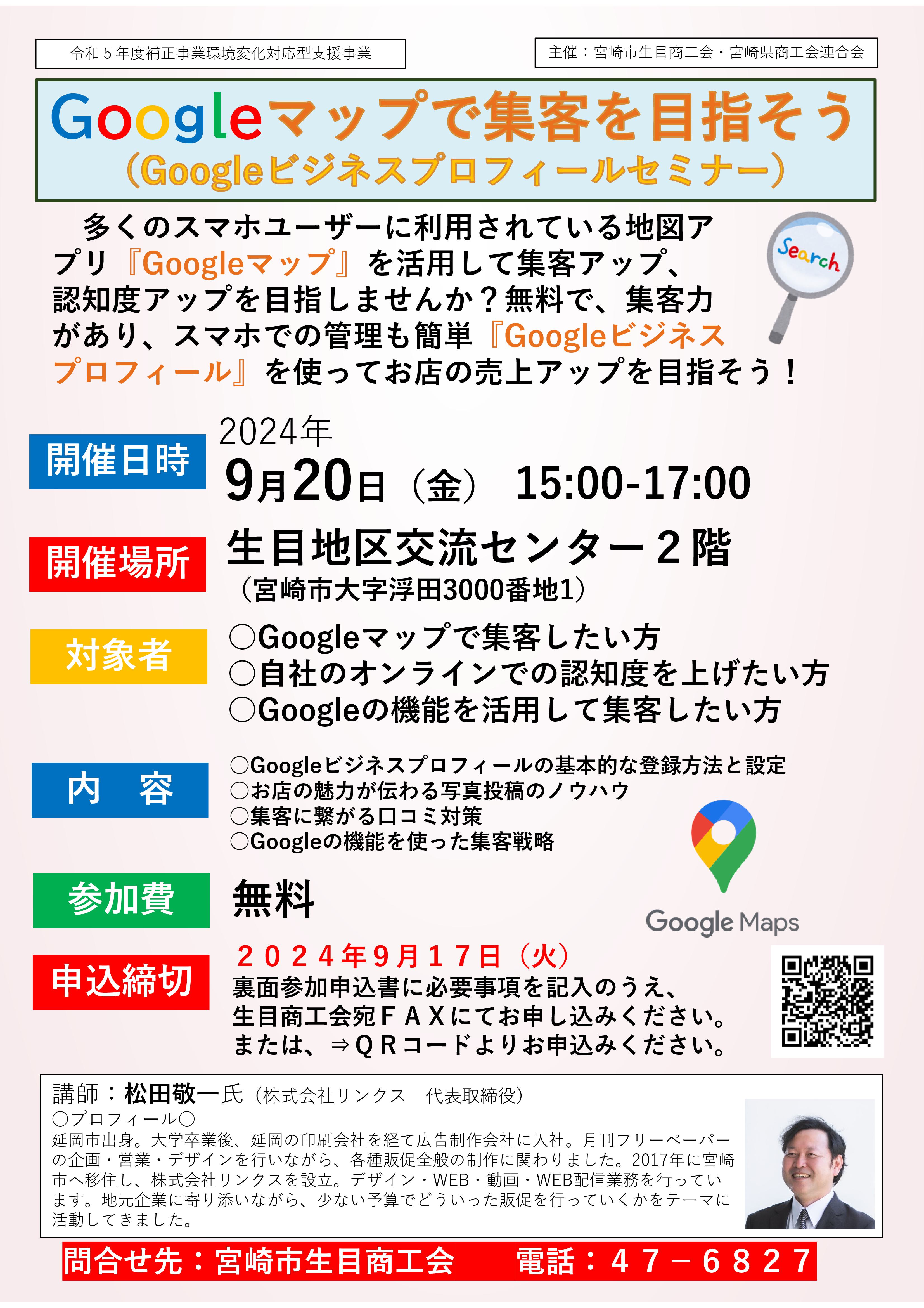 宮崎市生目商工会では、「Googleビジネスプロフィール」の概要や活用方法に関するセミナーを開催します。奮ってご参加ください。