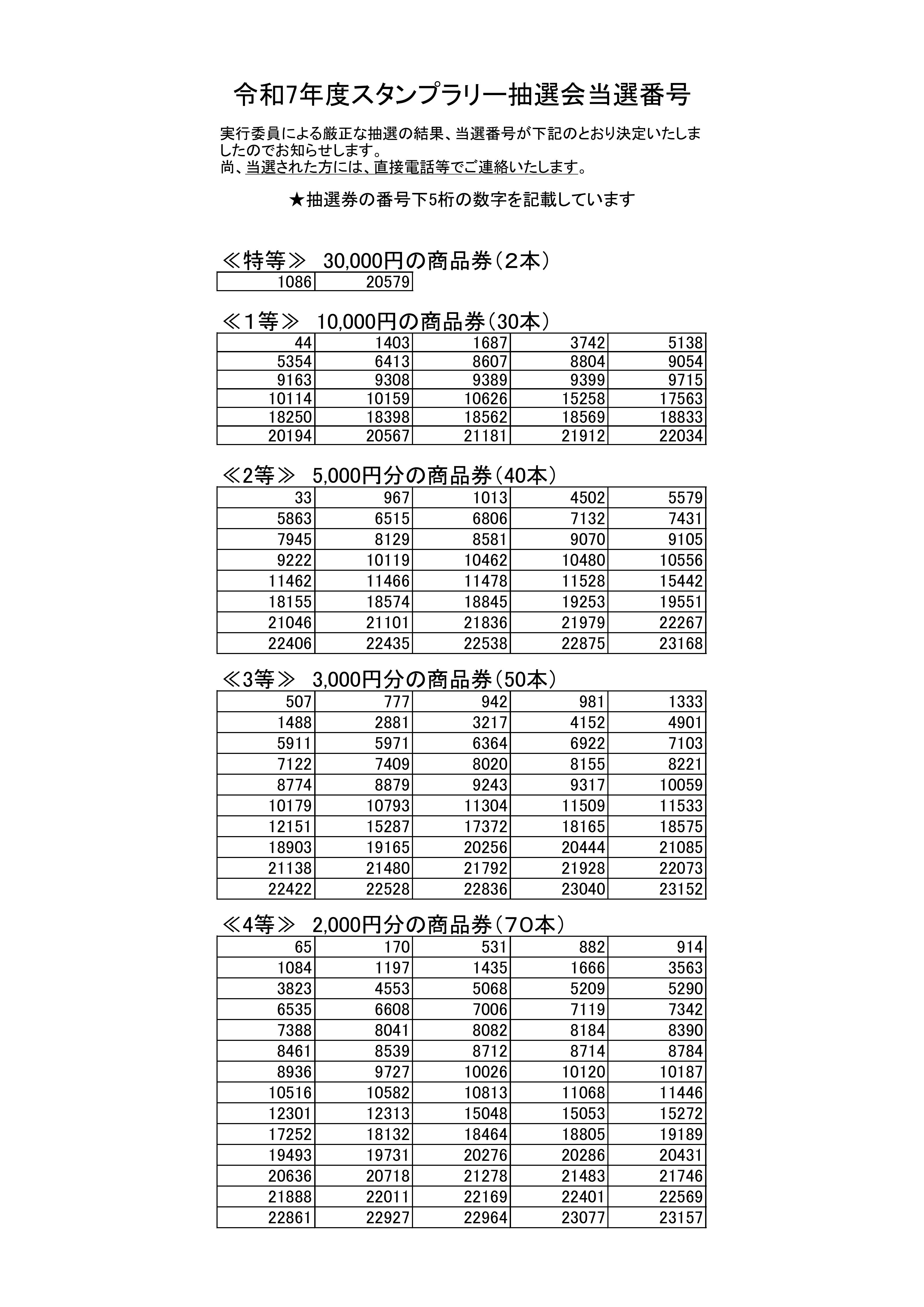 今年8月に実施しました”令和7年度 高城・山之口合同スタンプラリー事業”の当選番号(抽選券下五桁)は下記の通りです。