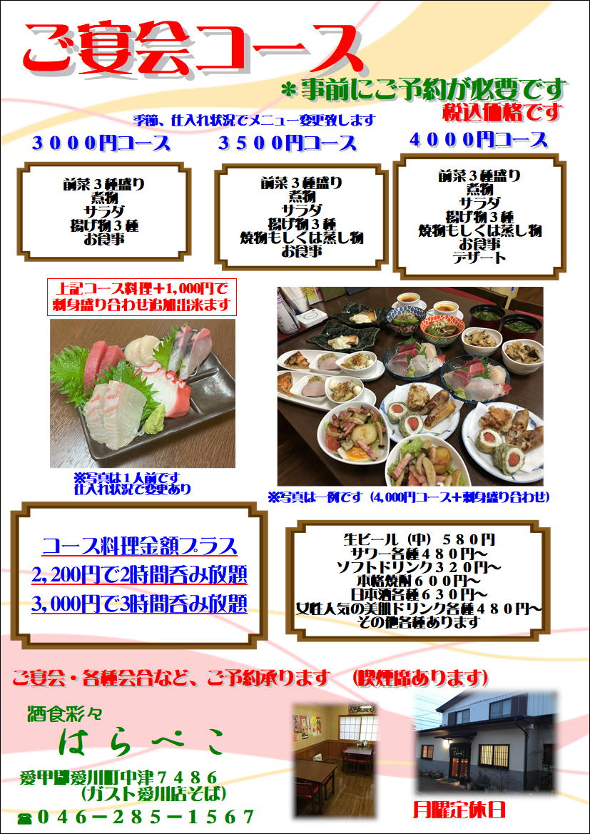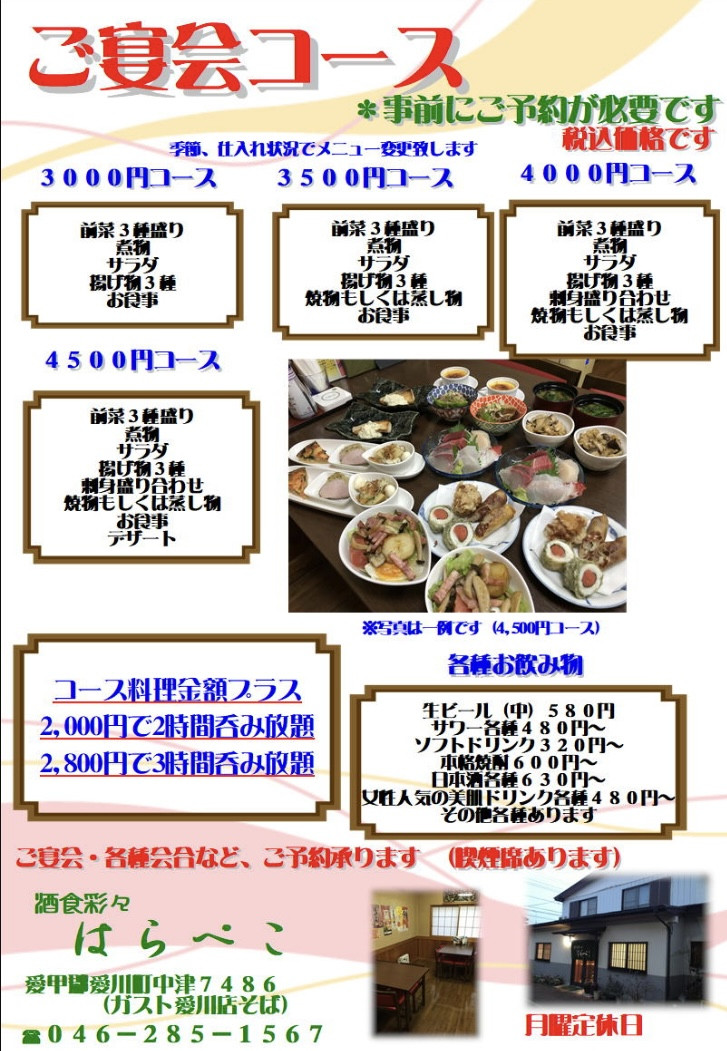 [酒食彩々はらぺこ] ご宴会コースの変更および価格改定
