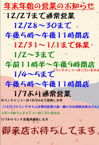 12/27まで通常営業(27日ランチ営業は貸切のため一般営業はありません)12/28〜30まで午後5時〜午後11時閉店12/31、1/1休業1/2〜3まで午前11時30分〜午後9時閉店1/4〜5...