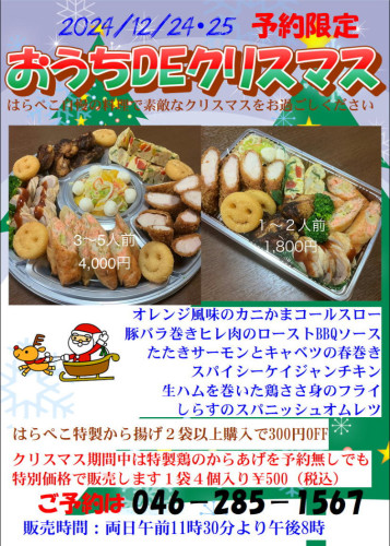 昨年好評のクリスマスオードブルを今年もご用意しました。新たに人気の鶏のから揚げ3種盛りも追加是非ご検討宜しくお願い致します。はらぺこの料理で素敵なクリスマス...