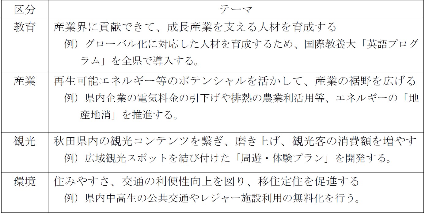 ・次の表に示す4つのテーマについて、「明るい秋田」を実現するための「夢のある」企画を公募します。