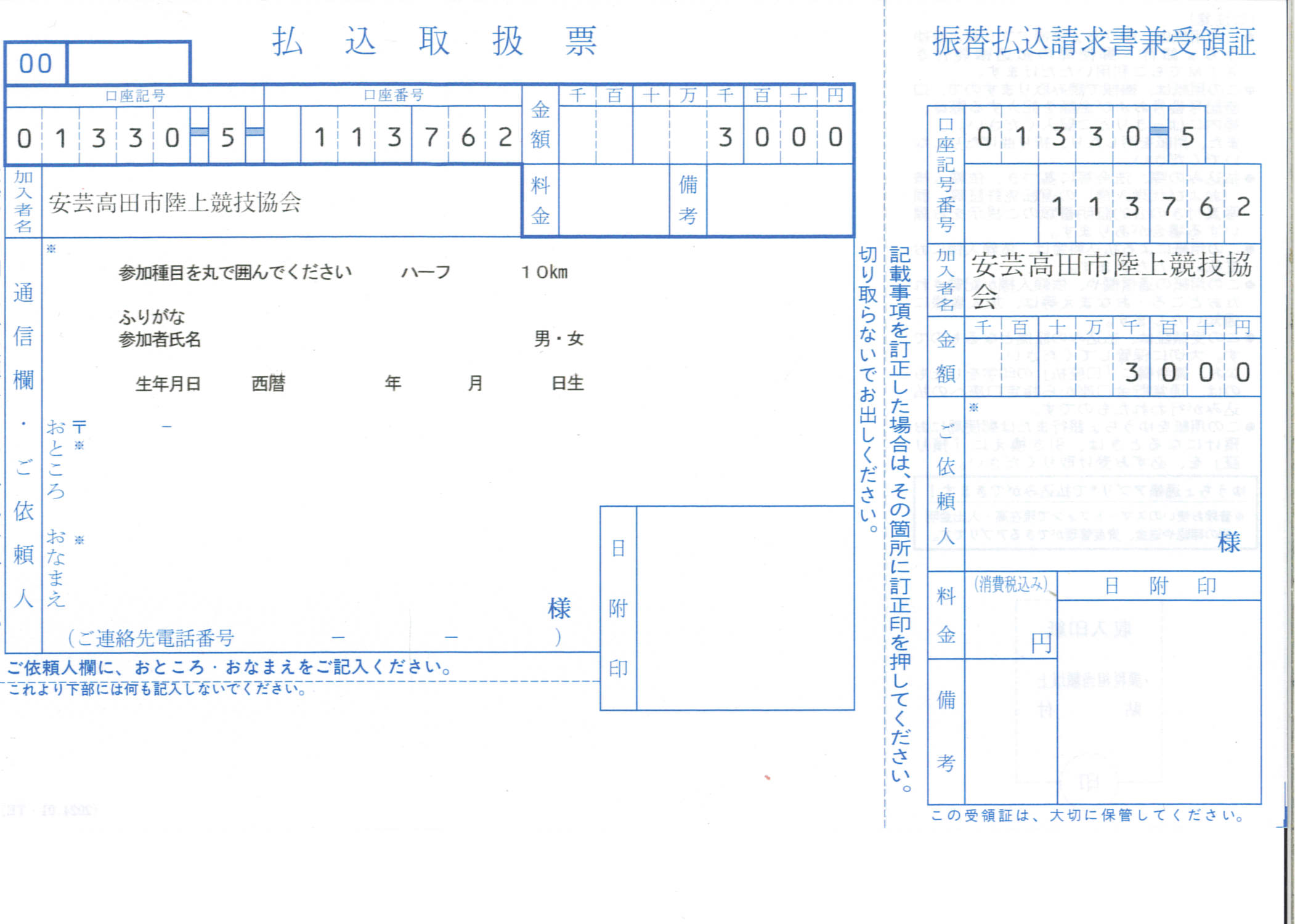 大会要項・参加申込書(郵便振替用紙)をご希望される方で、郵送をご希望される方は、このホームページ内にある「お問い合わせ」からか、安芸高田市陸上競技協会事務局 akitakatariku@outlook.jp までご連絡ください。(郵便番号・ご住所・お名前・必要部数を明記してください)