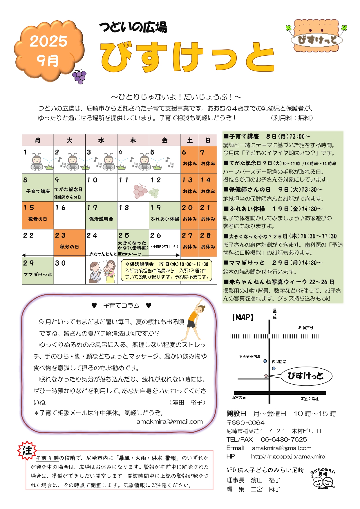 NPO法人子どものみらい尼崎が運営する、南部の広場(びすけっと・まかろん)からのお知らせです。