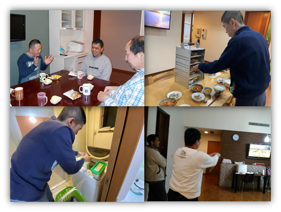 バックアップ施設(パスピ・98)の献立に沿ってホームごとに作っています。配膳などは利用者様にもお手伝いいただいています。