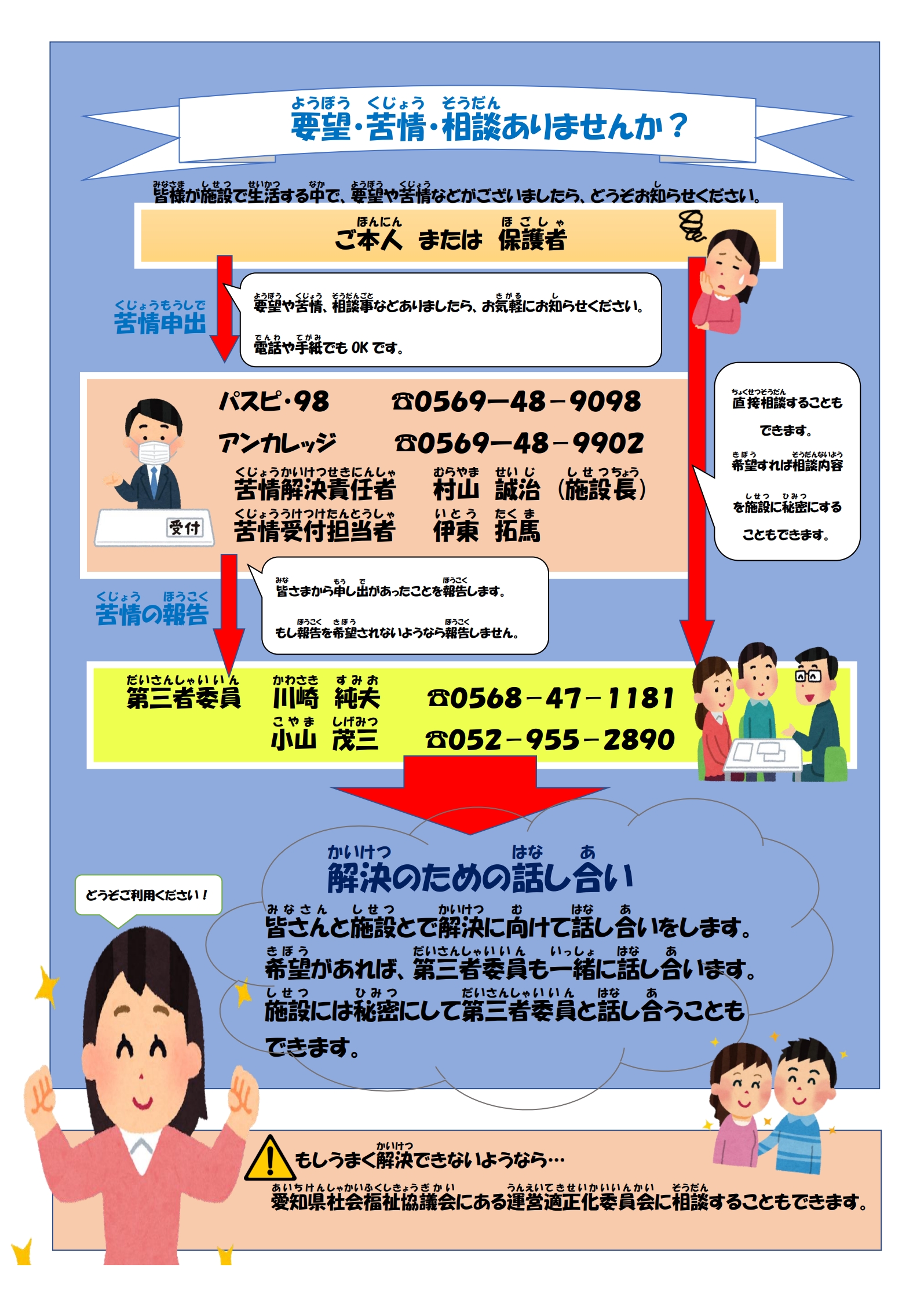 社会福祉法に基づき、利用者様が安心して適切な福祉サービスを利用し、そのサービスに納得、満足できるよう、福祉サービス事業所および客観性が確保できる第三者(第三者委員)により適切に苦情を解決するための制度です。ご本人または保護者様がサービス内容に不満や要望がある場合、ご利用頂けます。