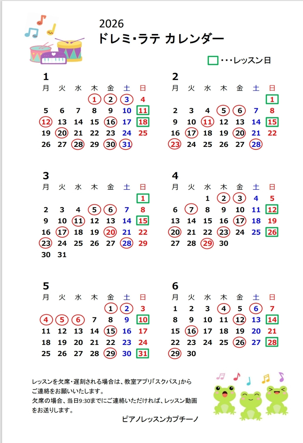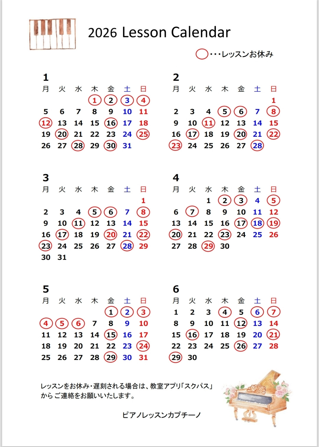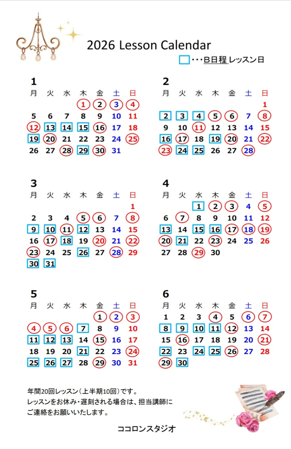 レッスンカレンダー2026