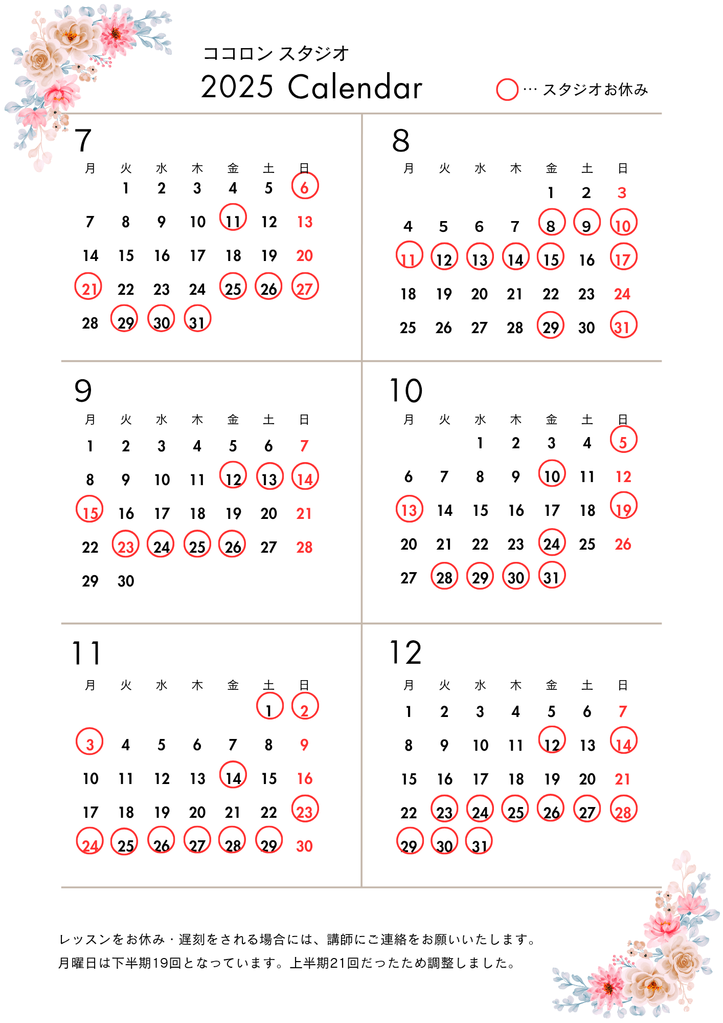 - キャンセル規定:日曜・祝日・○の日は2日前まで無料、前日50%、当日100%のキャンセル料が発生いたします。ご連絡をお願いいたします。