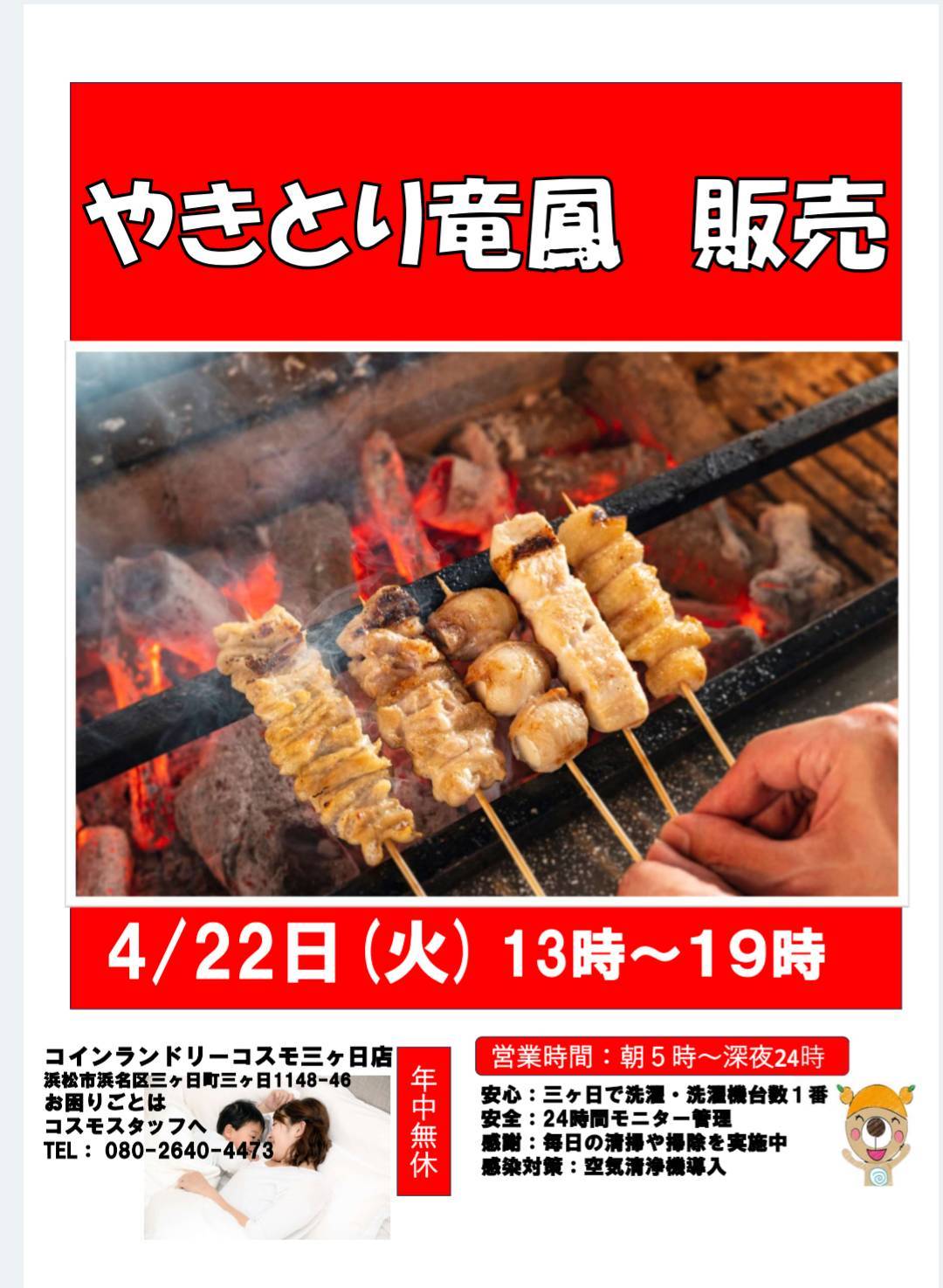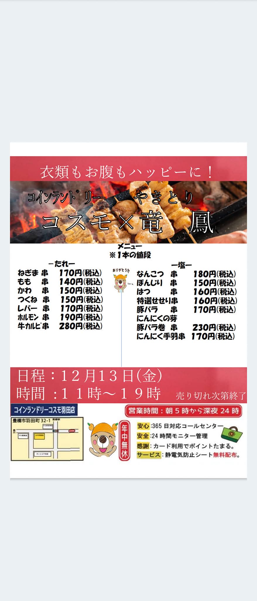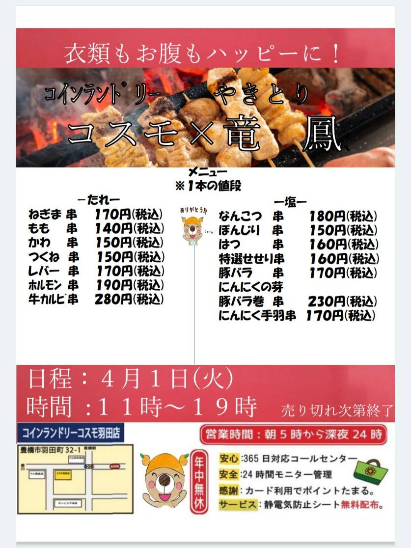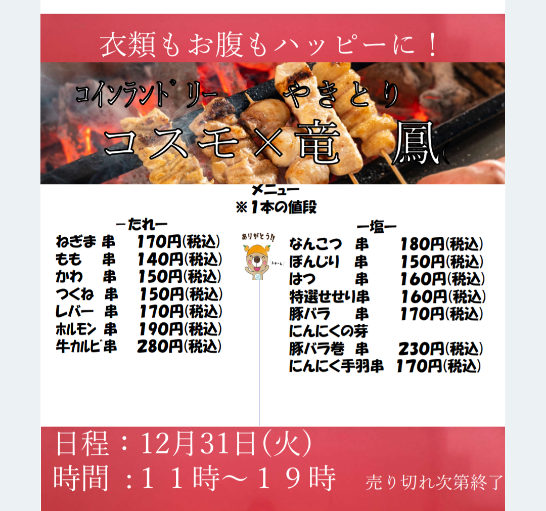 『その場で焼く!美味しい焼き鳥』の竜鳳さんの焼き鳥屋が12月13日金曜日にコインランドリーコスモ羽田店に!!出来立ての焼き鳥を衣類もお腹もハッピーに!