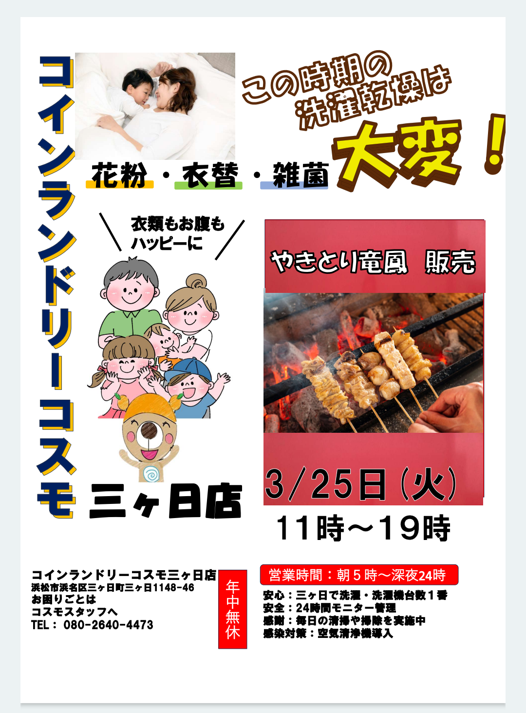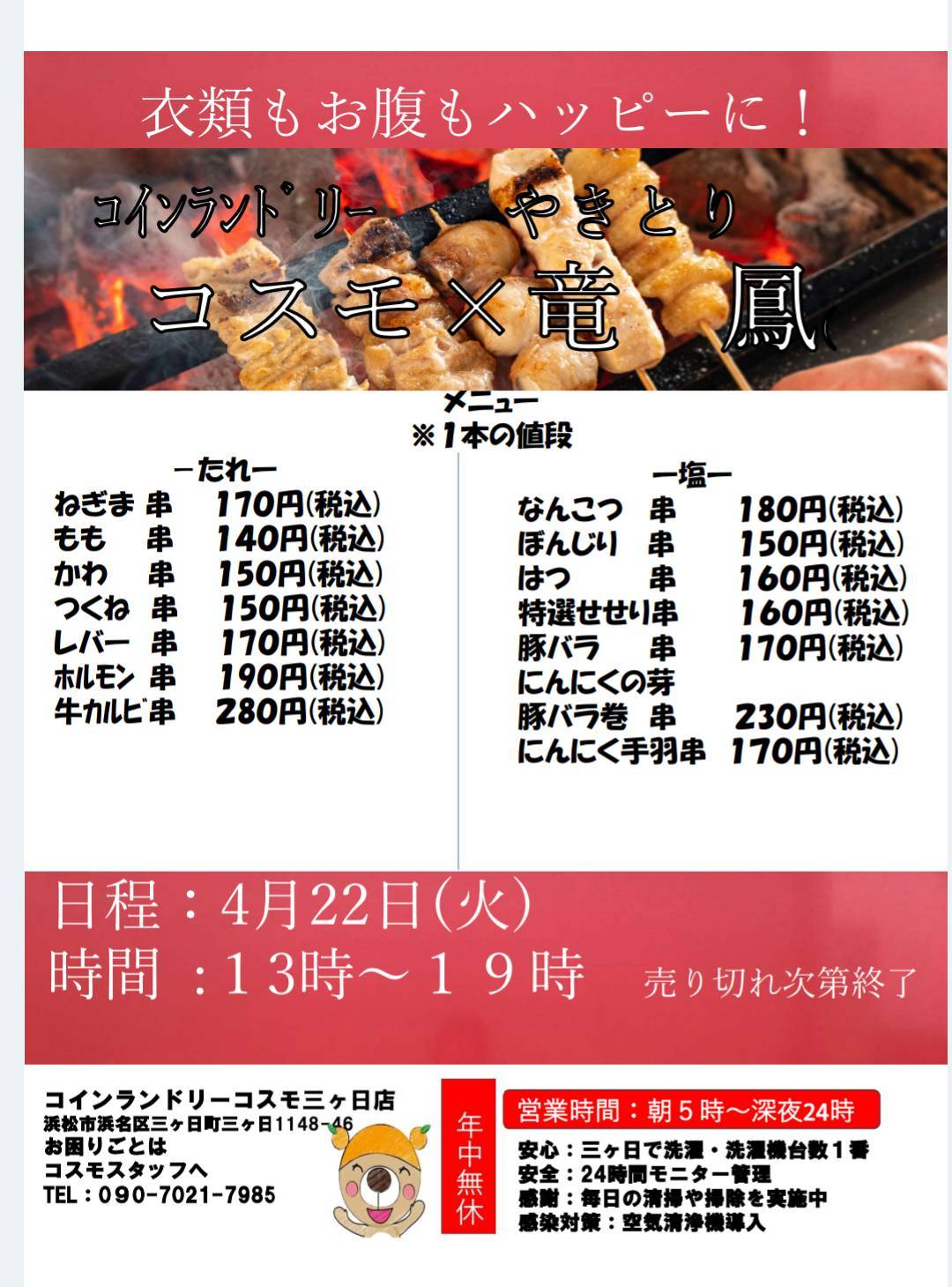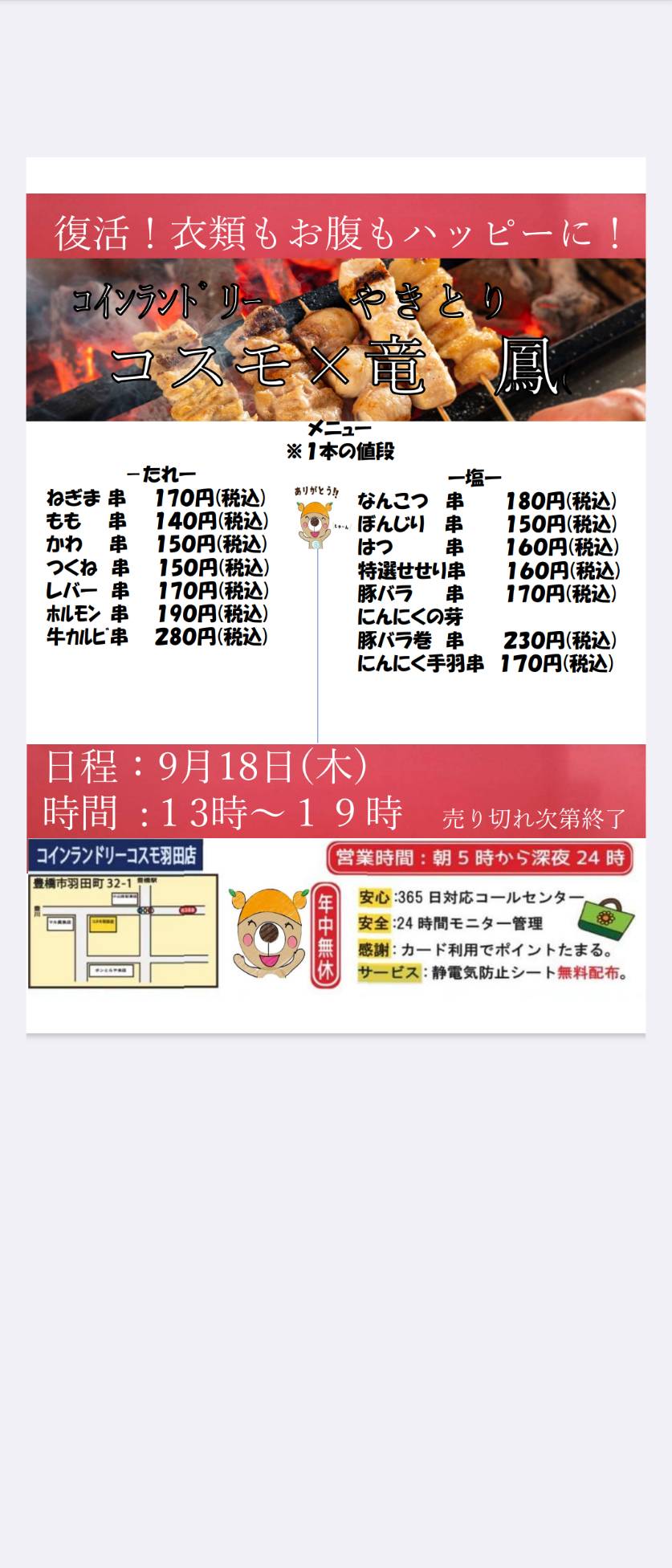 『その場で焼く!美味しい焼き鳥』の竜鳳さんの焼き鳥屋が12月13日金曜日にコインランドリーコスモ羽田店に!!出来立ての焼き鳥を衣類もお腹もハッピーに!