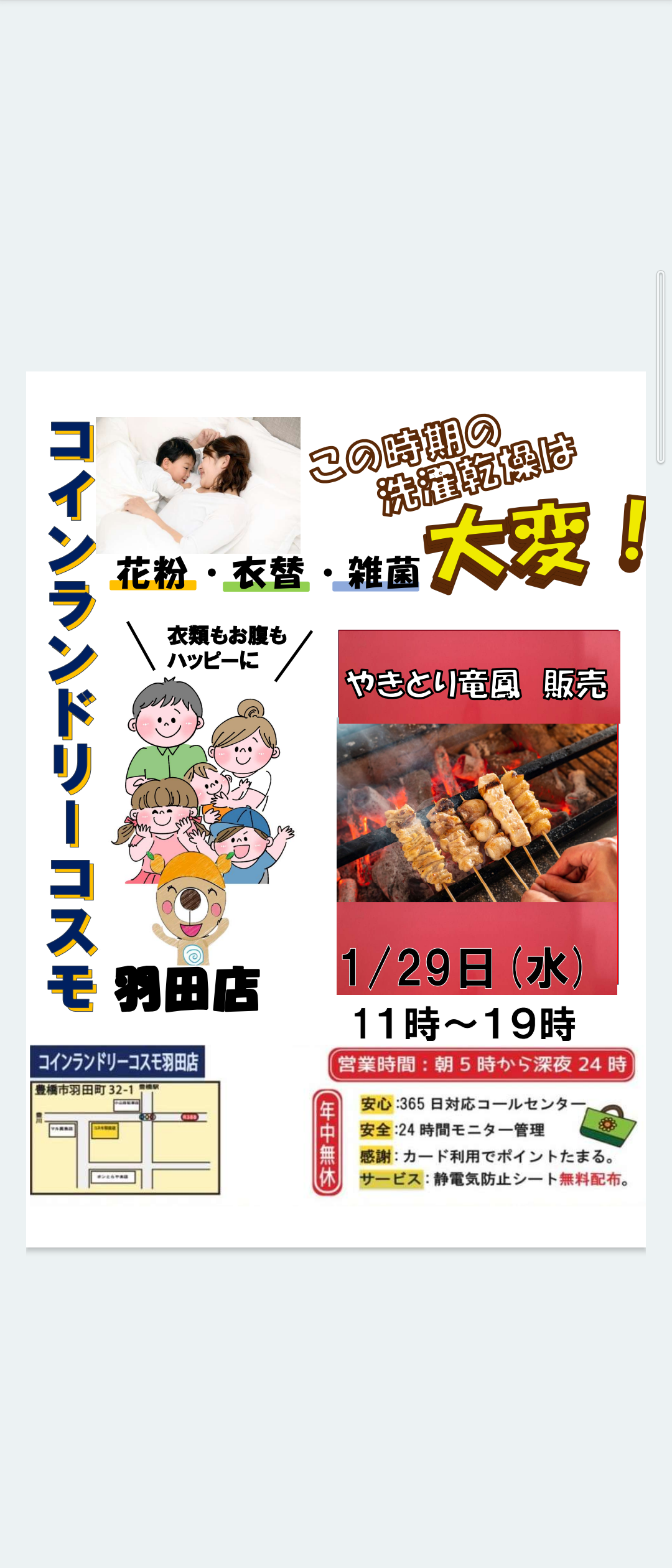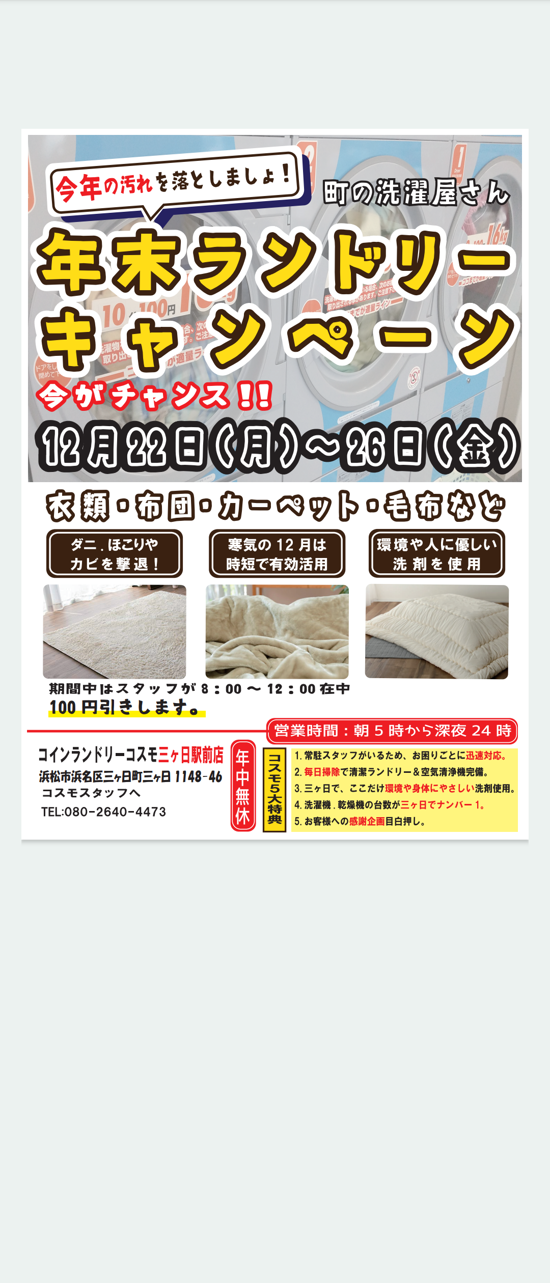 コスモです!年末キャンペーン開催!もう年末ですね!寒いと衣類は乾かない!乾かないということは、匂いの原因菌モラクセラ菌が大量繁殖!さらに花粉!そんな時にはランドリー!ガス乾燥機の完全乾燥!洗濯機もマイクロバブル水と肌に優しい洗剤使用!今、布団がベスト!コインランドリーコスモ!衣類も心もハッピーに!