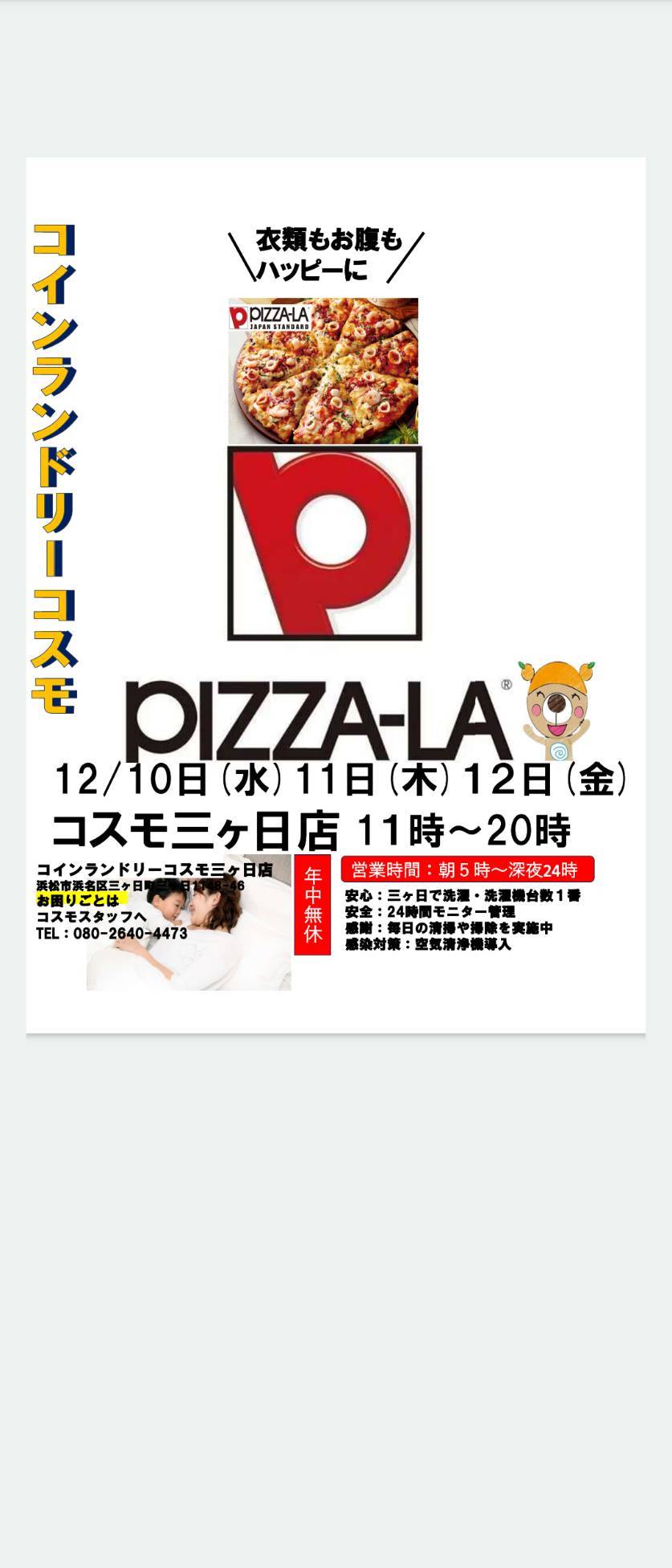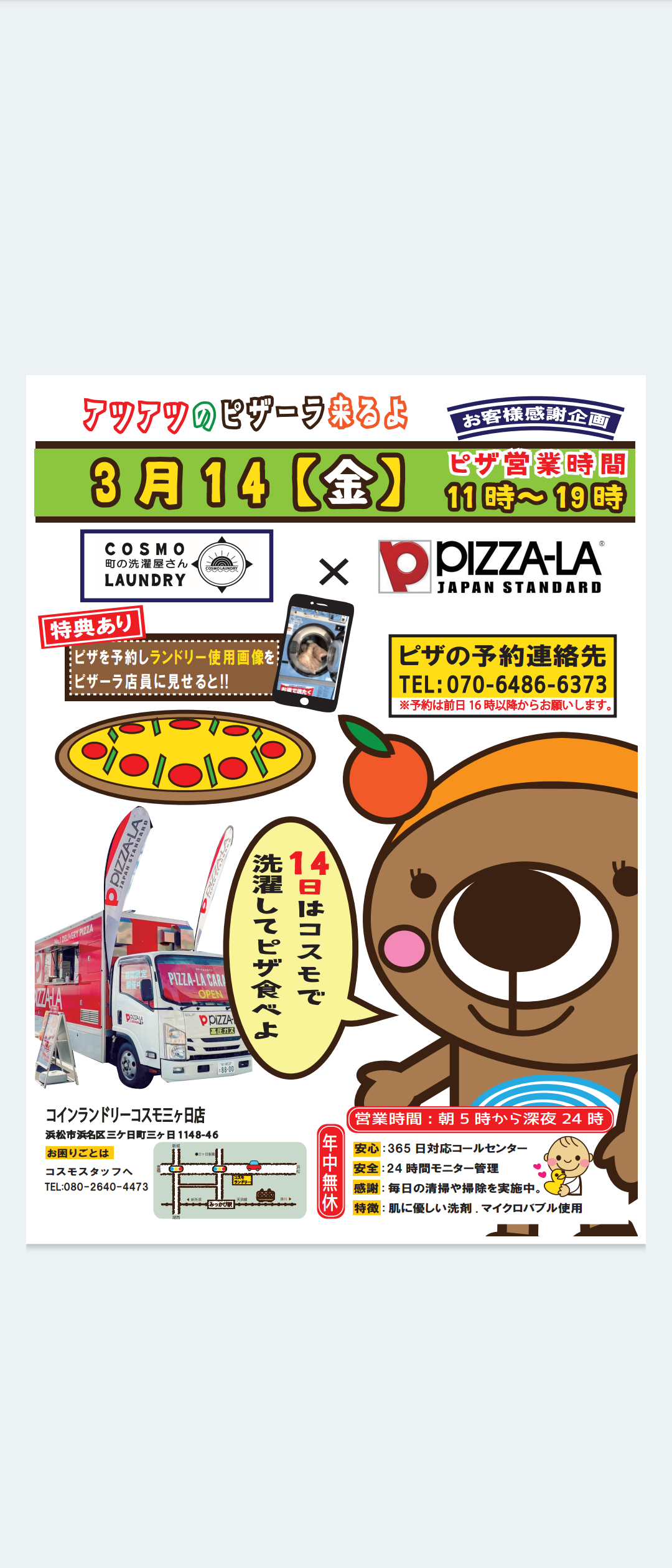 ◯コスモ三ヶ日店3月14日あのアツアツ出来立て『ピザーラ』が来る!ホワイトデーに好きなあの子とピザーラ!家族でピザーラ!予約時コインランドリーコスモを使用したことを告げると特典あり!※購入時使用画像提示