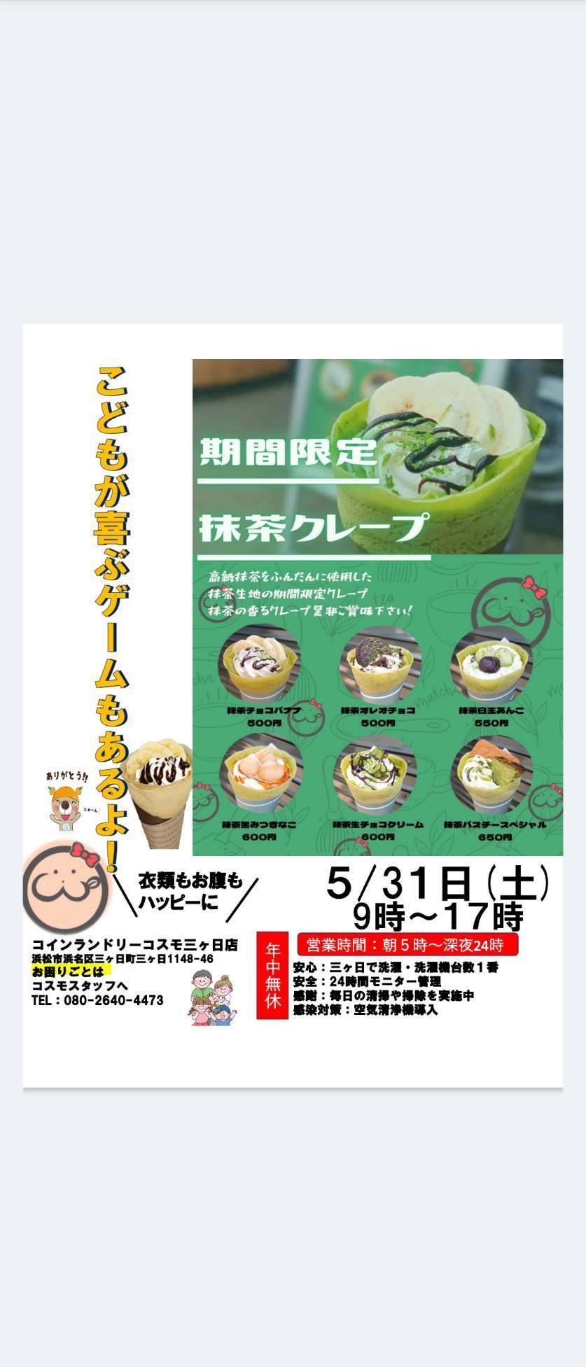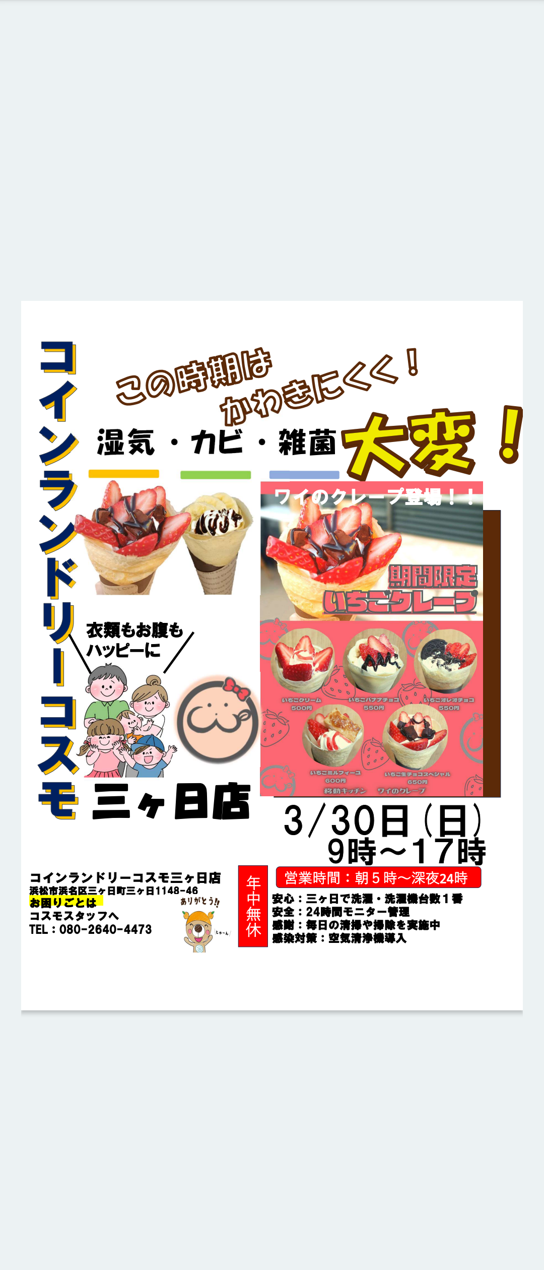 1月31日土曜日コインランドリーコスモ三ヶ日店にあのワイのクレープさんがやって来ます!今度はいちごだー!