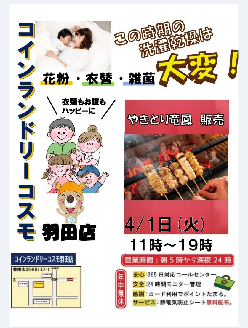 ◯4月1日(火)は豊橋羽田店にあの美味しい焼き鳥屋竜鳳(りゅうほう)さんが出店販売!その場で焼くから美味しい!