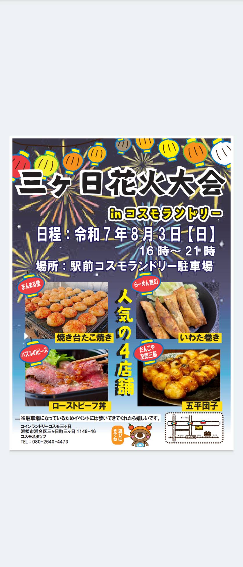 8月3日はコスモイベント!旨いもん喰って花火を観よう!当日は車が混み合う可能性あるので歩いてくるのがベスト!車で来てもスタッフが対応!