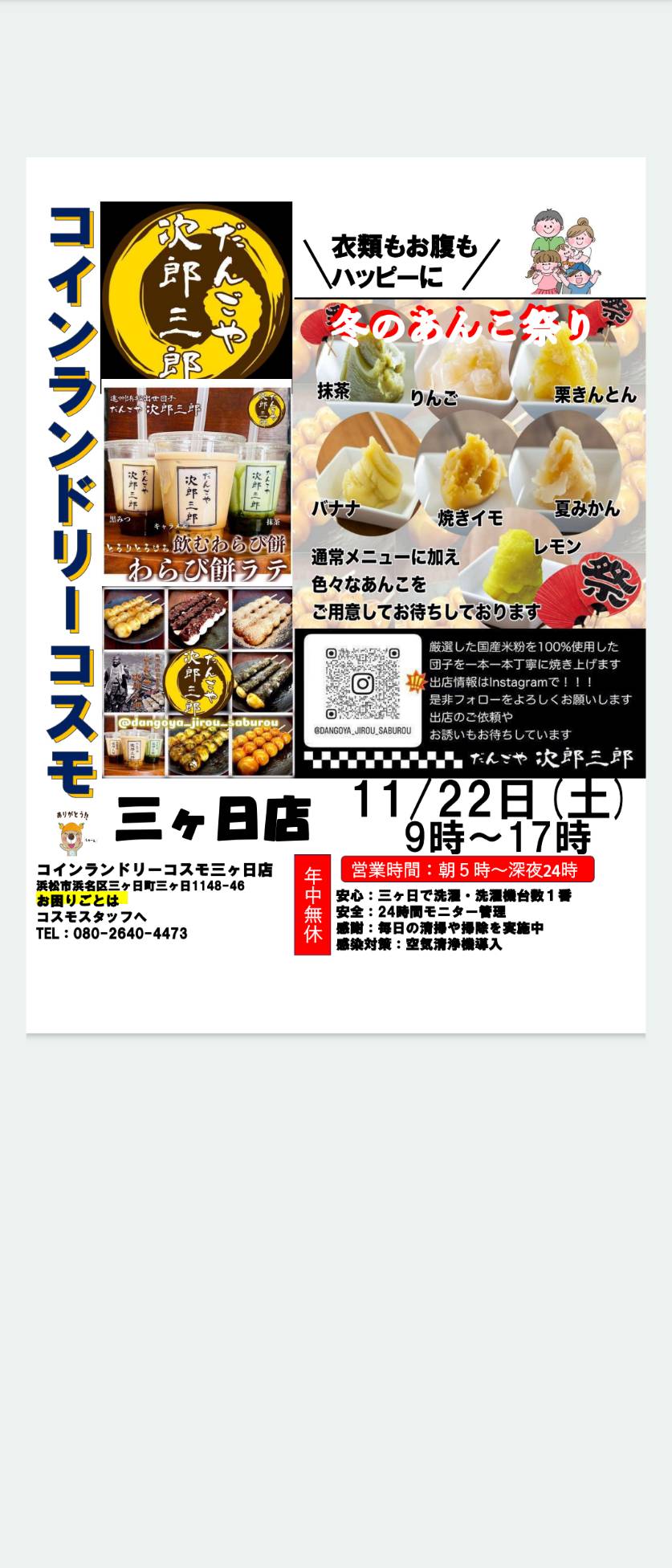 ◯コインランドリーコスモ三ヶ日店、19日(日)美味しい団子屋『だんごや二郎三郎』さん出店!つまり、団子を食べながら三ヶ日文化祭に行こう!